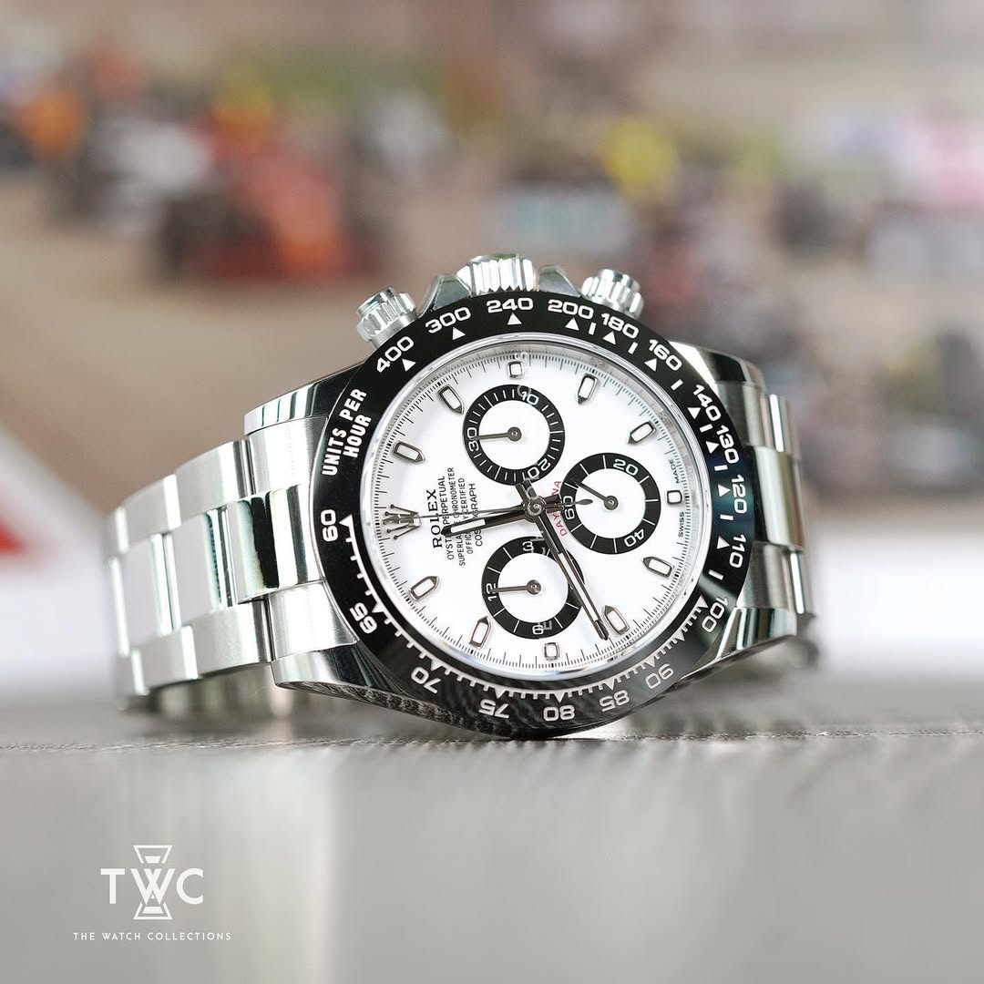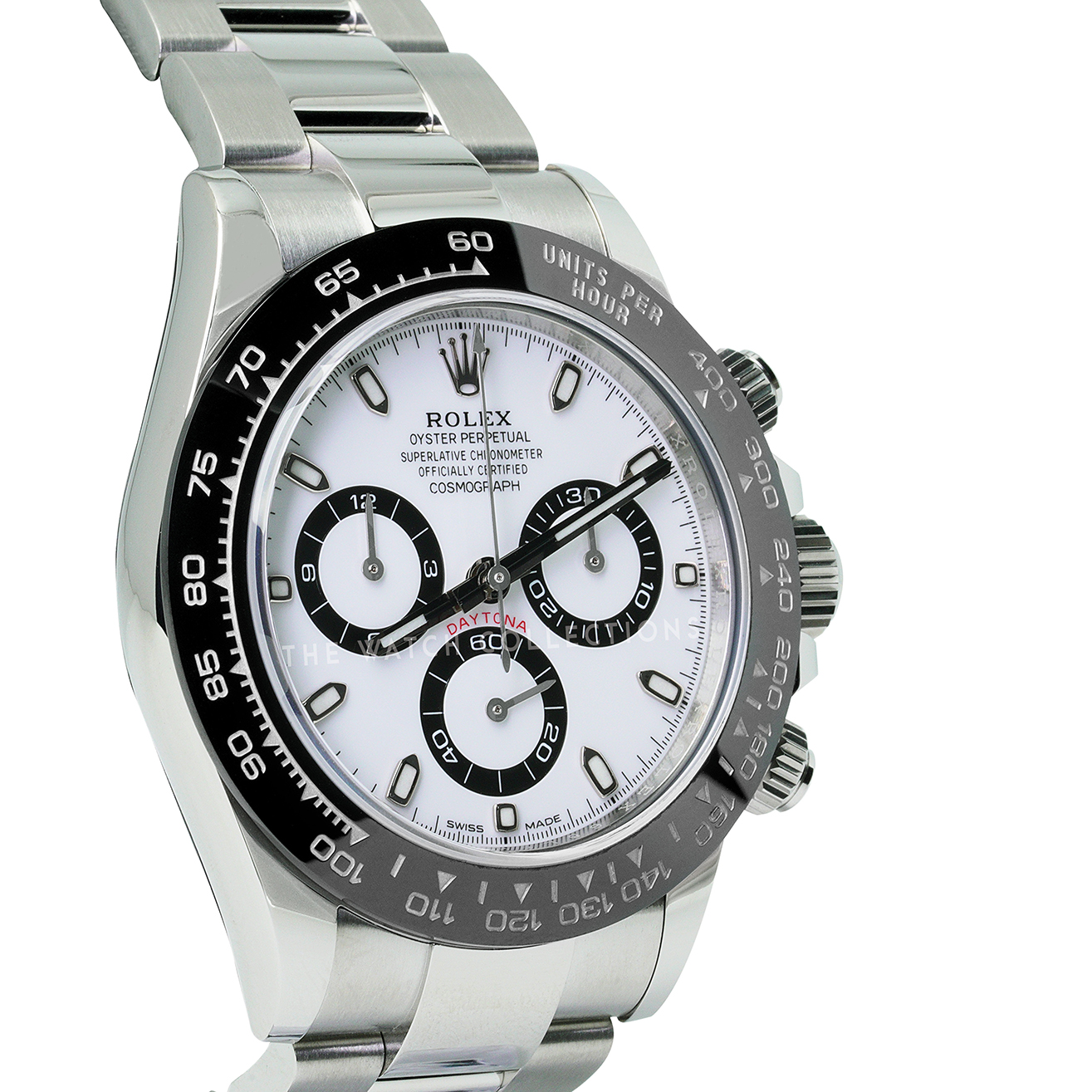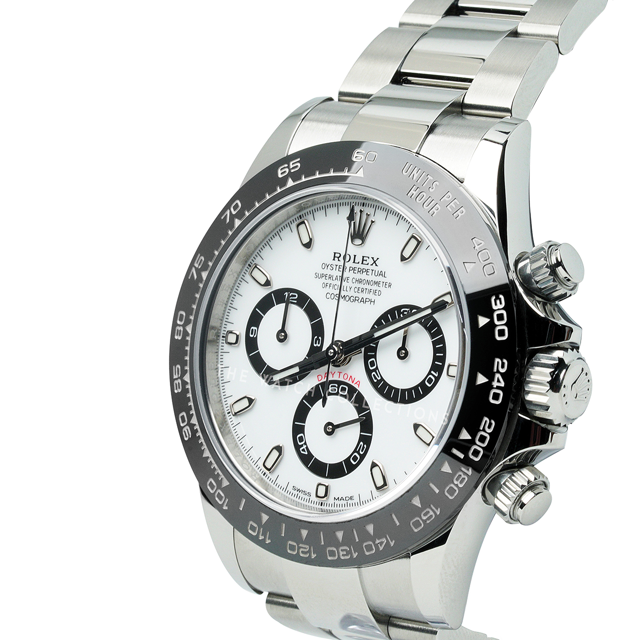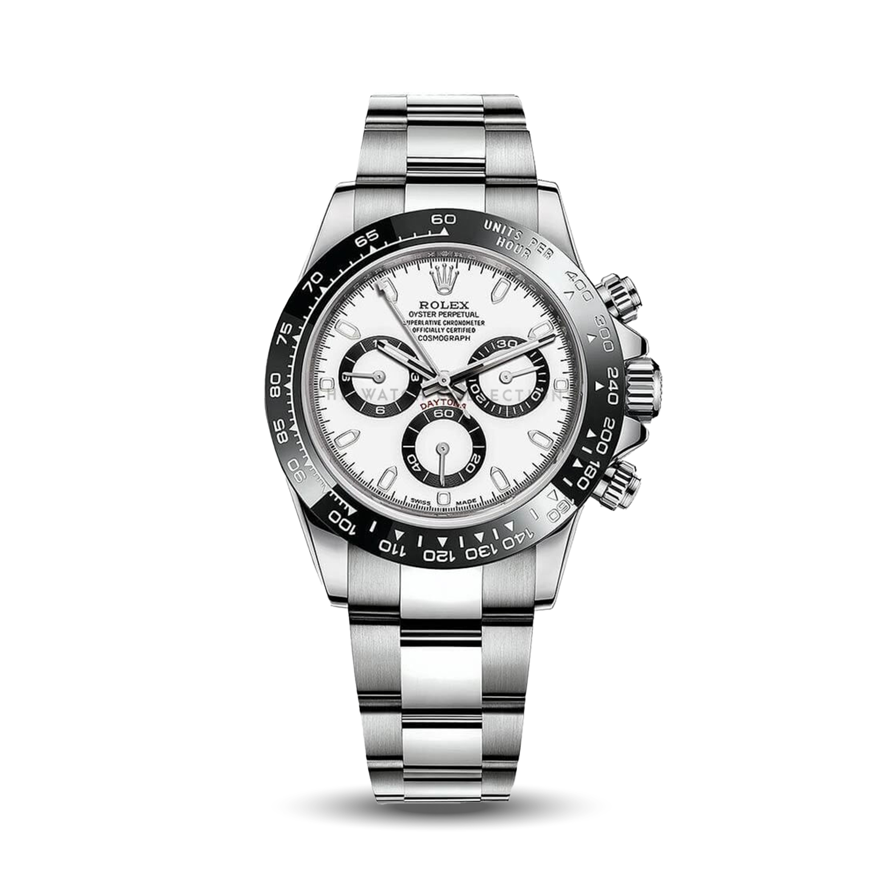 The Rolex Cosmograph Daytona Ref. 116500LN with its iconic white dial offers a perfect balance of sporty aesthetics and high-precision performance. The 40mm Oystersteel case is paired with a scratch-resistant black Cerachrom bezel, creating the signature contrast that makes this one of the most sought-after Daytona references. Designed for motorsport timing, this model embodies the legendary spirit of Rolex’s chronograph in a highly collectible modern form.