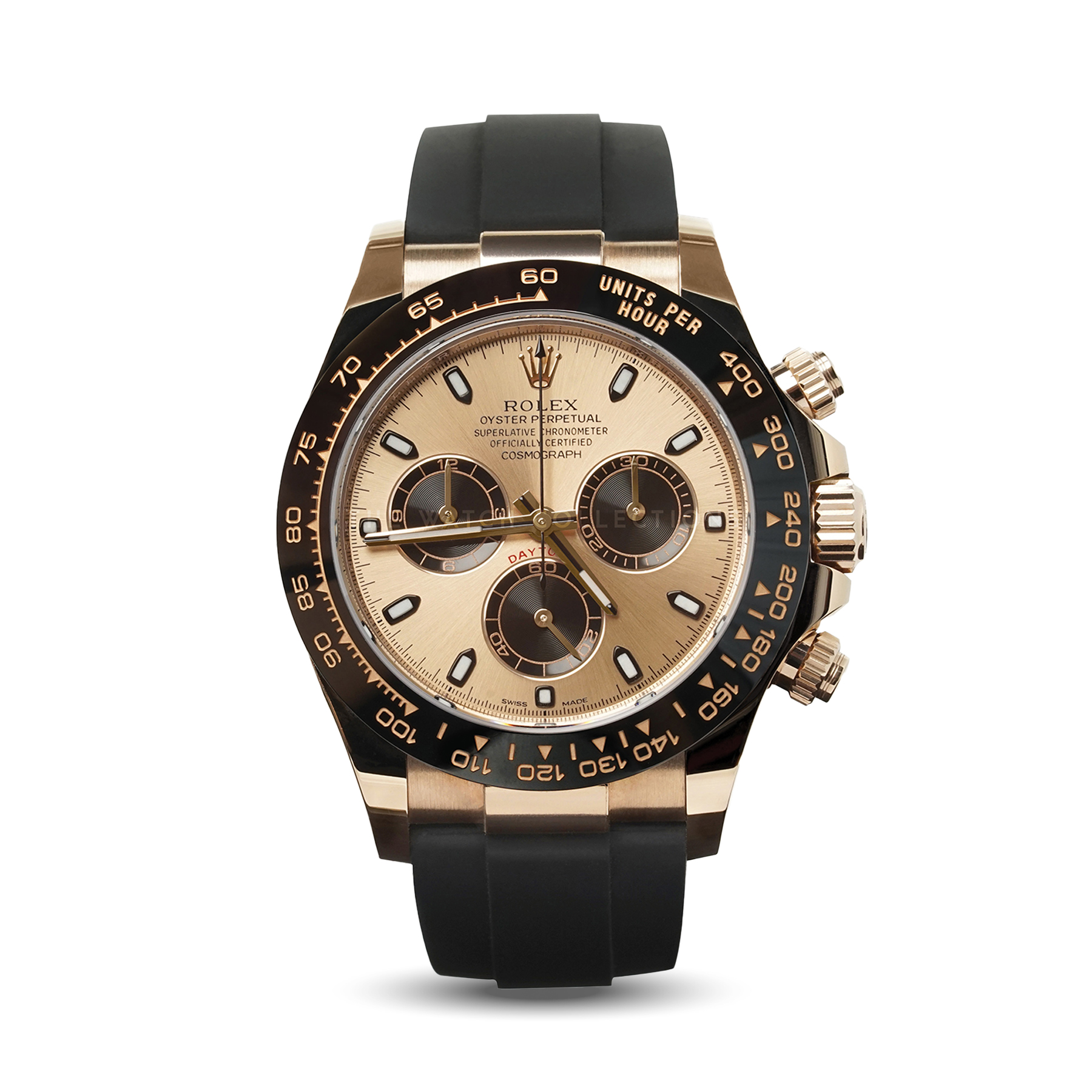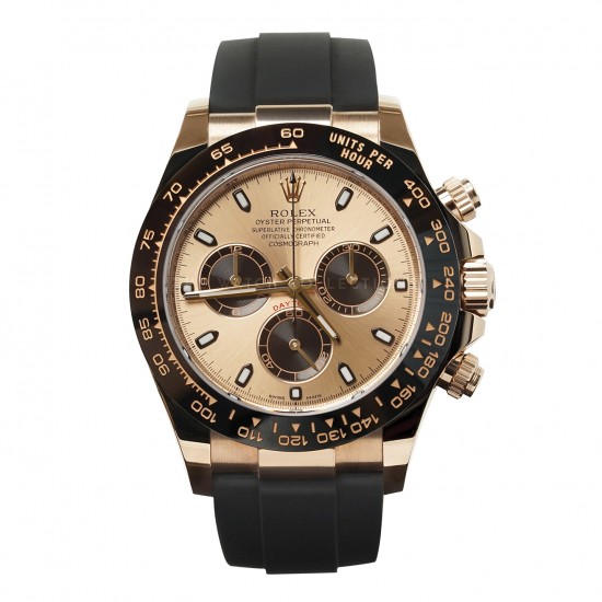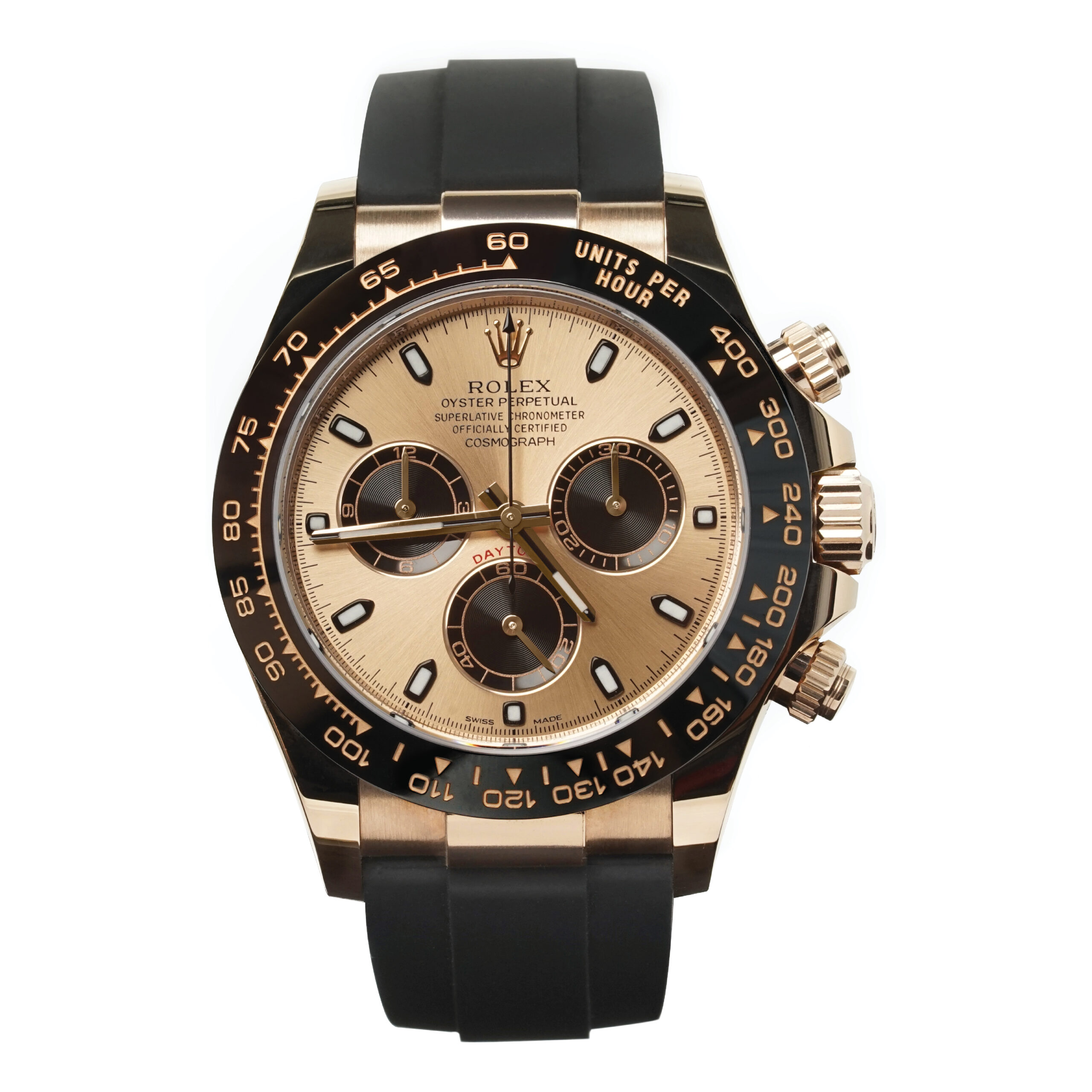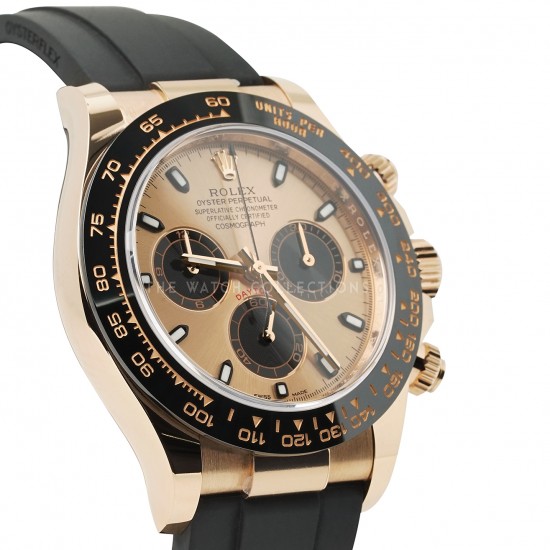 The Rolex Daytona 116515LN features a rose gold case with pink dial and Oysterflex strap. Elegant and sporty.