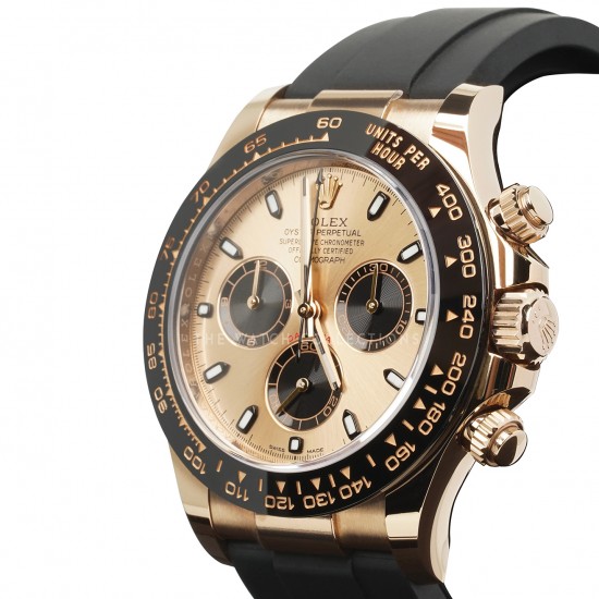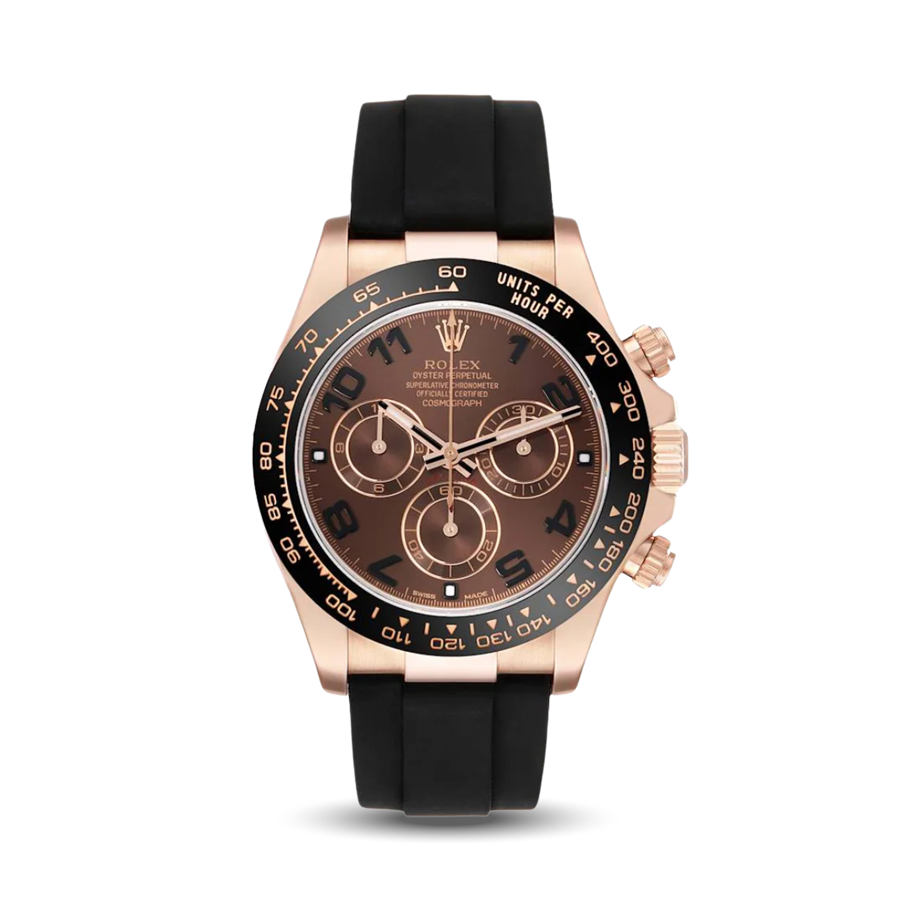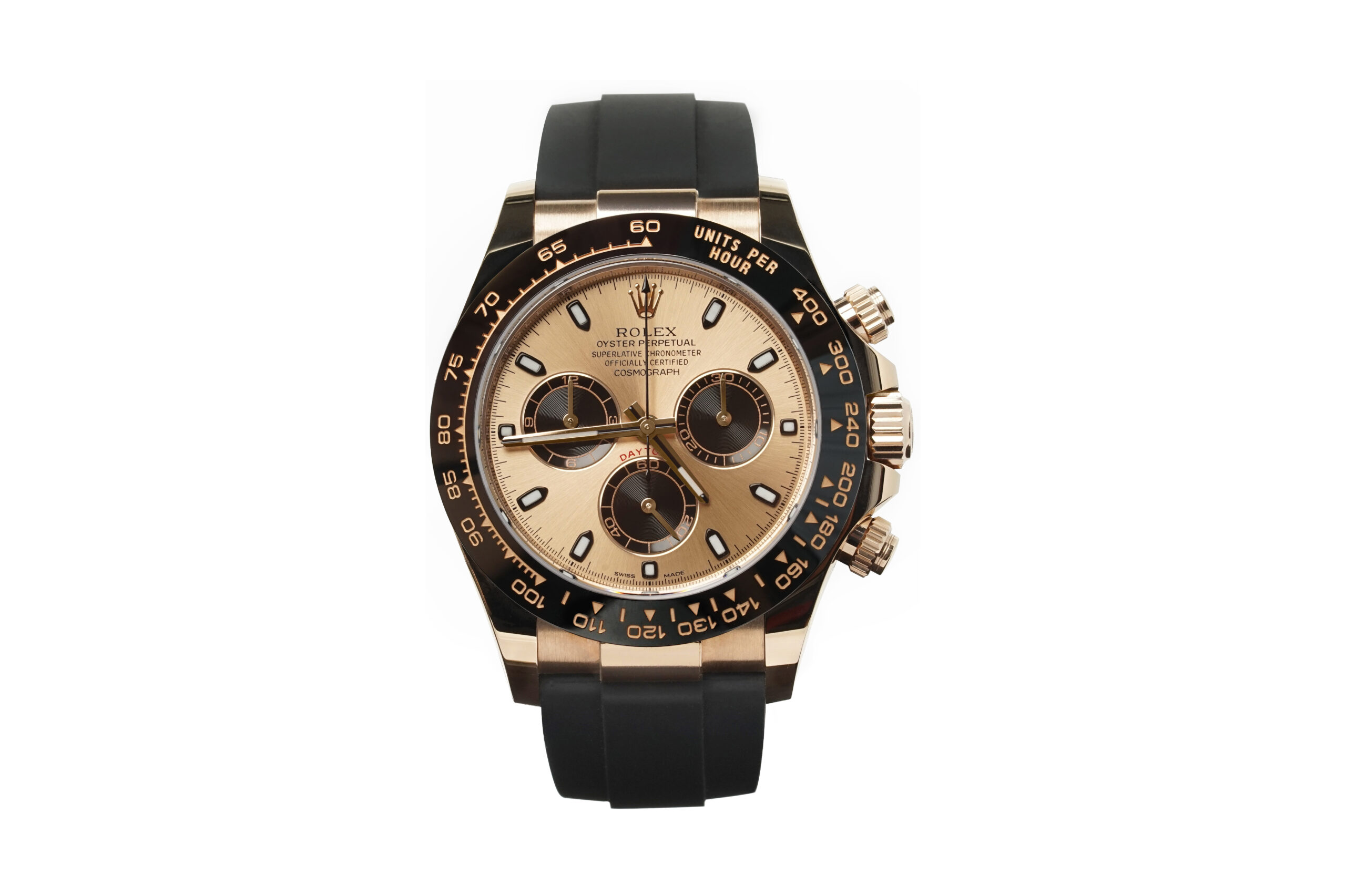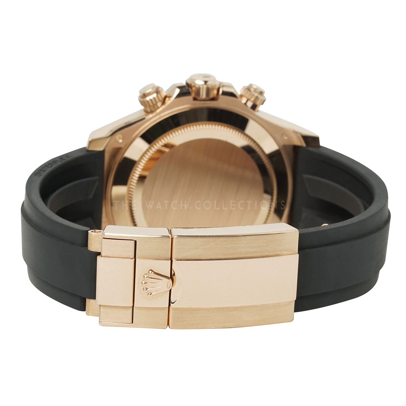 The Rolex Daytona 116515LN features a rose gold case with pink dial and Oysterflex strap. Elegant and sporty.
