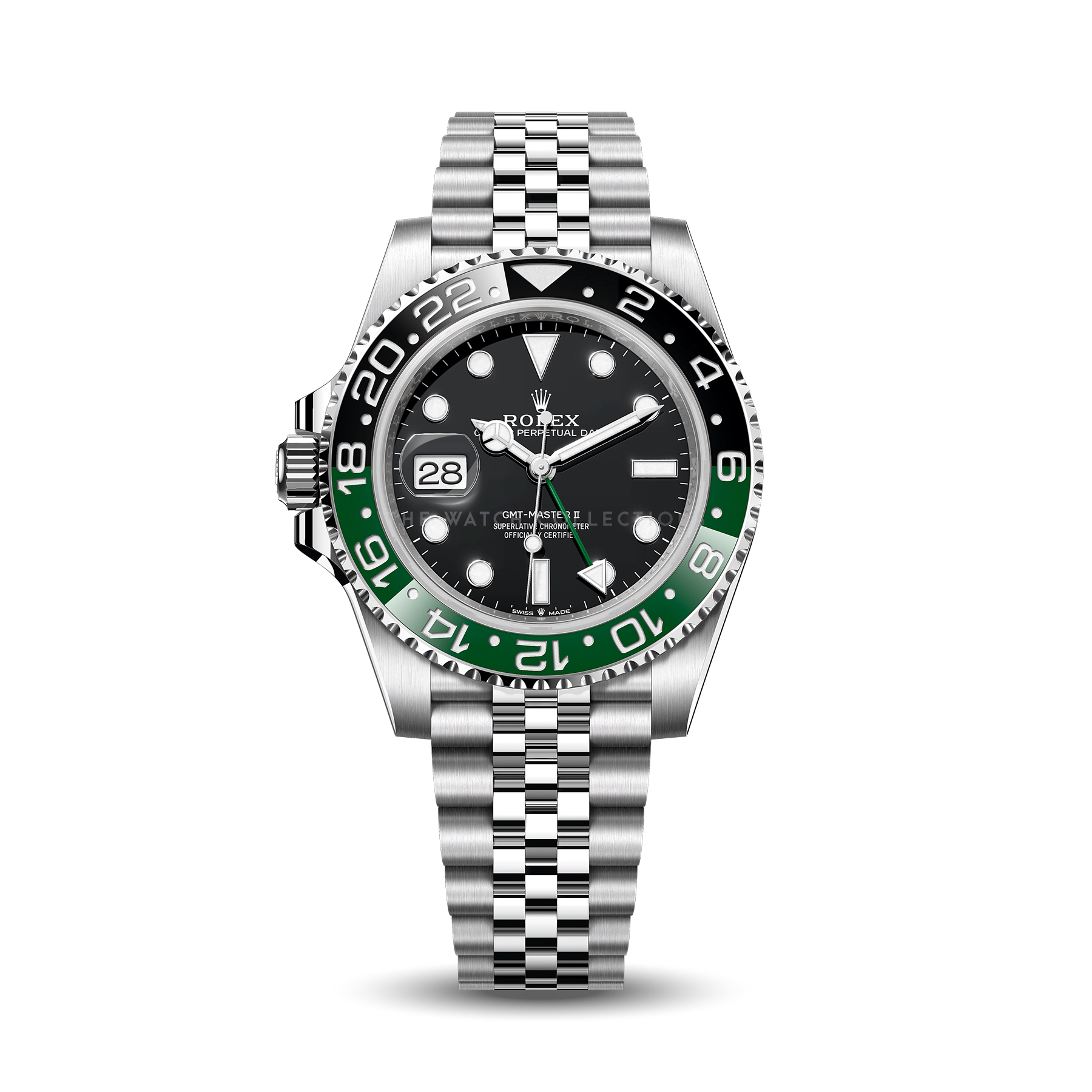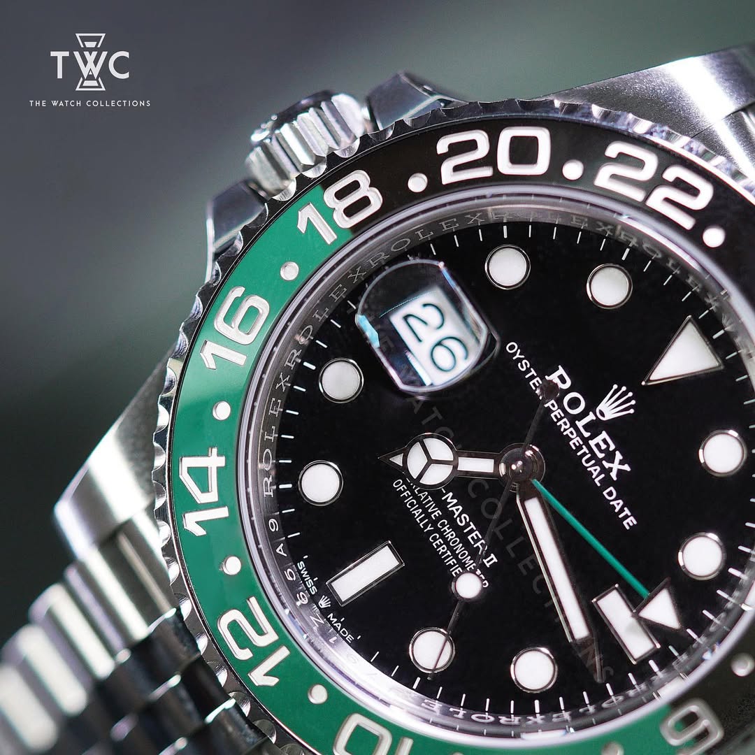 The GMT-Master II Sprite features a 40mm stainless steel case with iconic green and blue bezel. Equipped with GMT function, perfect for travelers and modern Rolex collectors. Sporty and elegant design enhances its market appeal.