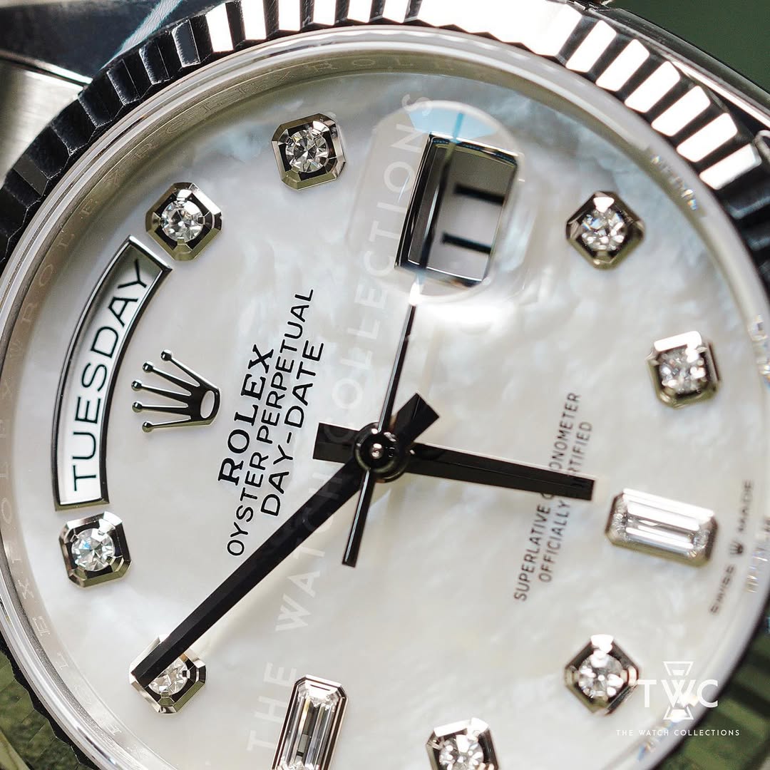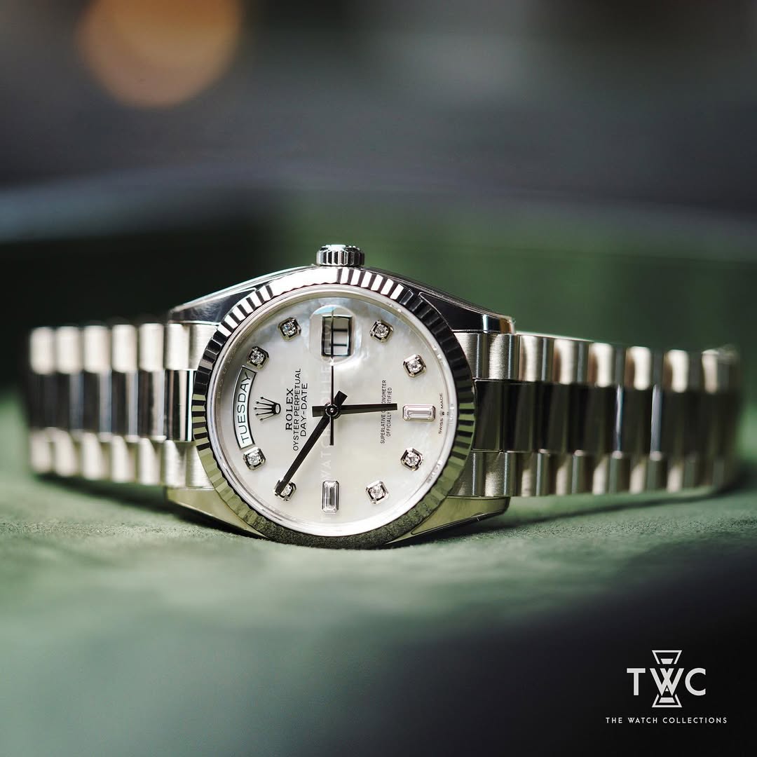 The Rolex Day-Date 36 White Gold ref. 128239NG embodies timeless luxury, highlighted by its elegant Mother of Pearl dial. Each MOP dial offers a naturally unique shimmer, beautifully complemented by the refined 36mm 18k white gold case. Renowned as the “President’s Watch,” the Day-Date remains a benchmark of prestige, blending classic proportions with enduring collectability.
