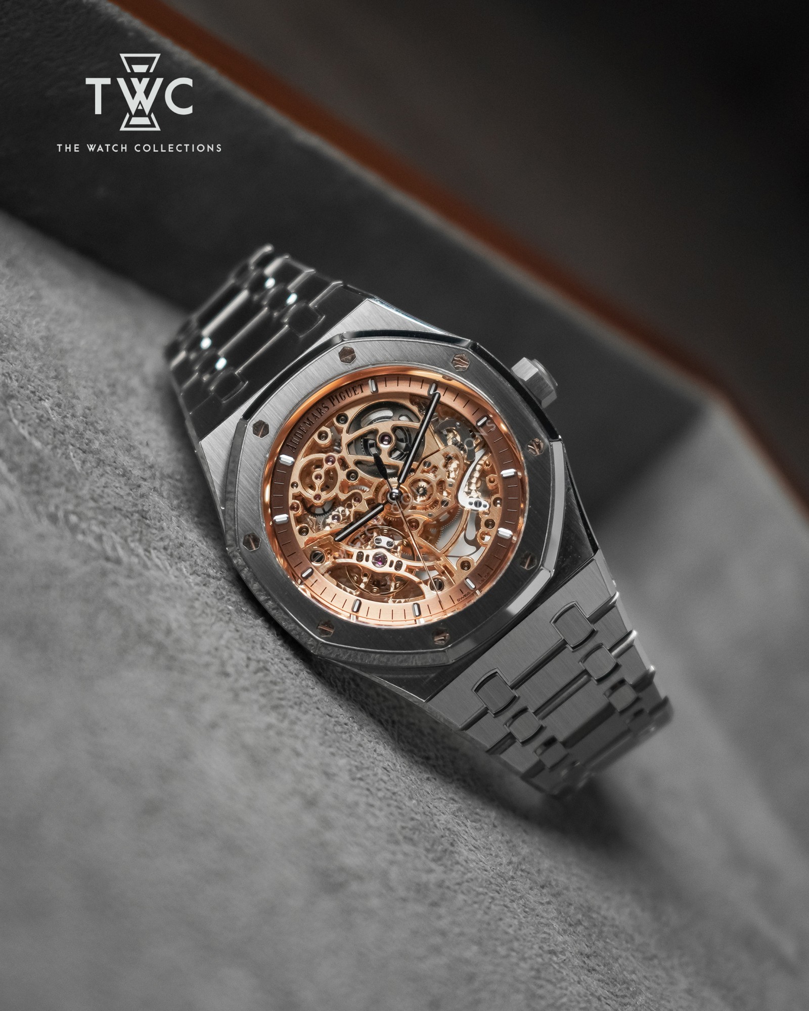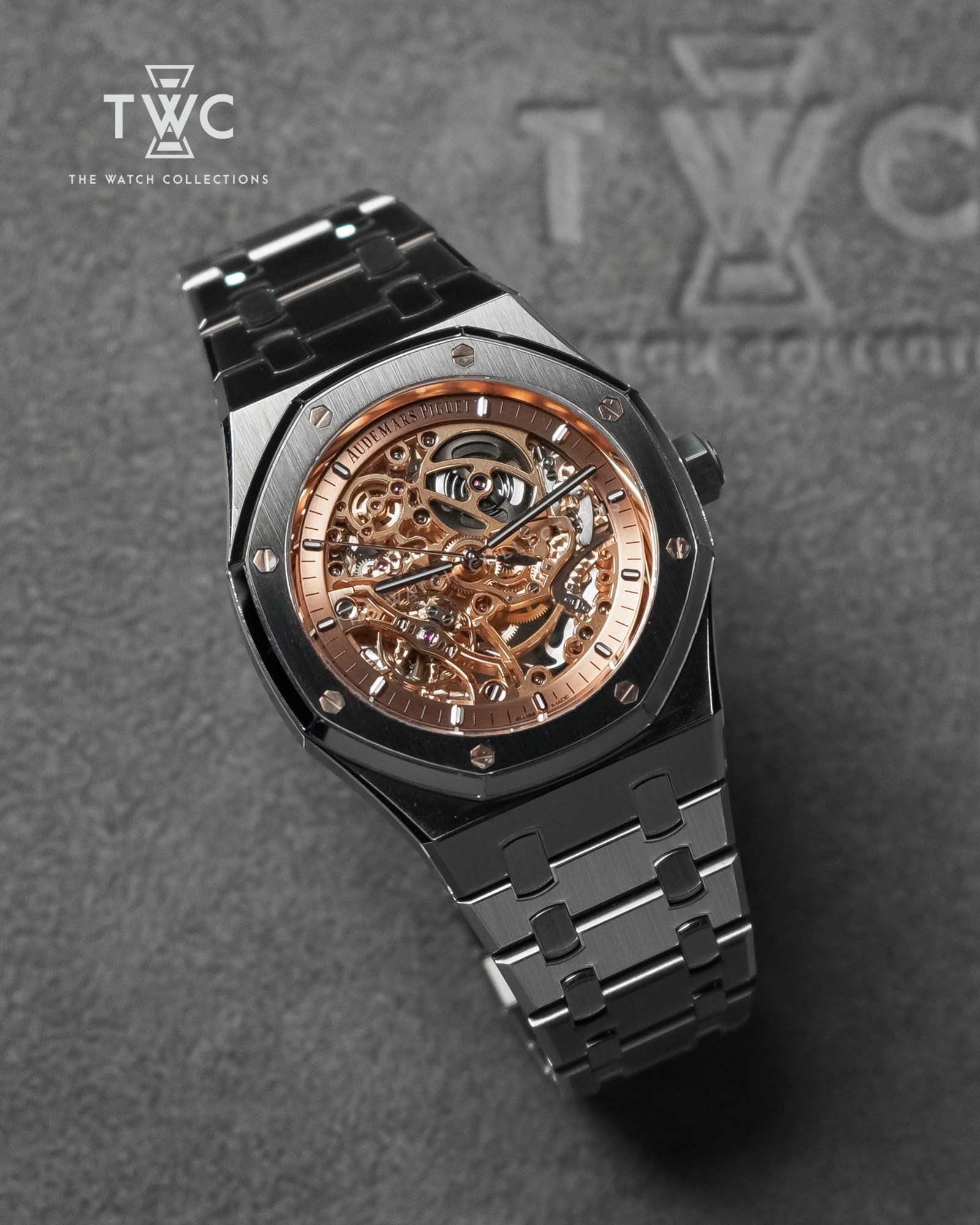 The Royal Oak 15407ST features a stainless steel case with salmon skeleton dial and double balance wheel. Modern, technical, and exclusive for high-end collections.