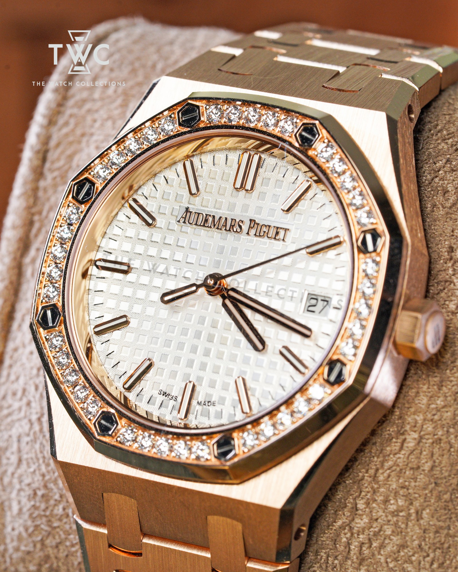 The Audemars Piguet Royal Oak 37 mm ref. 15551OR showcases the signature Royal Oak elegance in luxurious rose gold. Its iconic octagonal bezel with exposed screws is paired with a “Grande Tapisserie” dial, highlighting the brand’s distinctive sporty-luxury identity. The 37 mm case size offers balanced proportions and versatility, making it an ideal choice for those seeking a refined yet contemporary Royal Oak.