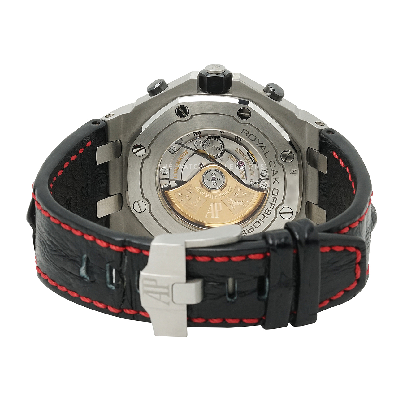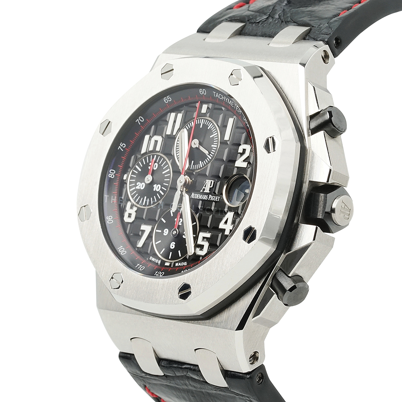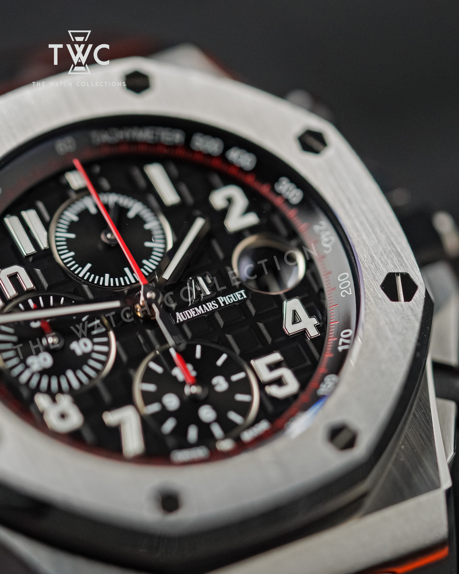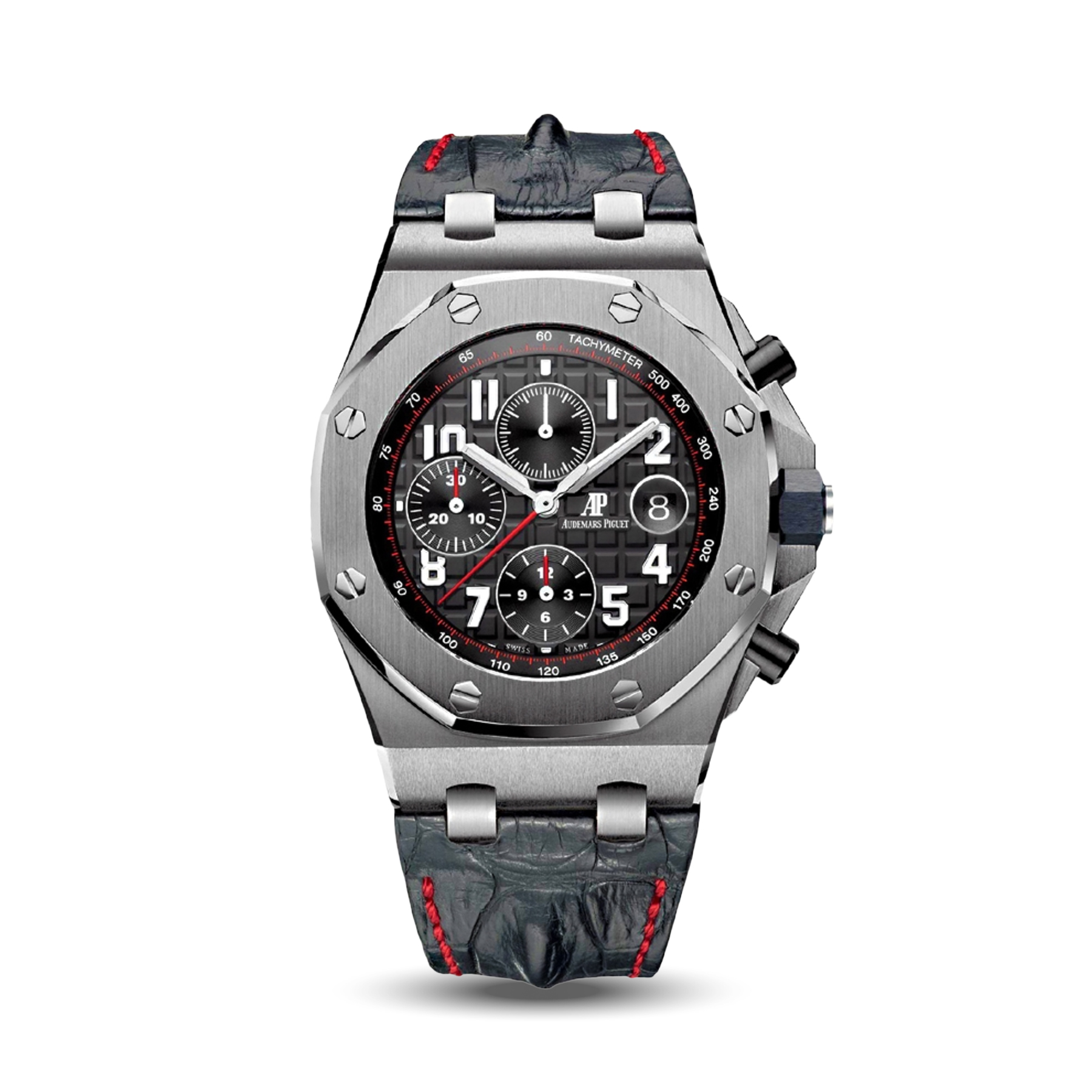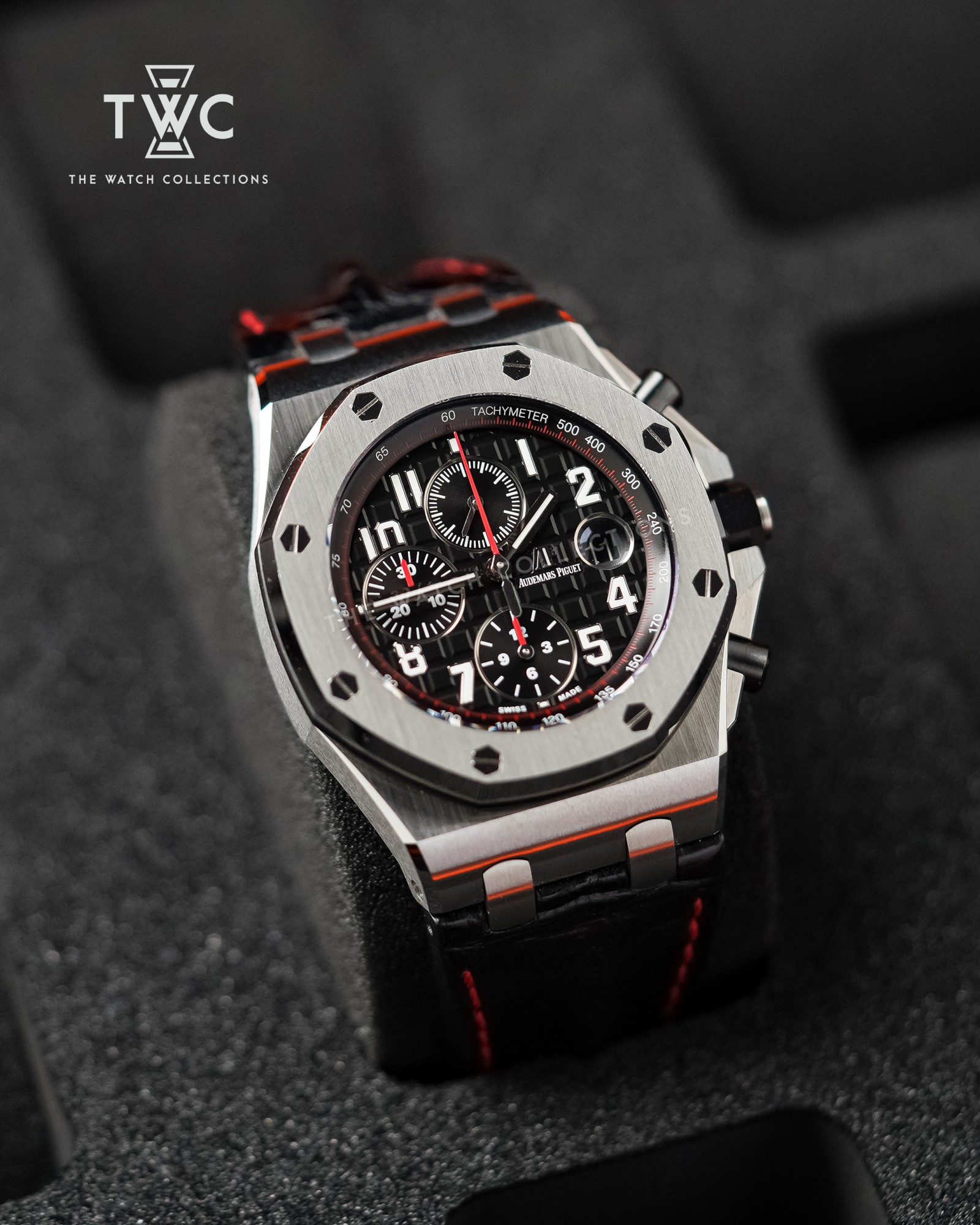 The Audemars Piguet Royal Oak Offshore Chrono “Black Red” features a black dial with striking red accents paired with a robust stainless steel case. Its 42mm size offers a masculine and sporty presence. Precise chronograph design and fine finishing enhance the watch’s collectible appeal. The bold color combination and modern aesthetics make it suitable for daily wear or special occasions.