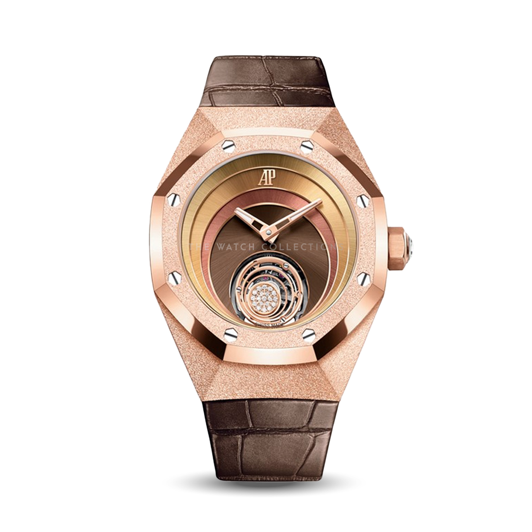 The Audemars Piguet Royal Oak Concept Flying Tourbillon ‘Tamara Ralph’ combines horological innovation with avant-garde aesthetics. Its 44mm rose gold case houses a skeleton dial showcasing the flying tourbillon in full view. The black rubber strap with AP folding clasp provides comfort and a modern touch to this exclusive collector’s piece.