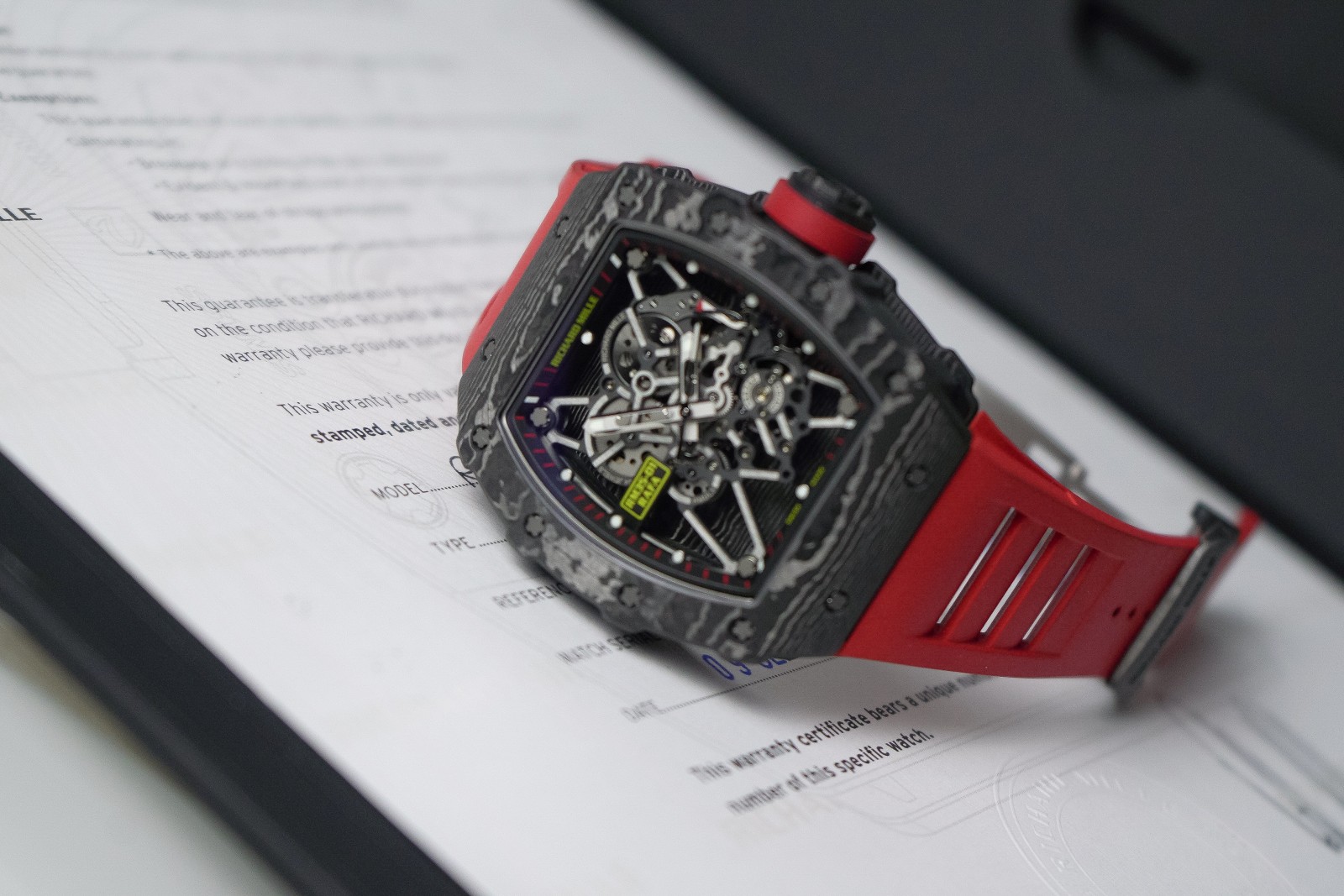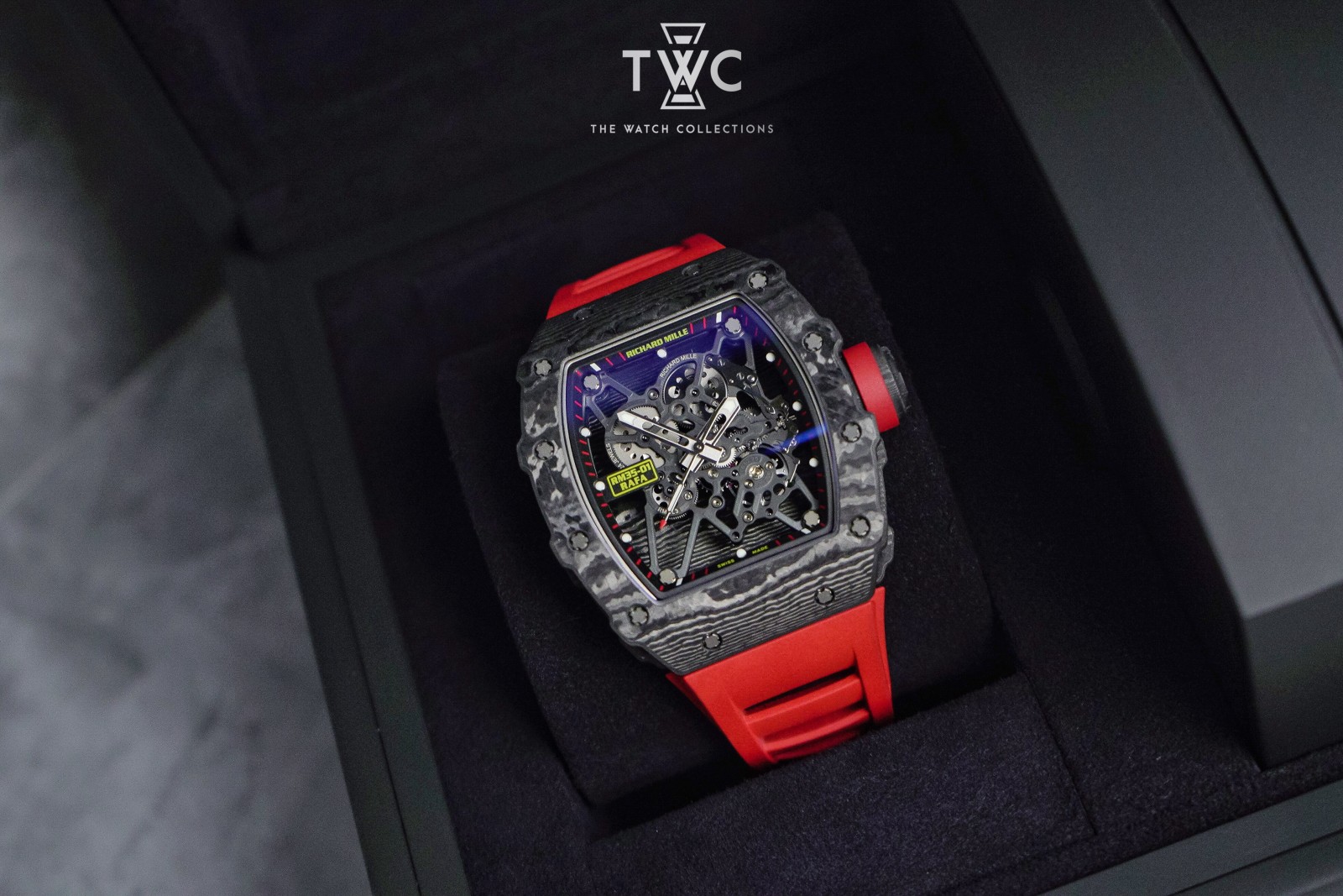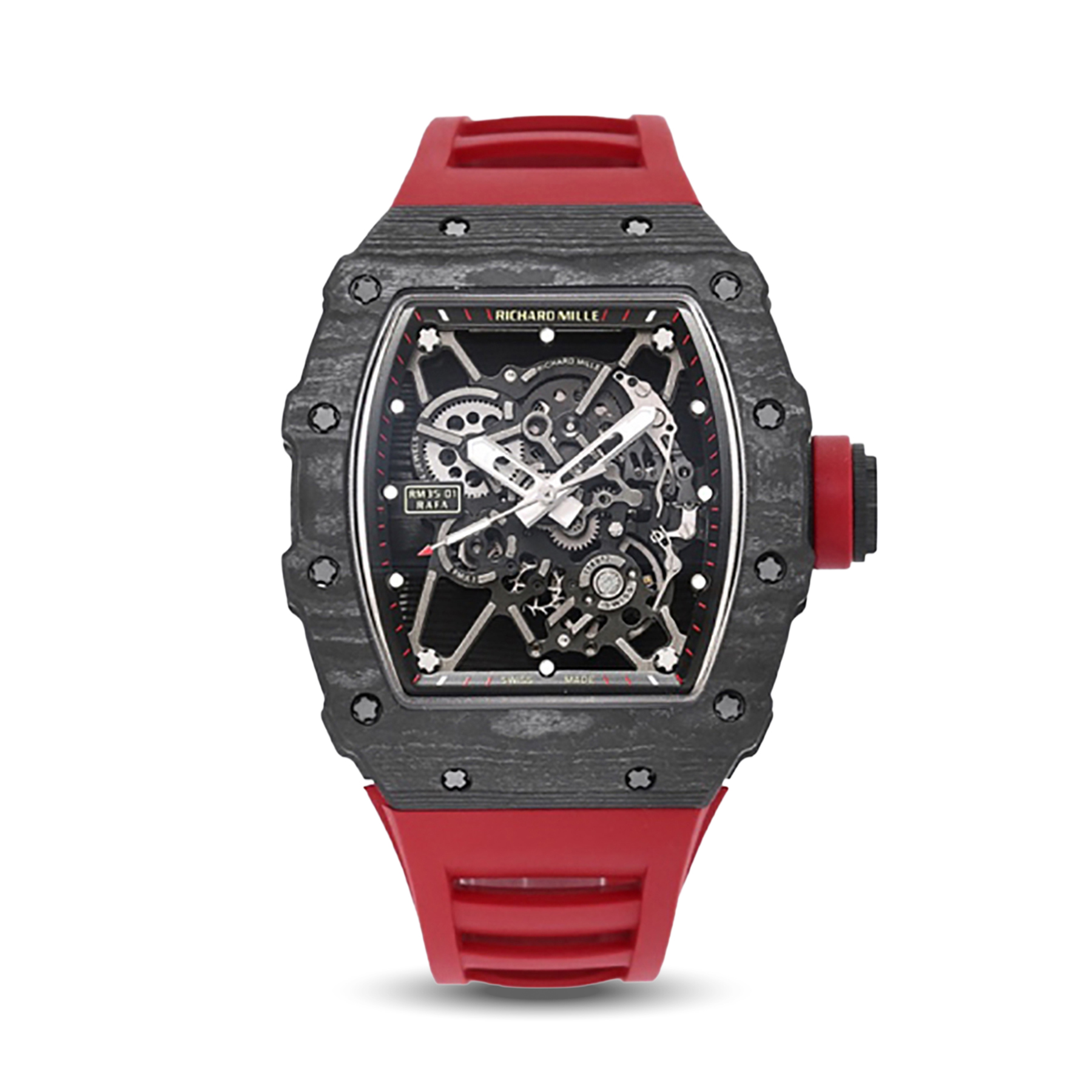 The Richard Mille RM 35-01 Rafael Nadal NTPT features an ultra-light tonneau design crafted from NTPT carbon, engineered for extreme performance. Its skeleton dial reveals the manual-winding RMUL3 movement, developed to withstand high-impact conditions and reflect Richard Mille’s advanced engineering philosophy in professional sports. This model stands as a high-performance timepiece with a distinctly technical and futuristic identity from the Rafael Nadal collection.