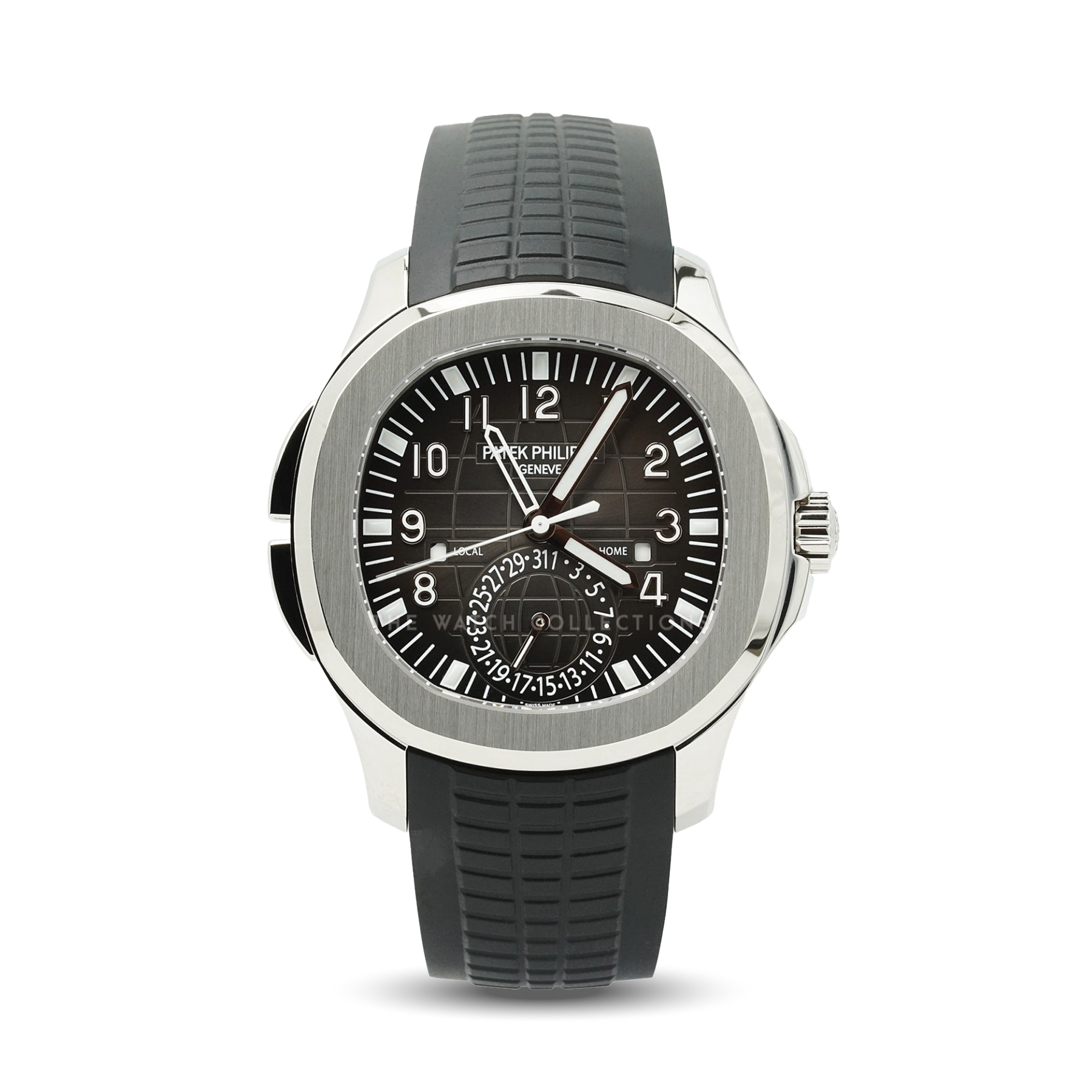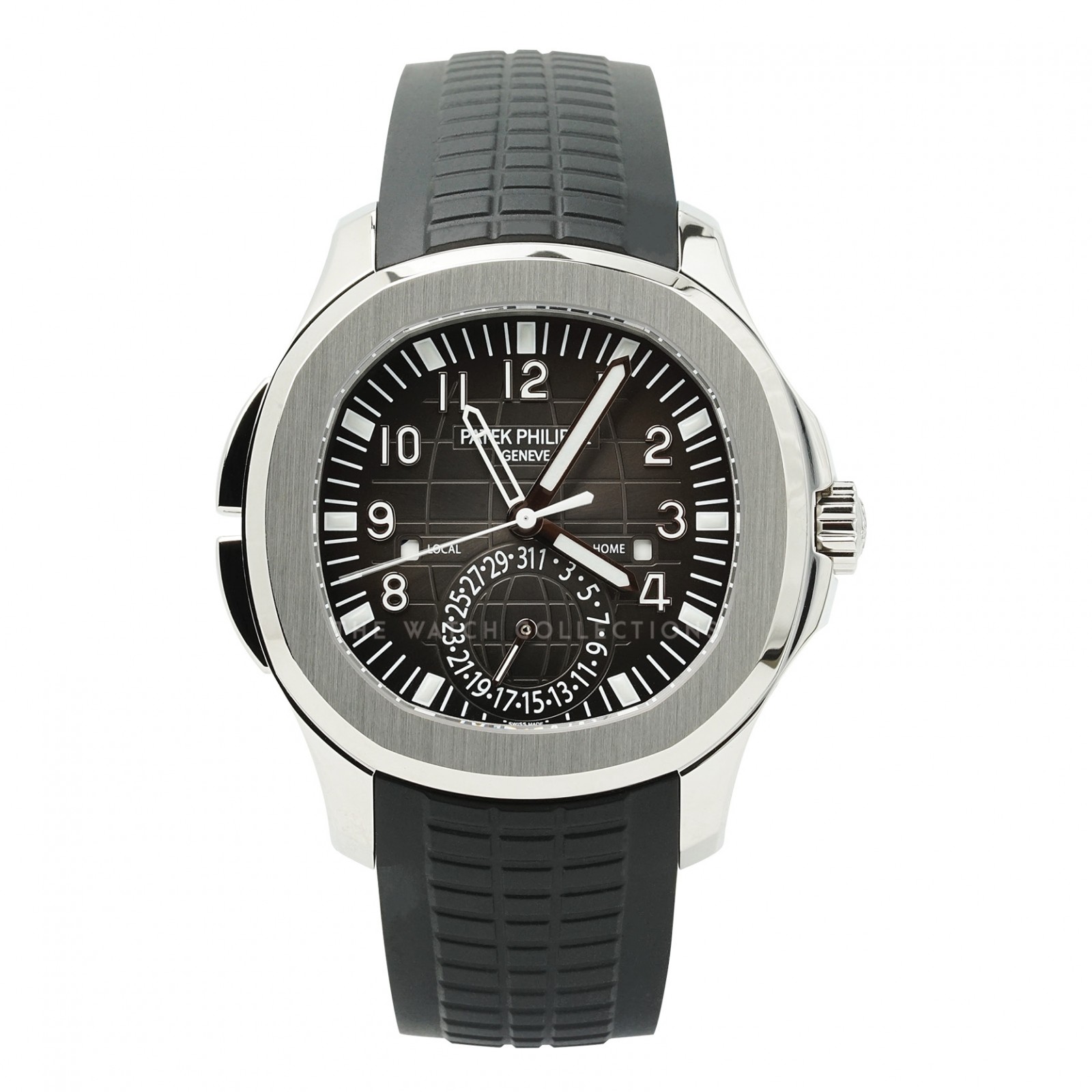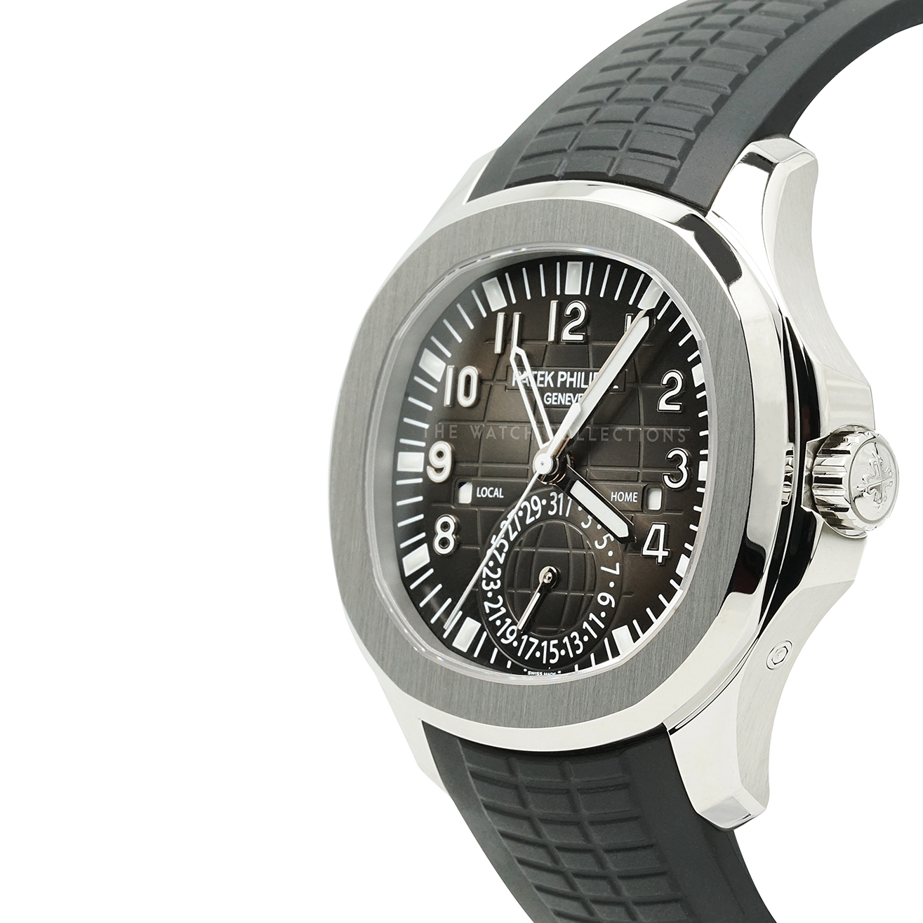 The Patek Philippe Aquanaut Travel Time 5164A is a luxurious sports watch equipped with a dual-time function, designed for frequent travelers. Its stainless steel case is paired with the signature black textured Aquanaut dial and a comfortable rubber strap. Powered by the in-house Cal. 324 S C FUS movement, this model provides an intuitive display of local and home time, making it a highly desirable piece that balances functionality with prestige.
