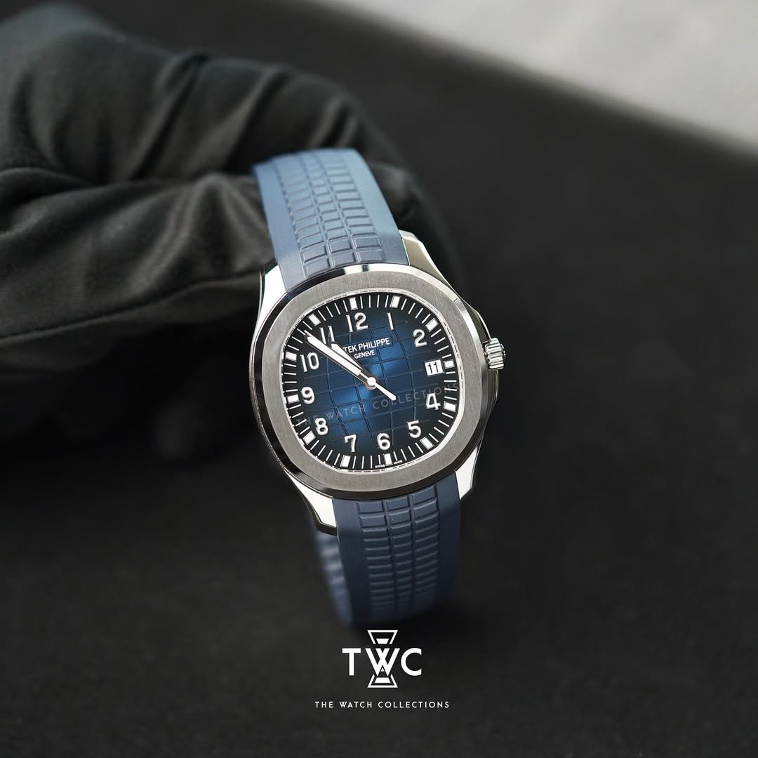 The Patek Philippe Aquanaut 5168G features a white gold case with blue dial. Sporty, modern, and elegant, ideal for collectors seeking classic Patek Philippe design.