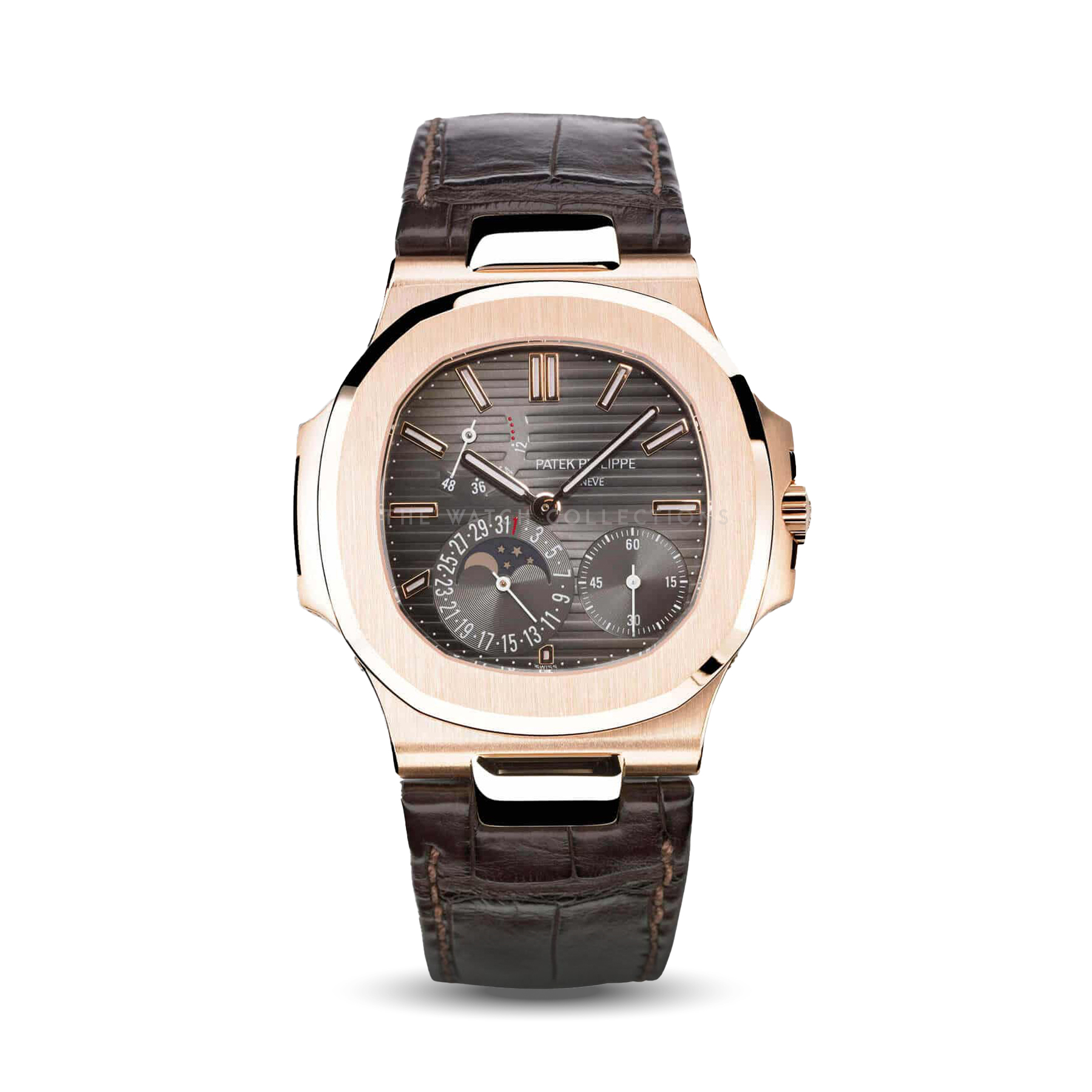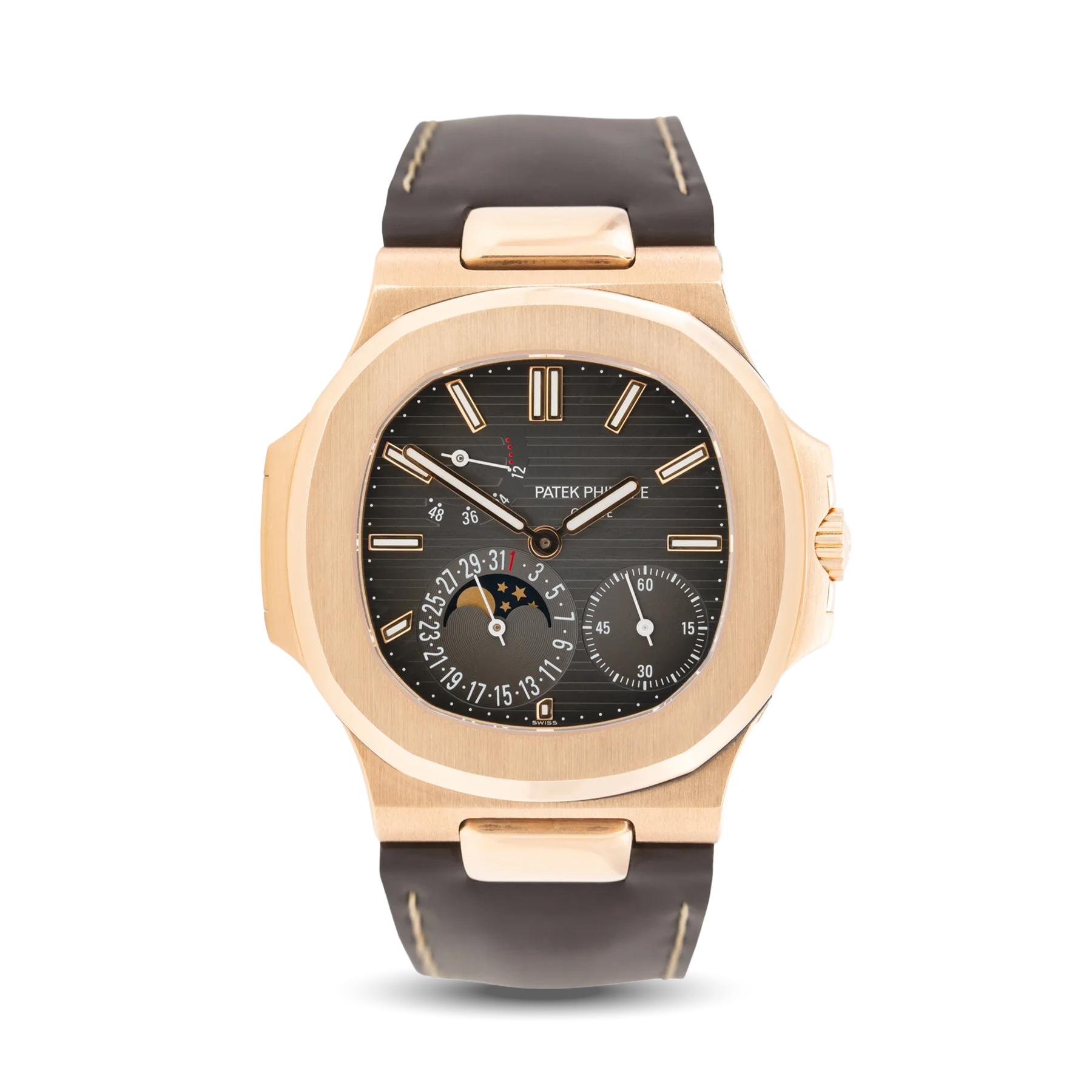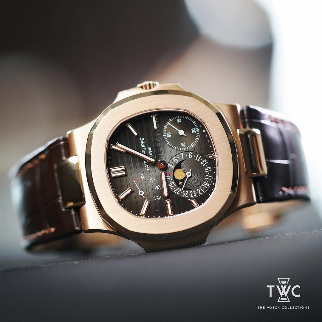 The Patek Philippe Nautilus 5712R is an iconic timepiece distinguished by its unique asymmetrical dial layout. Crafted in rose gold, the case and bracelet offer a refined balance of luxury and sportiness. The brown dial with well-integrated complications highlights the watch’s technical and exclusive character. This reference is regarded as one of the most desirable modern Nautilus models among collectors.