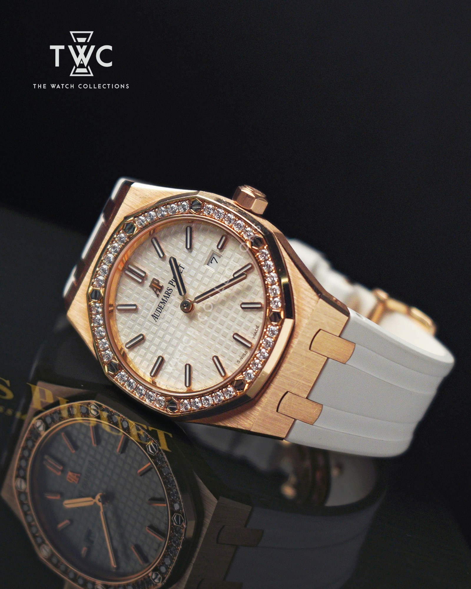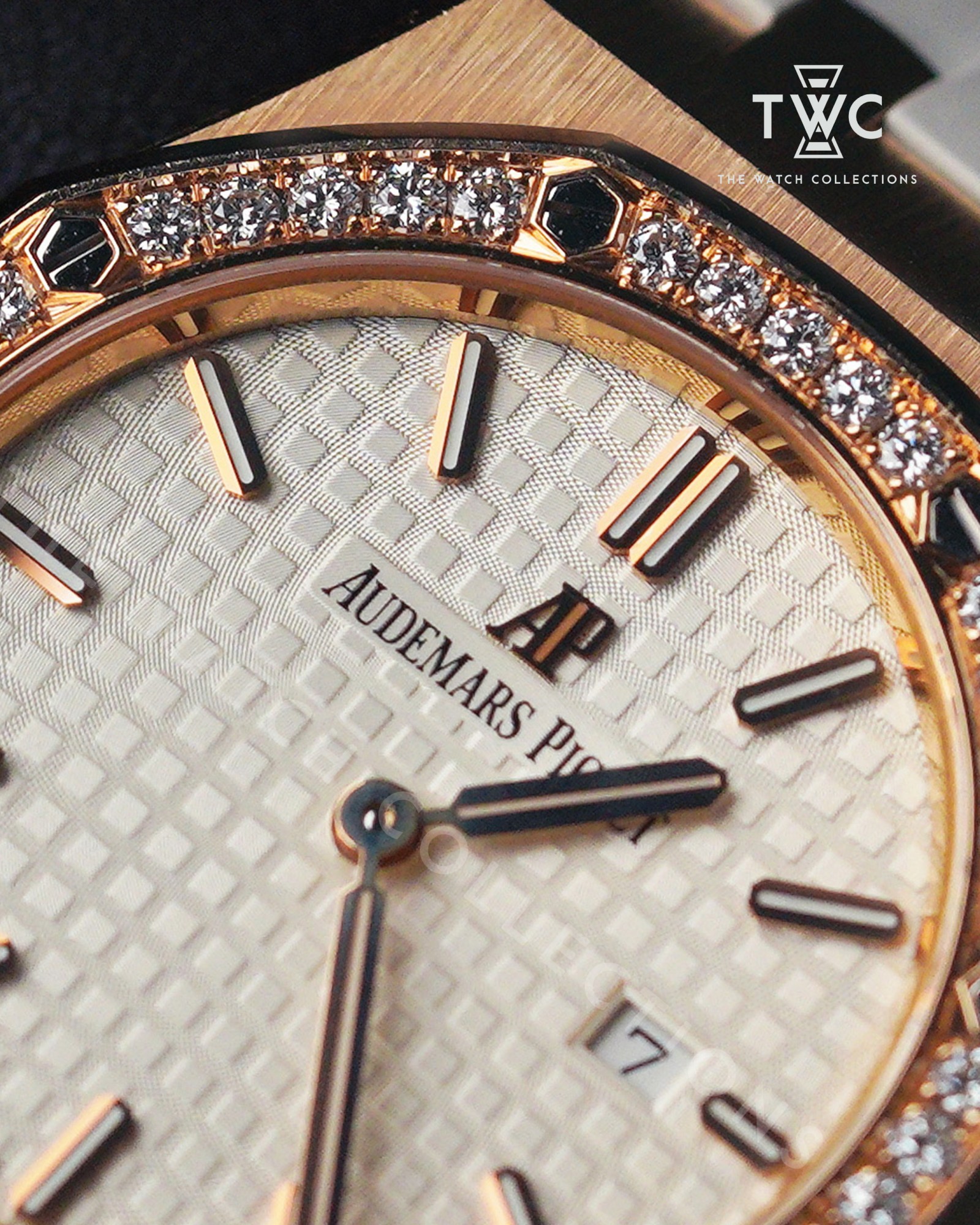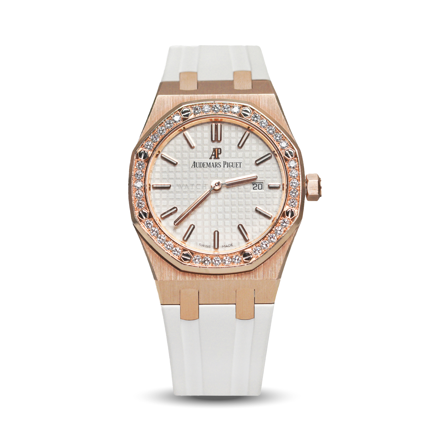 The Audemars Piguet Royal Oak 67651OR Rose Gold Diamond features a rose gold case with a diamond bezel. Its elegant dial and iconic Royal Oak design make it perfect for a standout luxury collection.