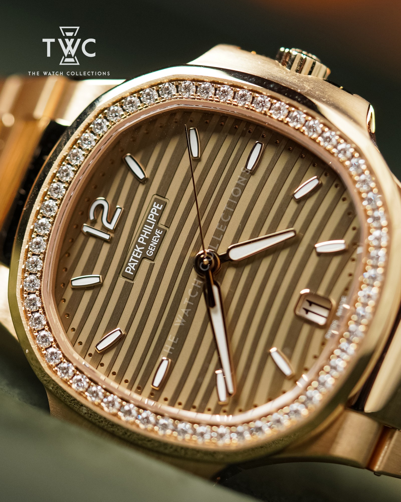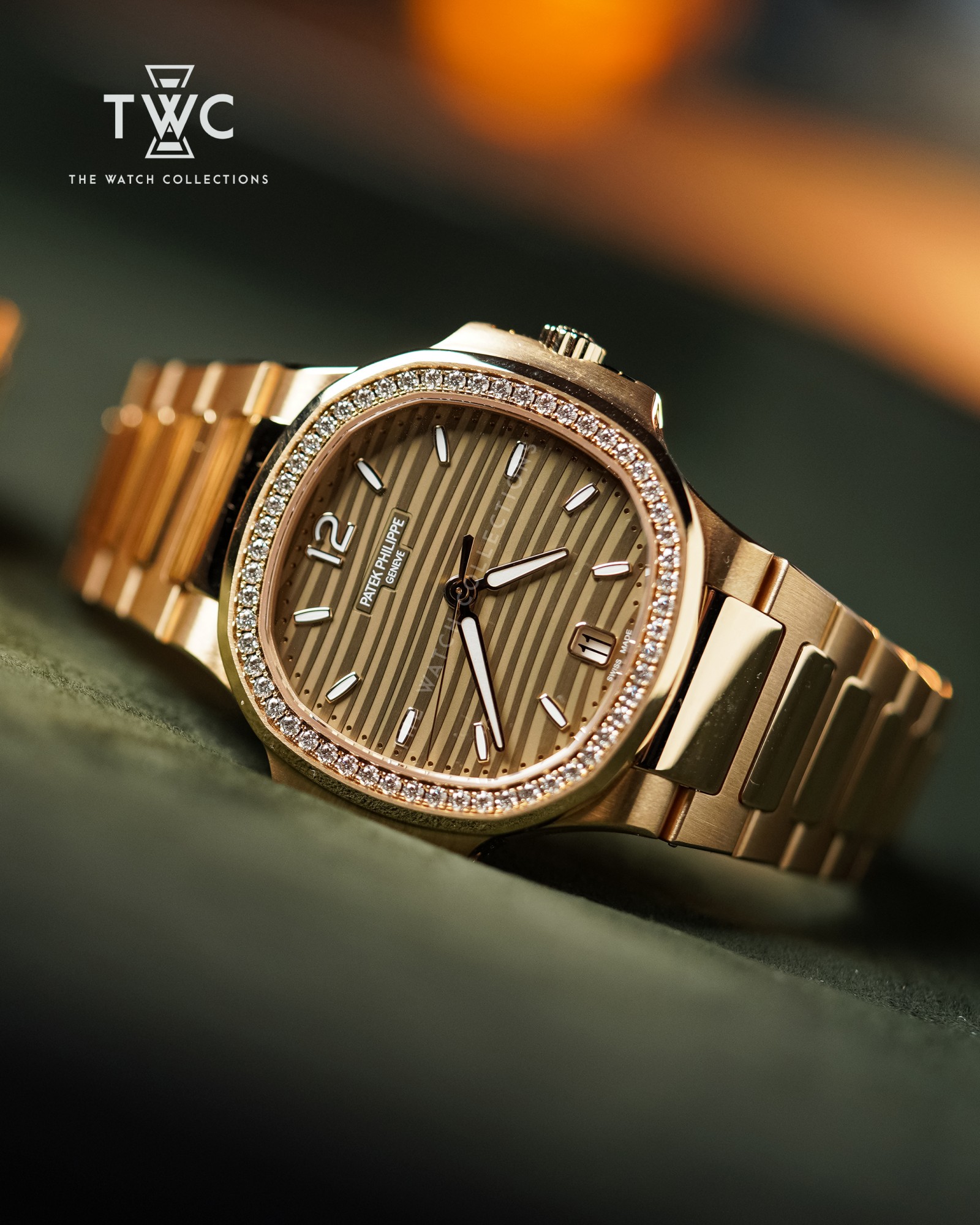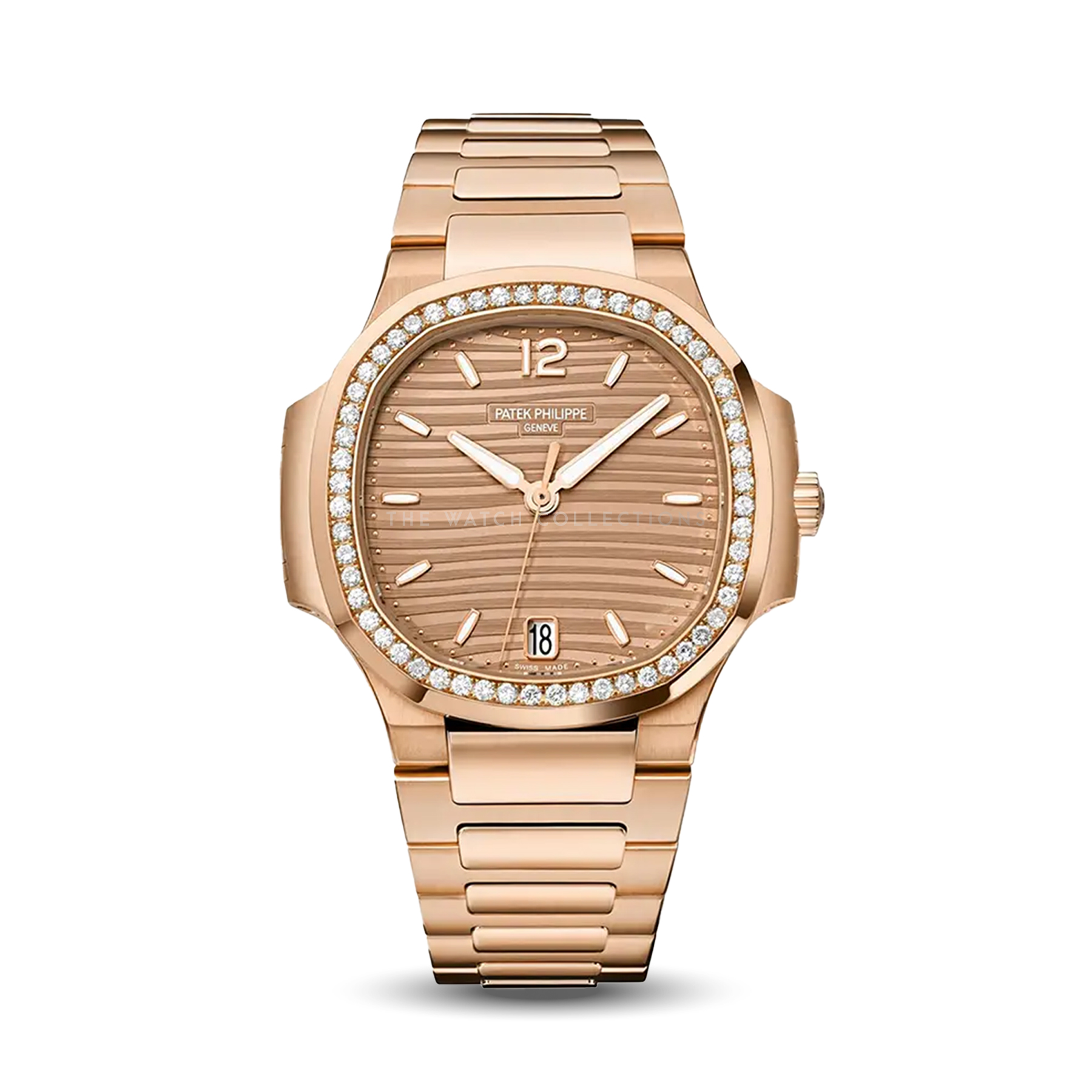 The Patek Philippe Nautilus Ref. 7118/1200R presents a refined feminine interpretation of the iconic Nautilus design, crafted entirely in rose gold. Its 35.2mm case flows seamlessly into the integrated rose gold bracelet, offering an elegant yet sporty profile. The champagne dial with Arabic numerals adds a warm, sophisticated character, complemented by the diamond-set bezel that elevates the watch’s unmistakable luxury appeal.