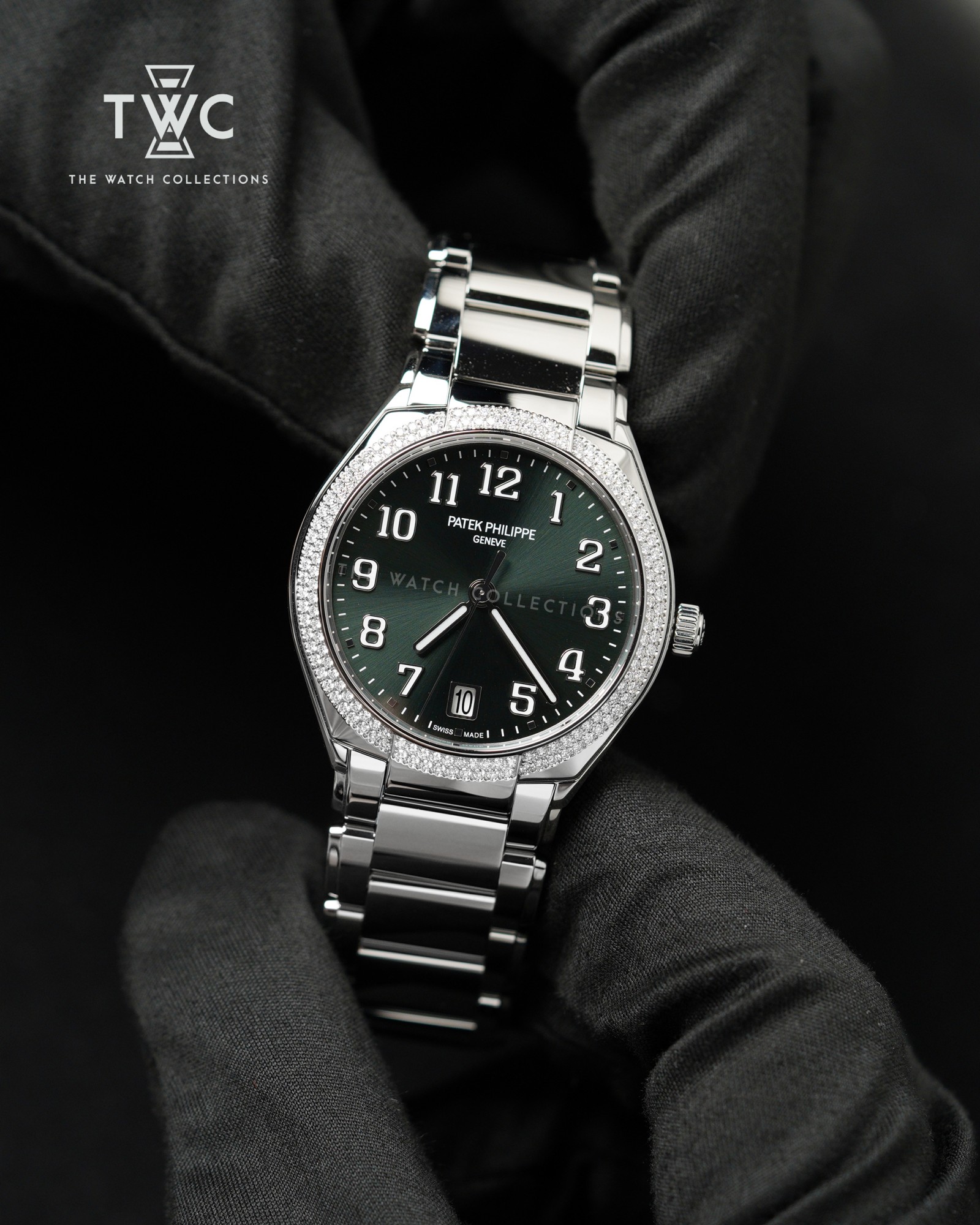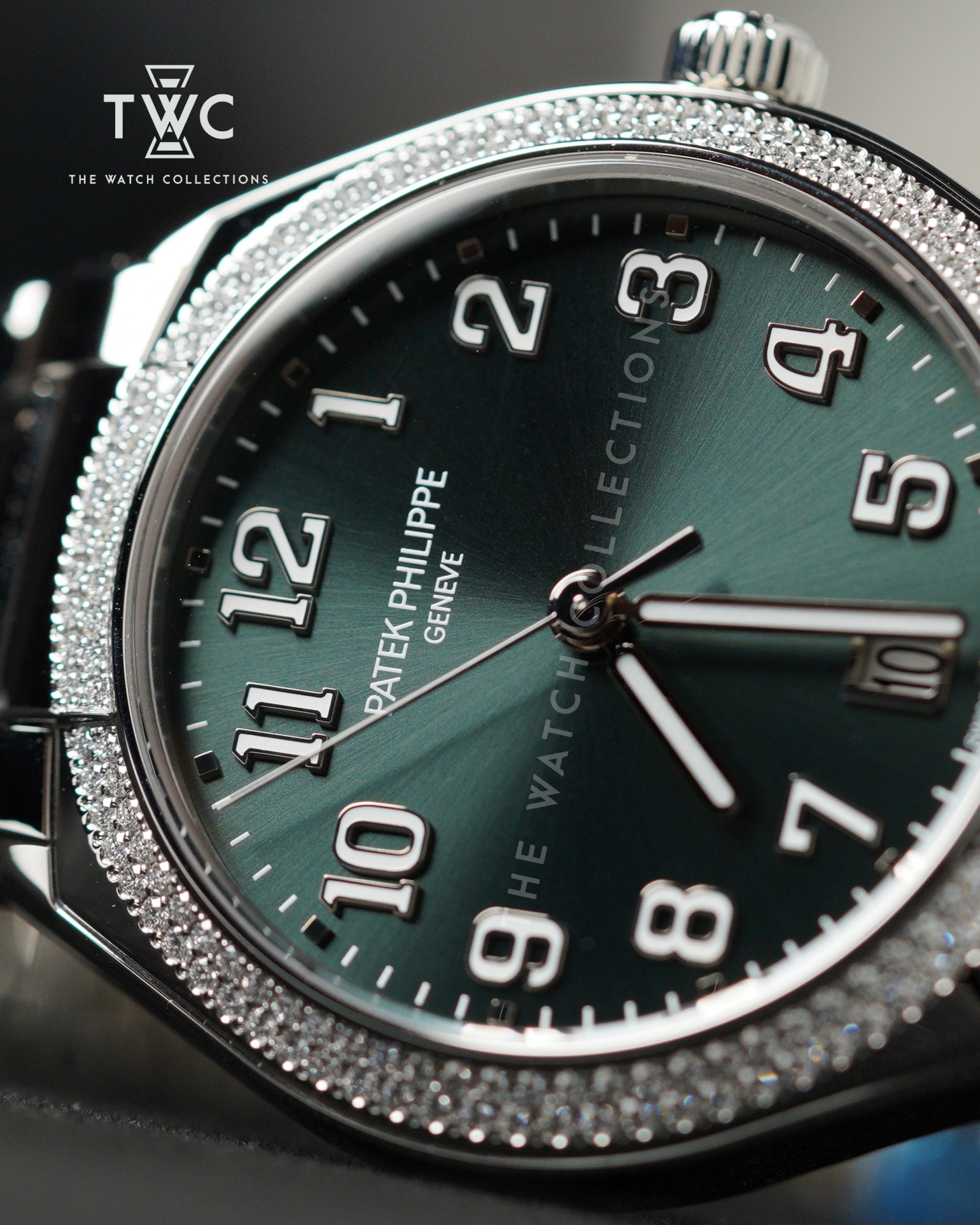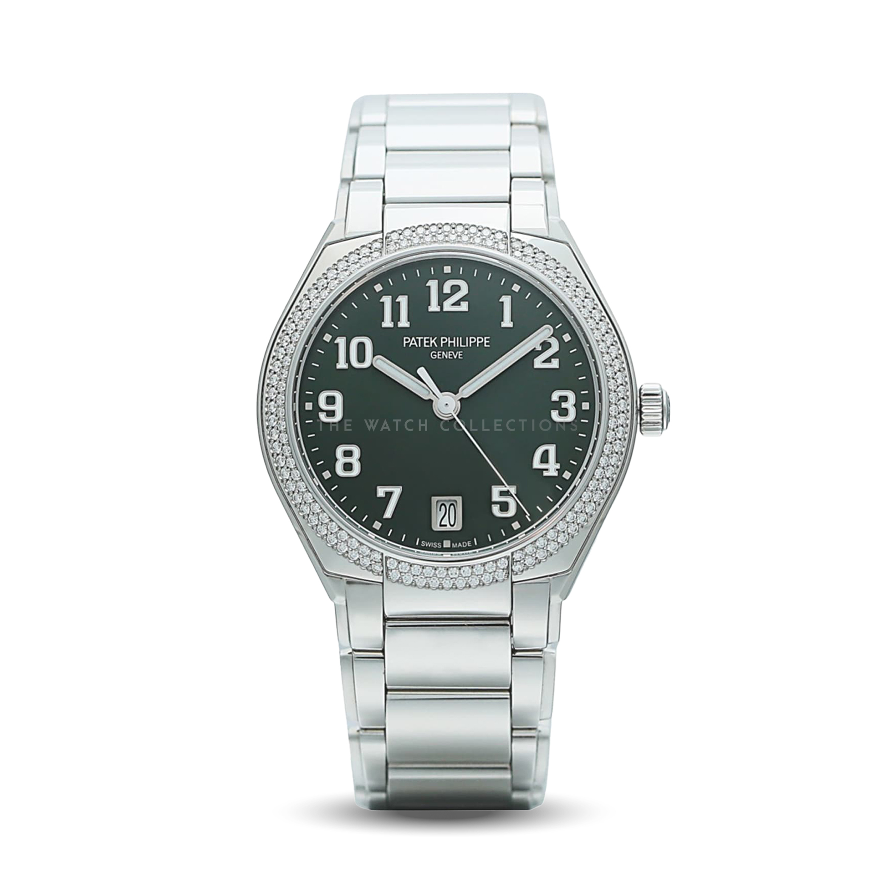 The Patek Philippe Twenty~4 7300/1200A features a stainless steel case with green dial. Elegant, feminine, and highlights contemporary design.
