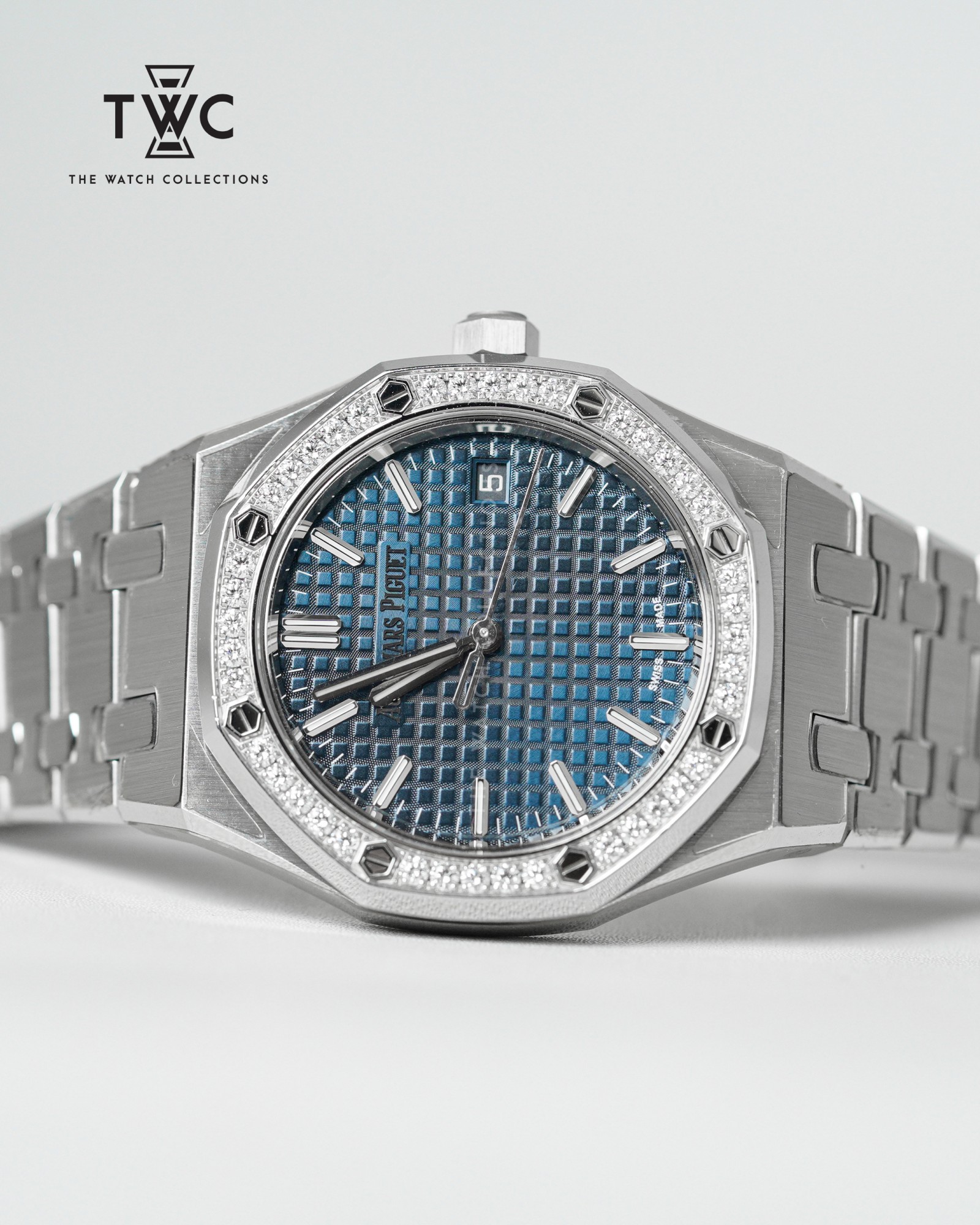 The Royal Oak 34mm Stainless Steel with Bleu Nuit dial presents Audemars Piguet’s iconic design in a more refined and elegant proportion. The signature “Petite Tapisserie” dial is complemented by diamond hour markers, striking a perfect balance between sporty character and refined luxury. Powered by an in-house automatic movement, this timepiece is an ideal daily luxury watch with strong collectibility.