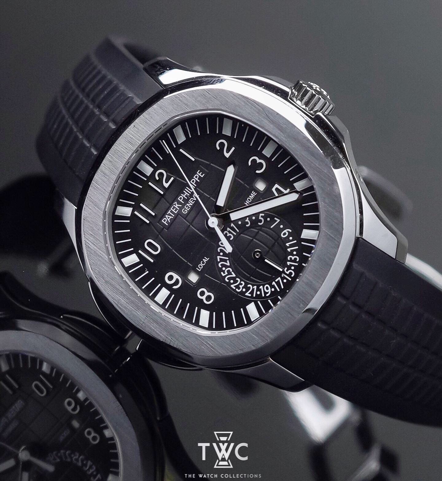 The Patek Philippe Aquanaut Travel Time ref. 5164A-001 combines dual-time functionality with a refined sporty design. Its stainless steel case is paired with a textured black dial and signature Arabic numerals for excellent legibility. The Travel Time complication with day–night indicators makes it ideal for frequent travelers. A highly desirable Aquanaut reference known for both practicality and collectability.