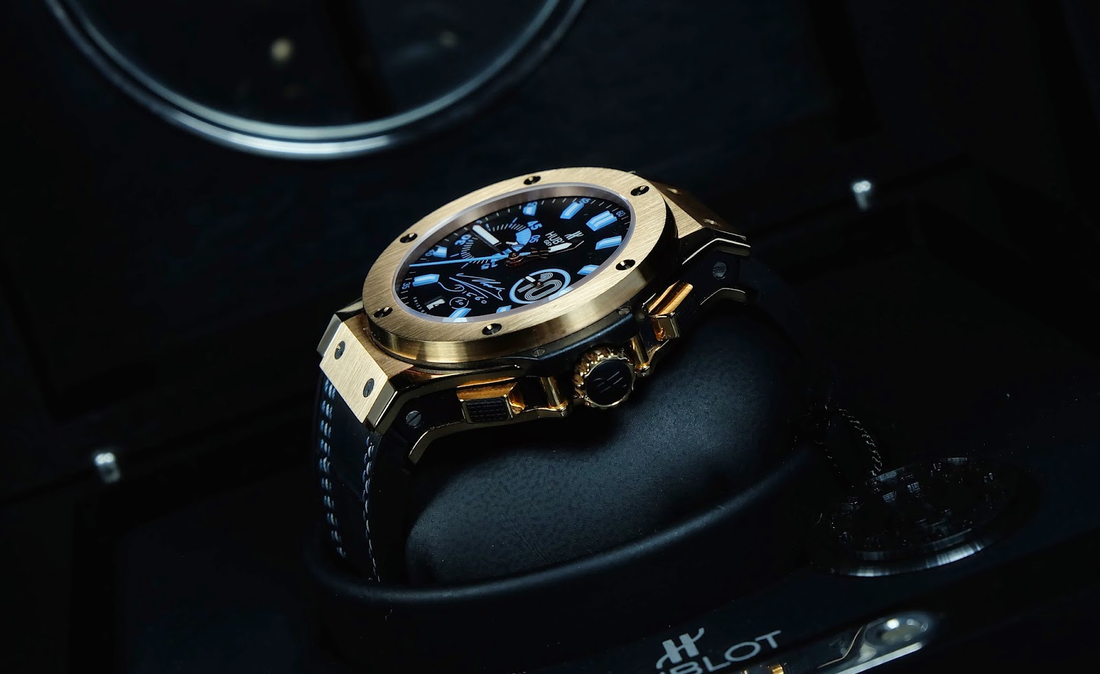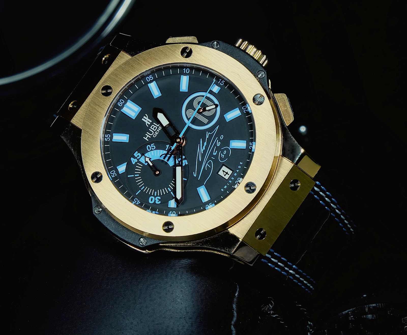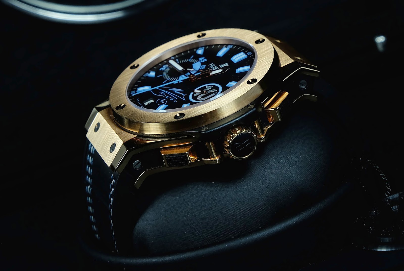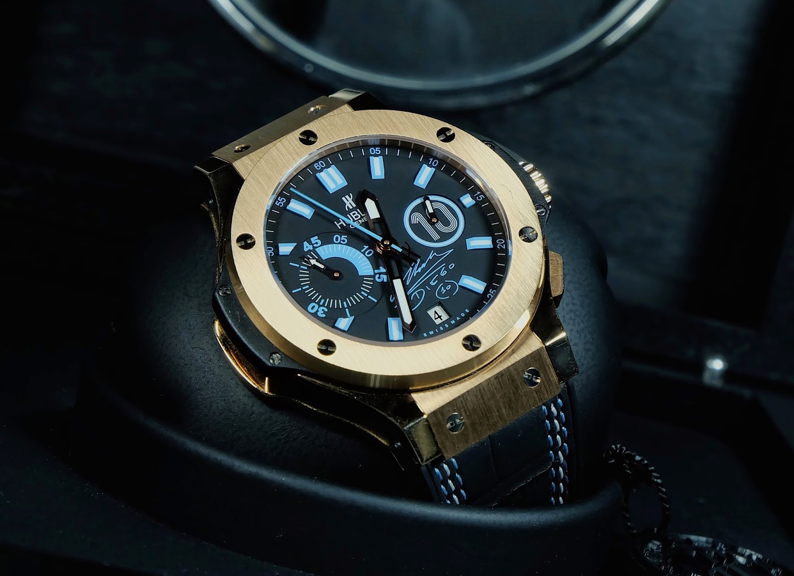 The Hublot Big Bang Maradona Rose Gold combines luxury with a sporty design featuring an elegant rose gold case. Its contrasting dial with black accents enhances readability and modern style. With an additional ceramic bezel, this watch is perfect for collectors who appreciate limited editions and unique details in every piece.
