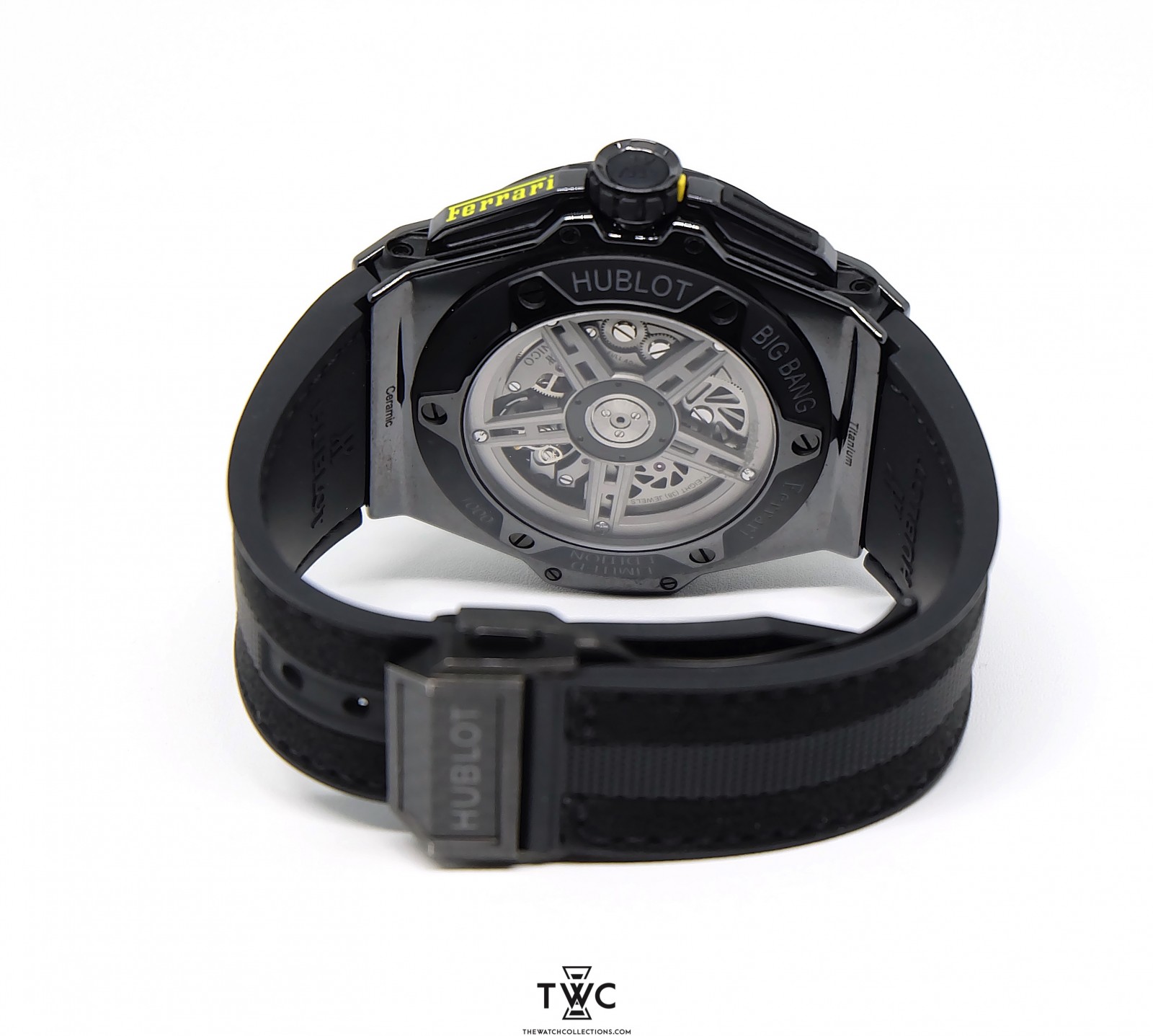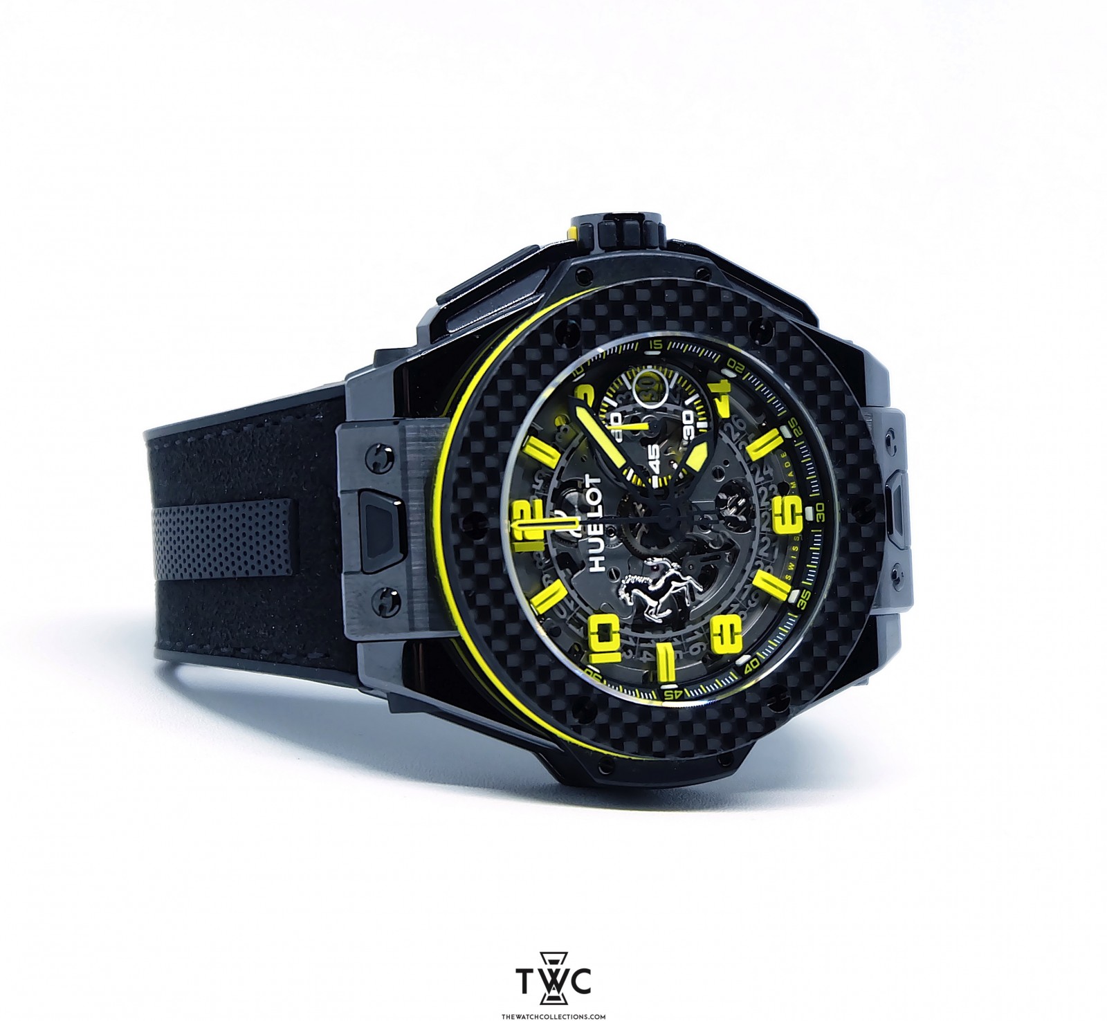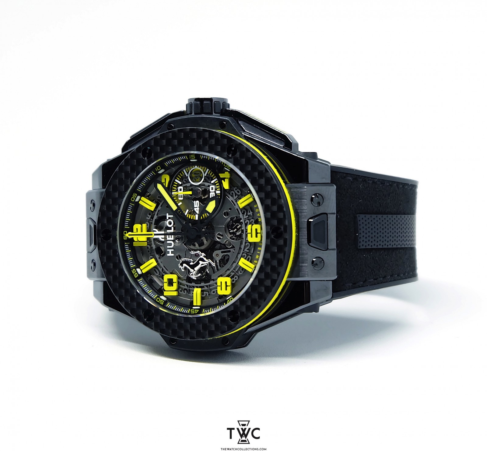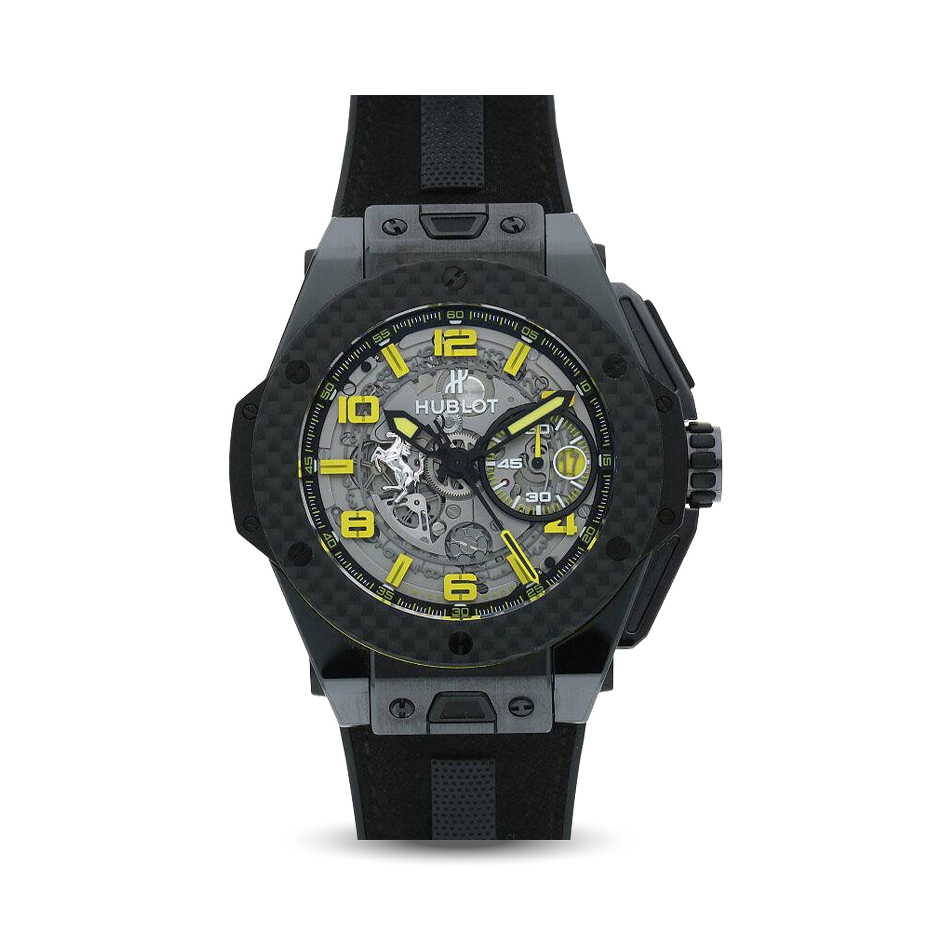 The Hublot Big Bang Unico Ferrari Titanium Carbon features a titanium and carbon case, skeleton dial, and sporty Ferrari design. It emphasizes performance and aesthetics.