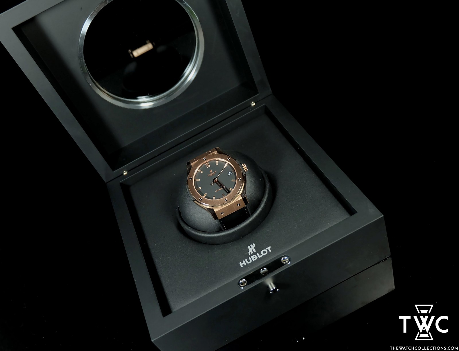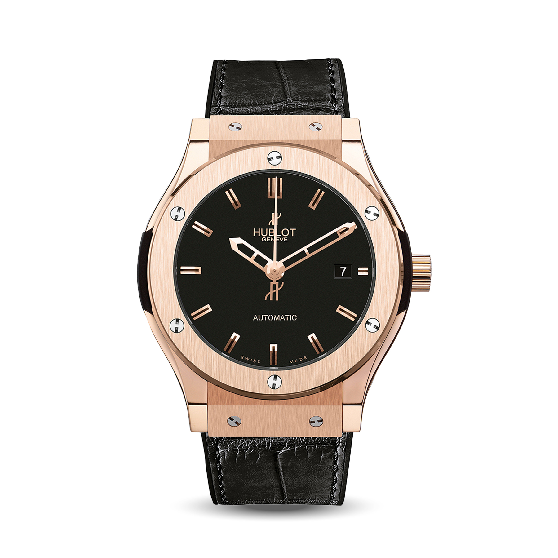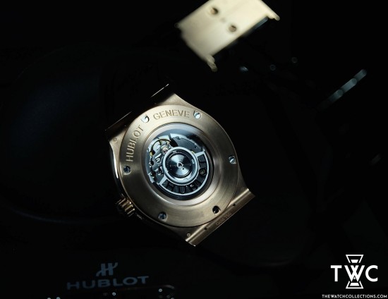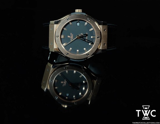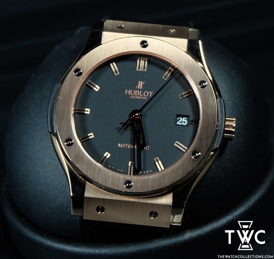 The Hublot Classic Fusion King Gold features a rose gold case with elegant dial and leather strap. Luxurious and classic combination.