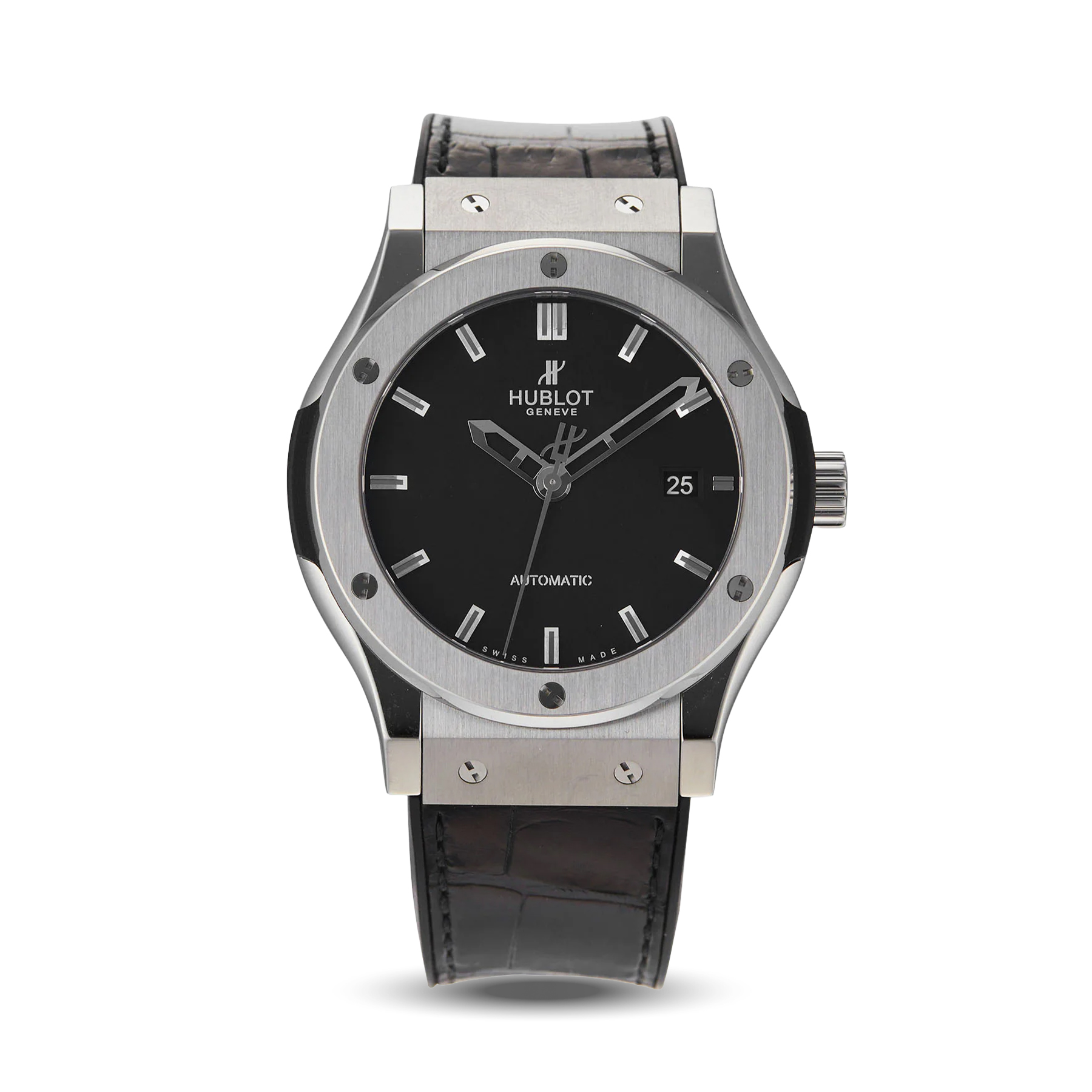The Hublot Classic Fusion Titanium showcases the minimalist and contemporary design that defines the Classic Fusion collection. Its lightweight titanium case is paired with a clean black dial, creating an elegant and versatile look suitable for various occasions. The ultra-thin profile ensures excellent wearing comfort, making it an ideal choice for collectors who appreciate understated luxury with a strong modern identity.