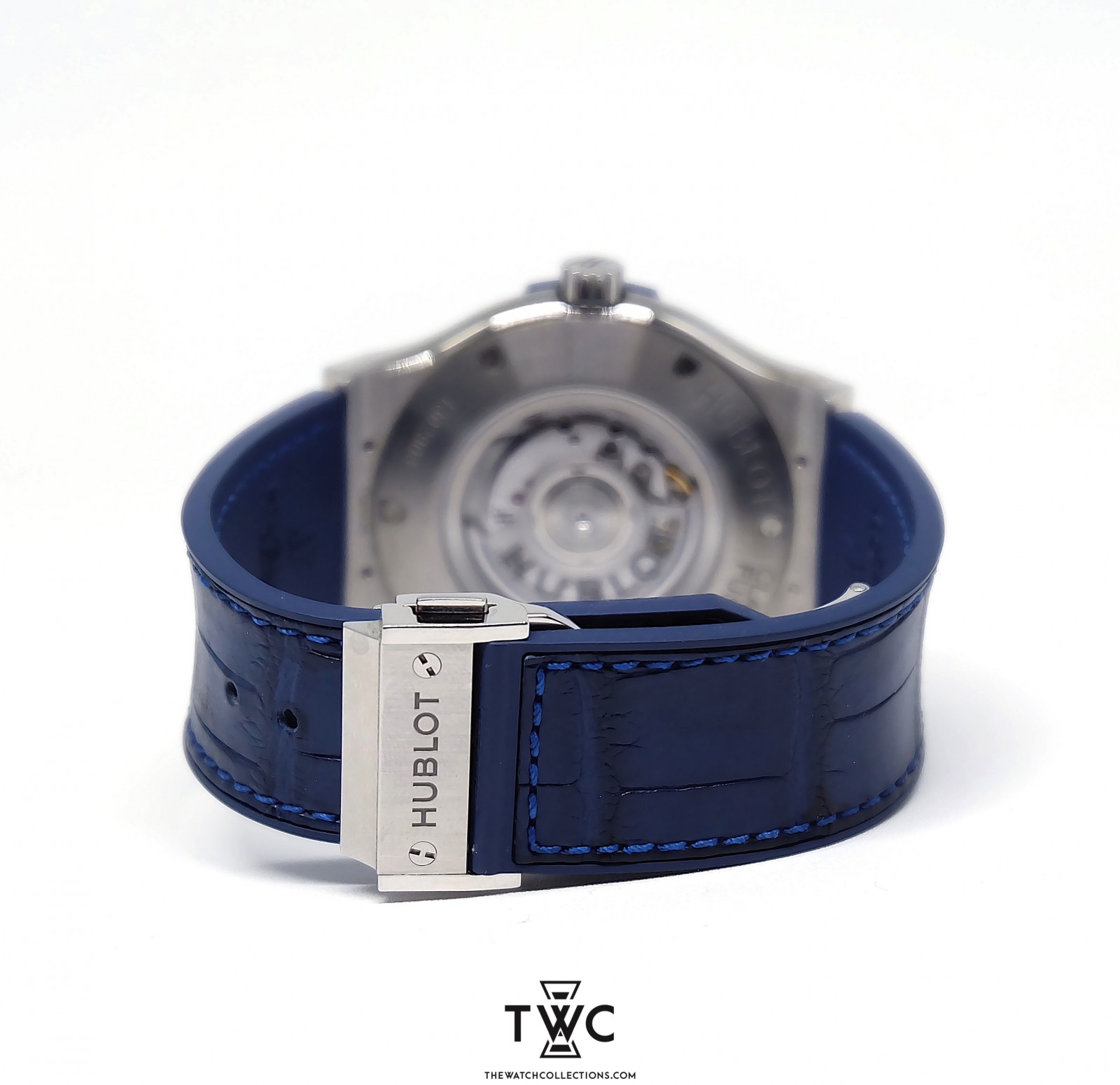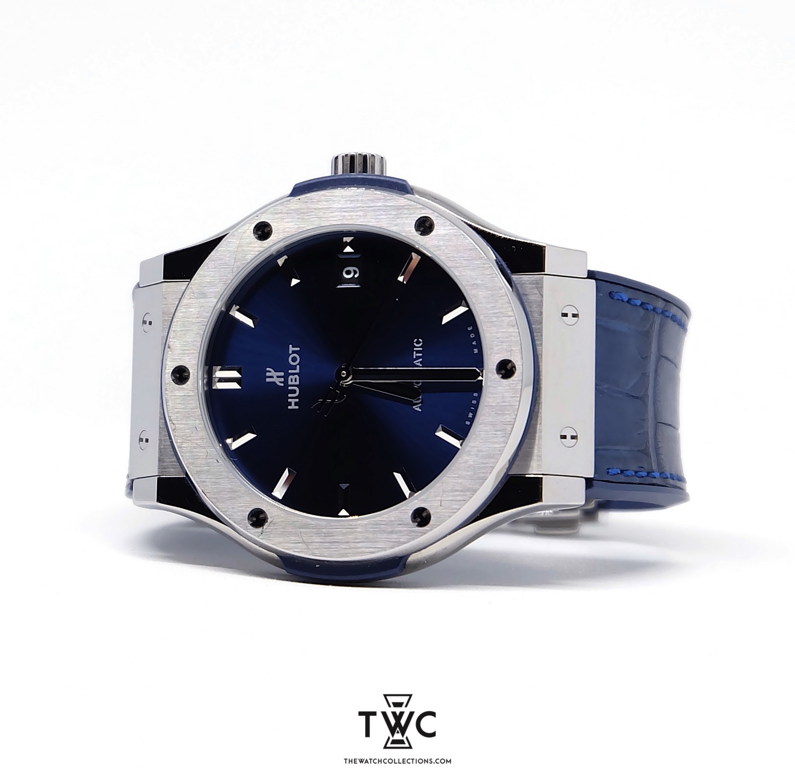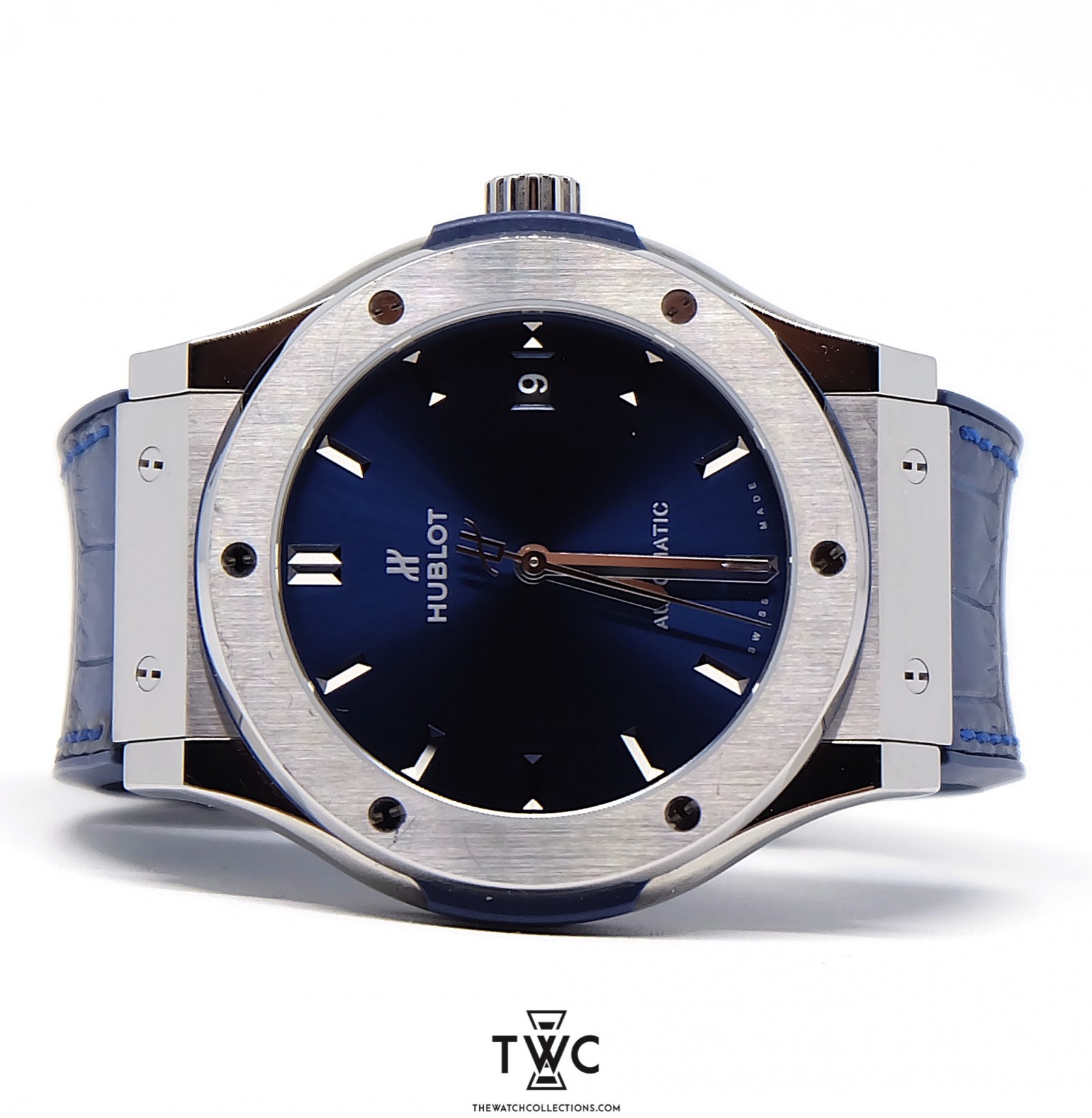 The Hublot Classic Fusion Titanium Blue Dial showcases the clean and modern design that defines the Classic Fusion collection. The lightweight titanium case is paired with an elegant blue sunray dial, creating a perfect balance between sporty appeal and refined luxury. Powered by a reliable automatic movement, this timepiece is an ideal daily luxury watch with an understated and timeless character.