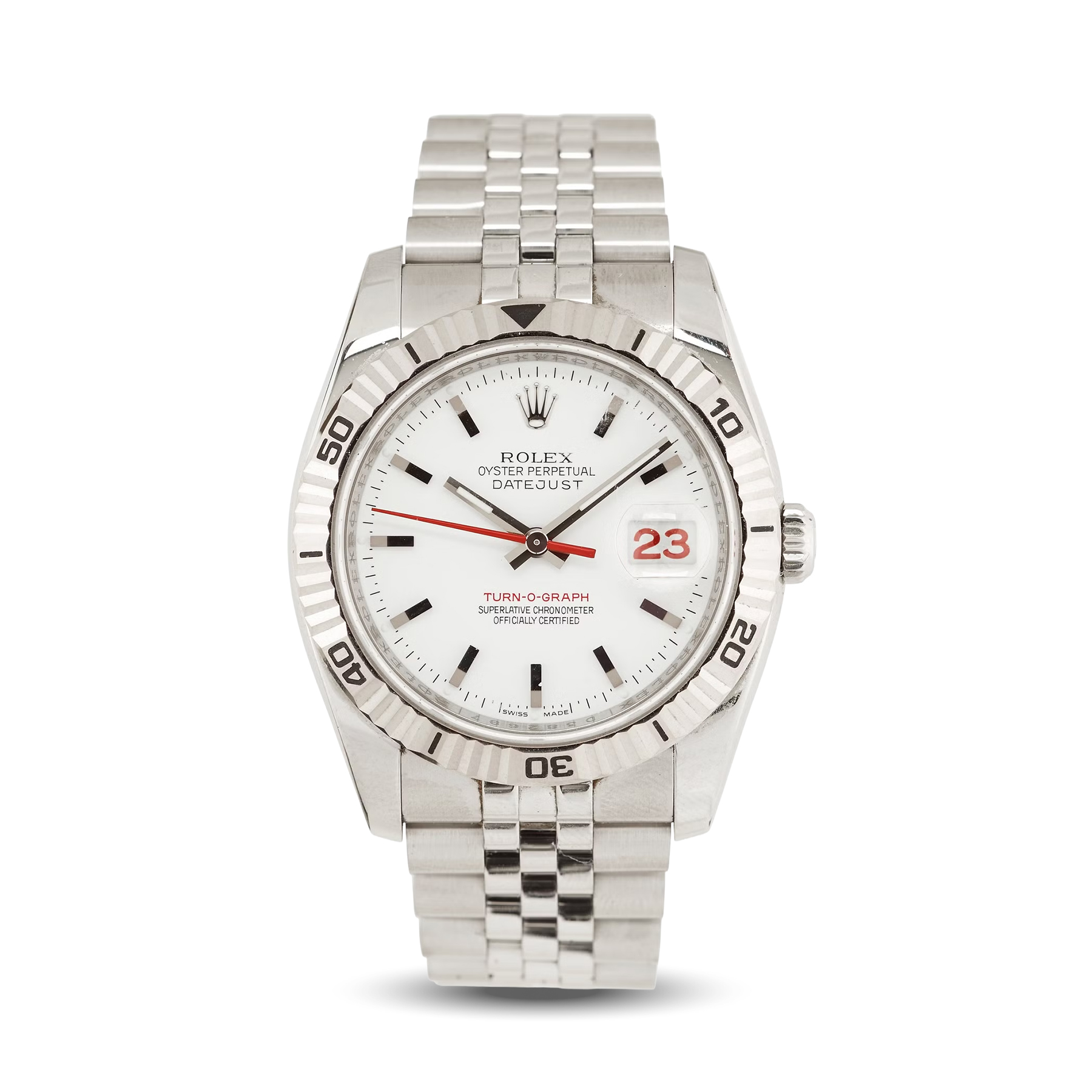 The Rolex Datejust Turn-O-Graph features a stainless steel case with rotating bezel and elegant dial. Classic and functional, ideal for daily collections.