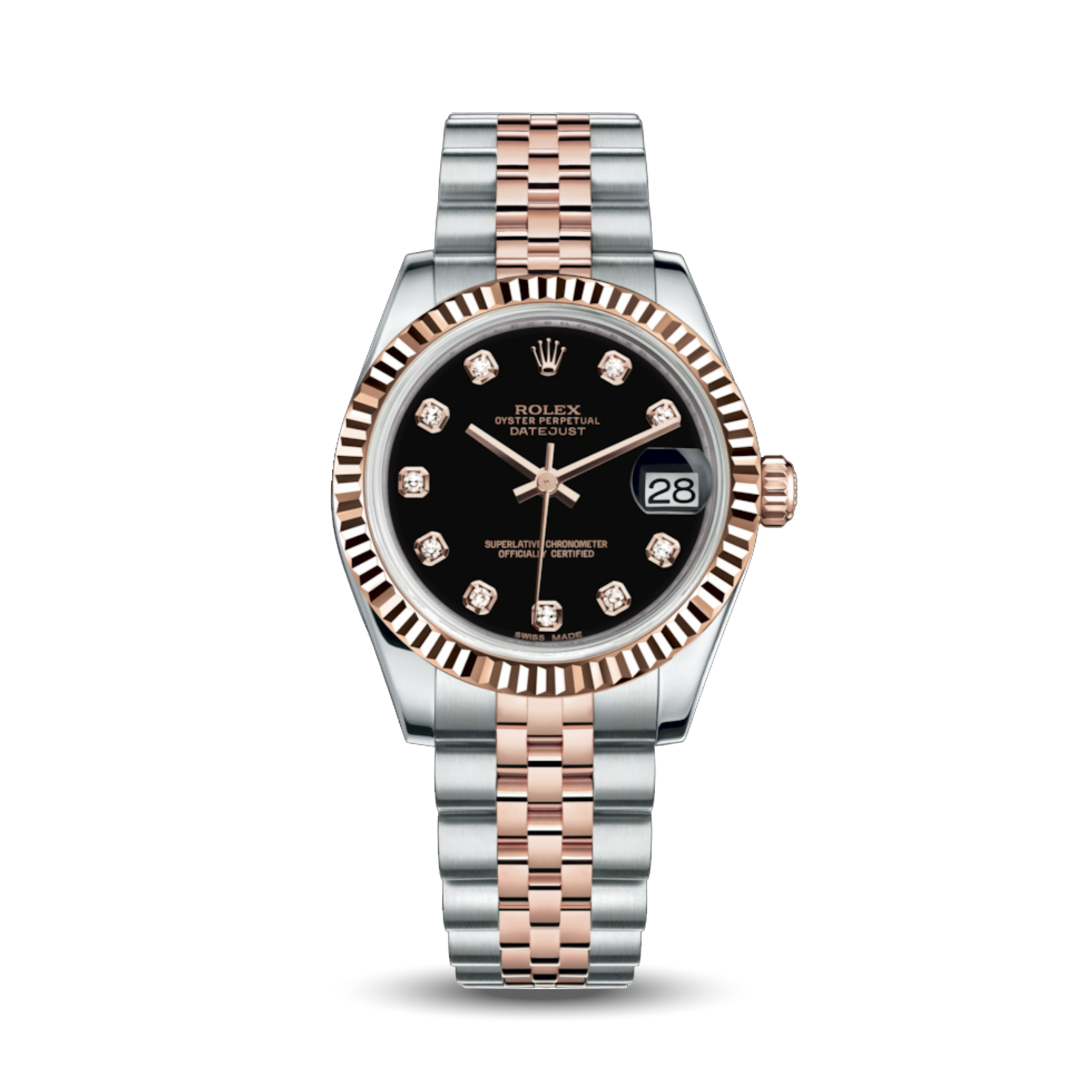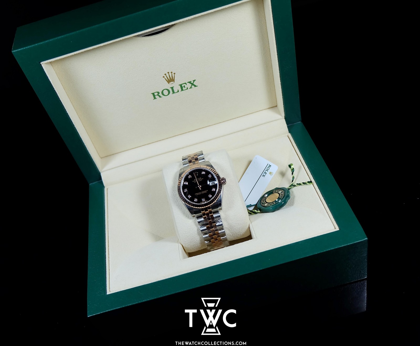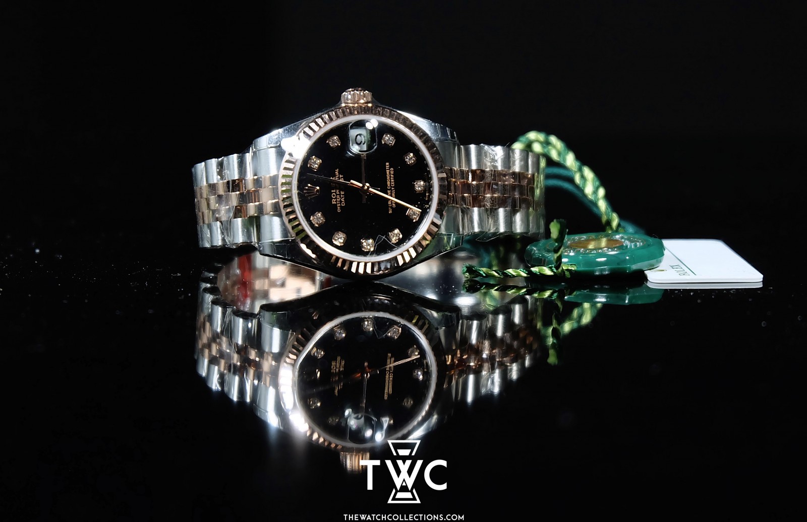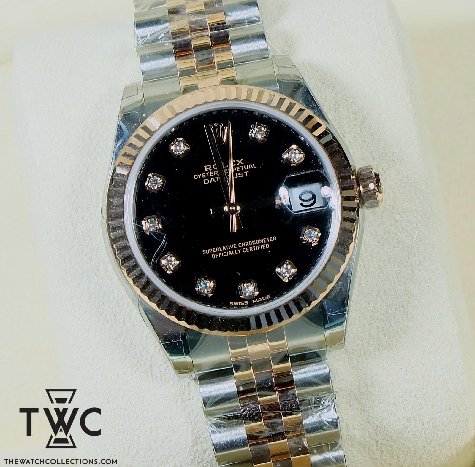 The Rolex Datejust Two Tone Rose Gold Boysize features a rose gold and stainless steel case with black dial and diamond indices. Luxurious and classic combination.