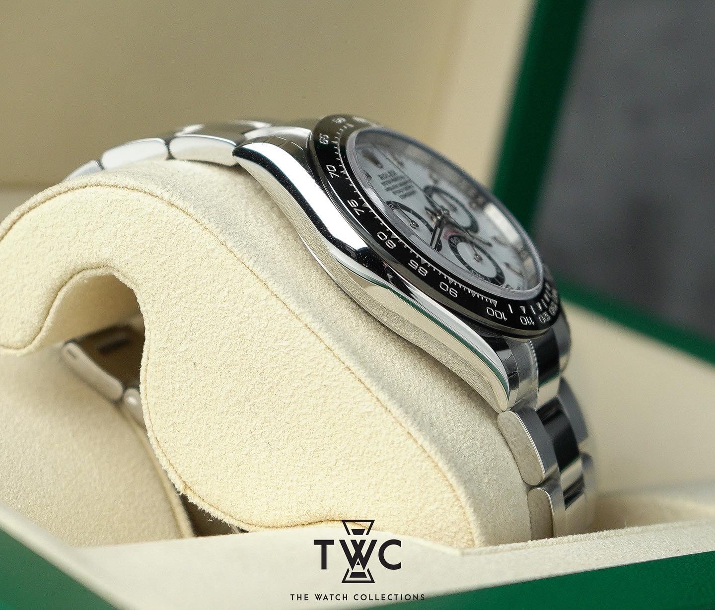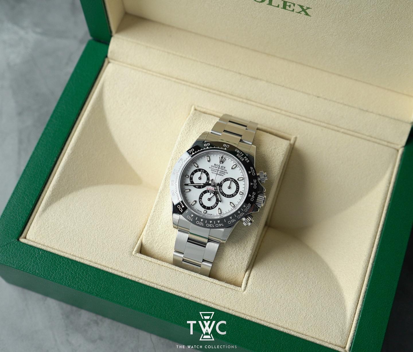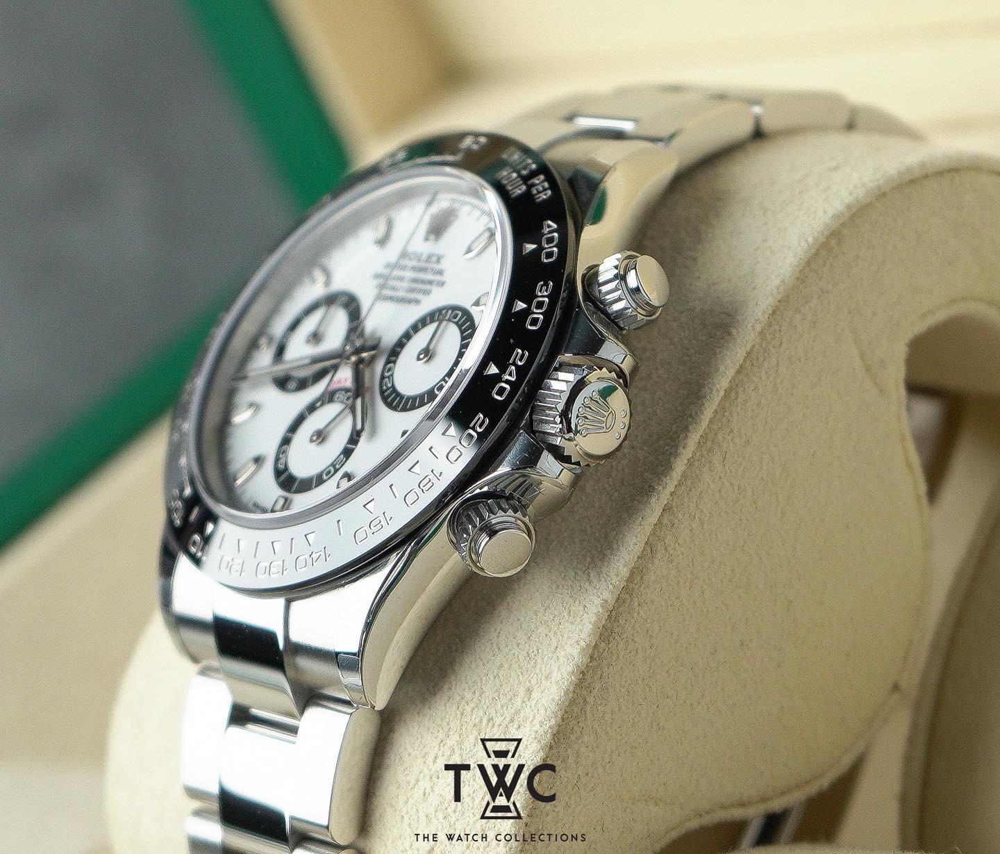 The Rolex Daytona 116500LN features a stainless steel case with white dial and black ceramic bezel. Sporty, elegant, and iconic.