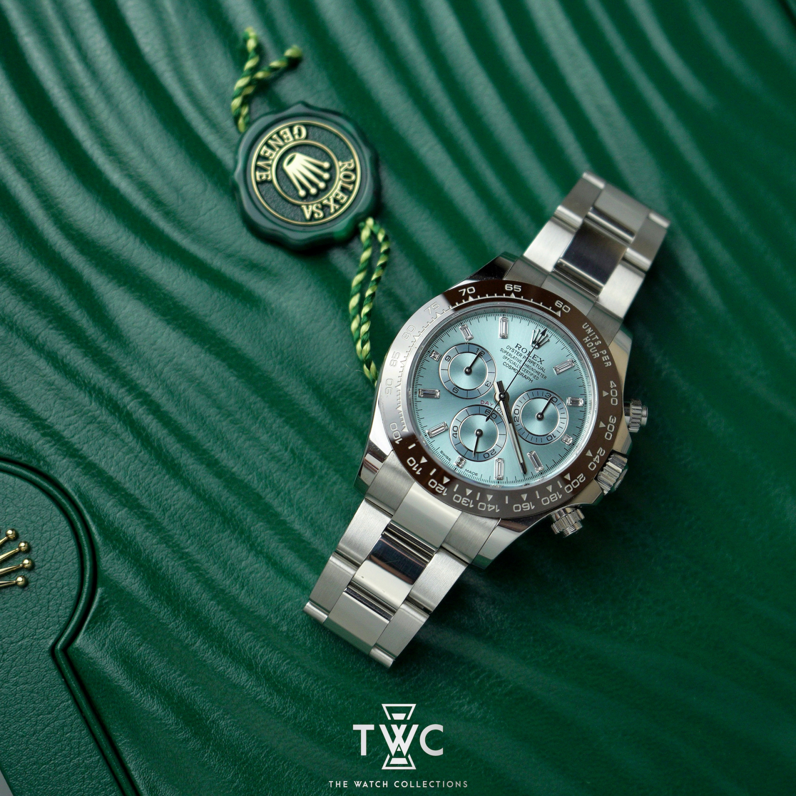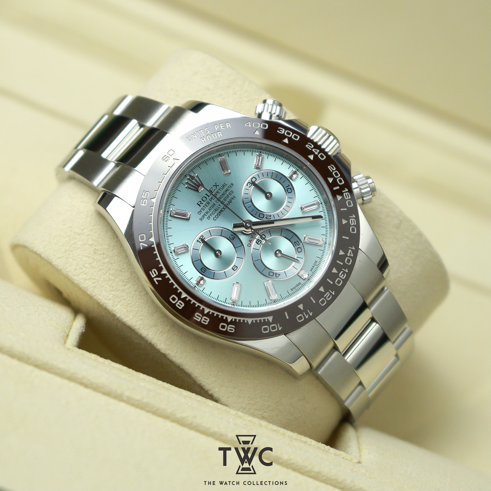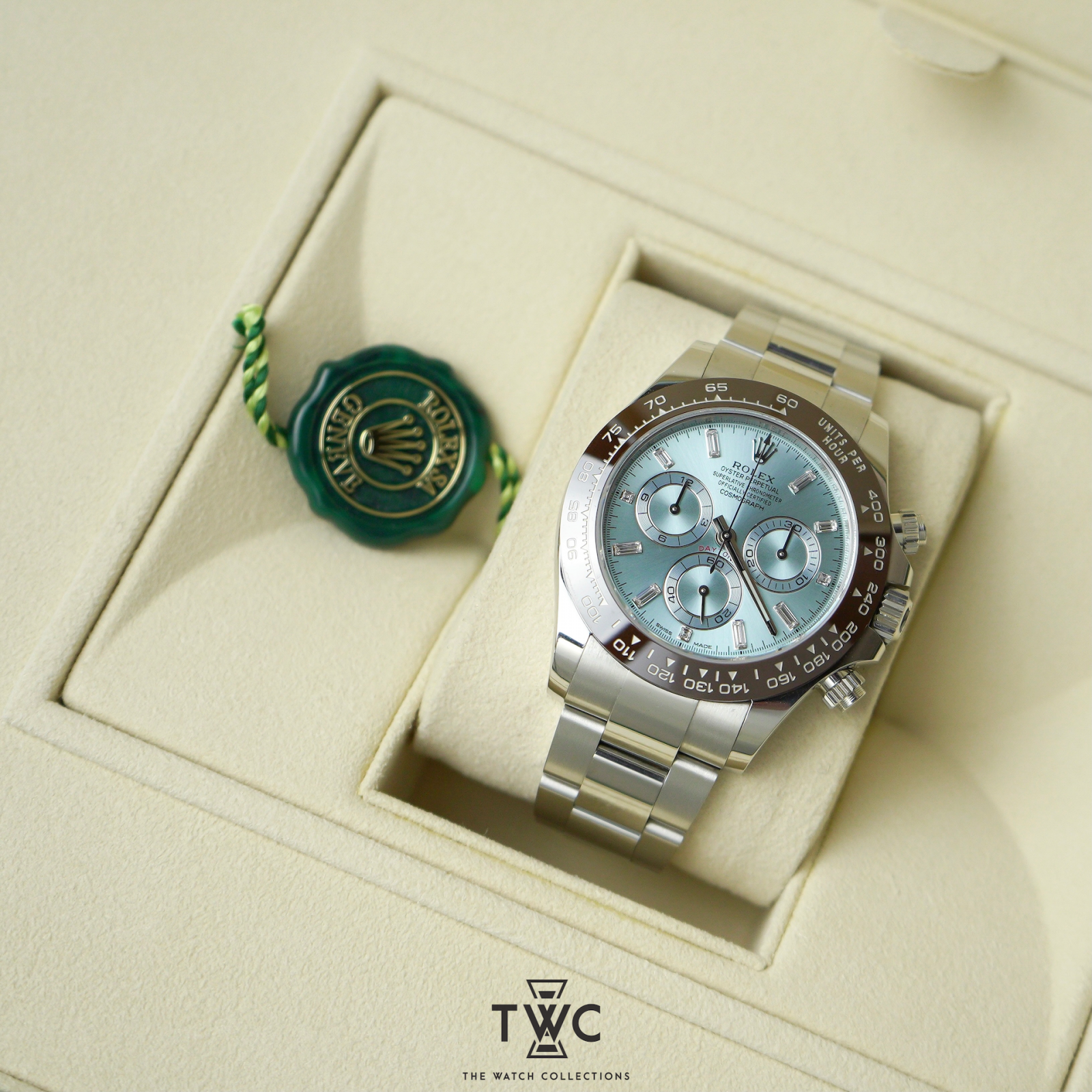 The Rolex Daytona 116506 features a platinum case with ice blue dial and baguette diamond indices. Luxurious, exclusive, and perfect for high-end collections.