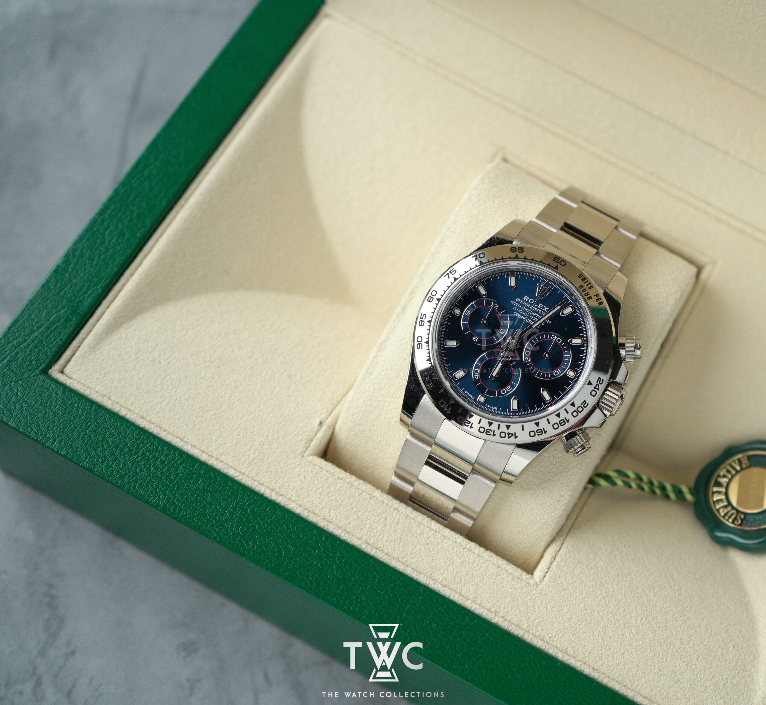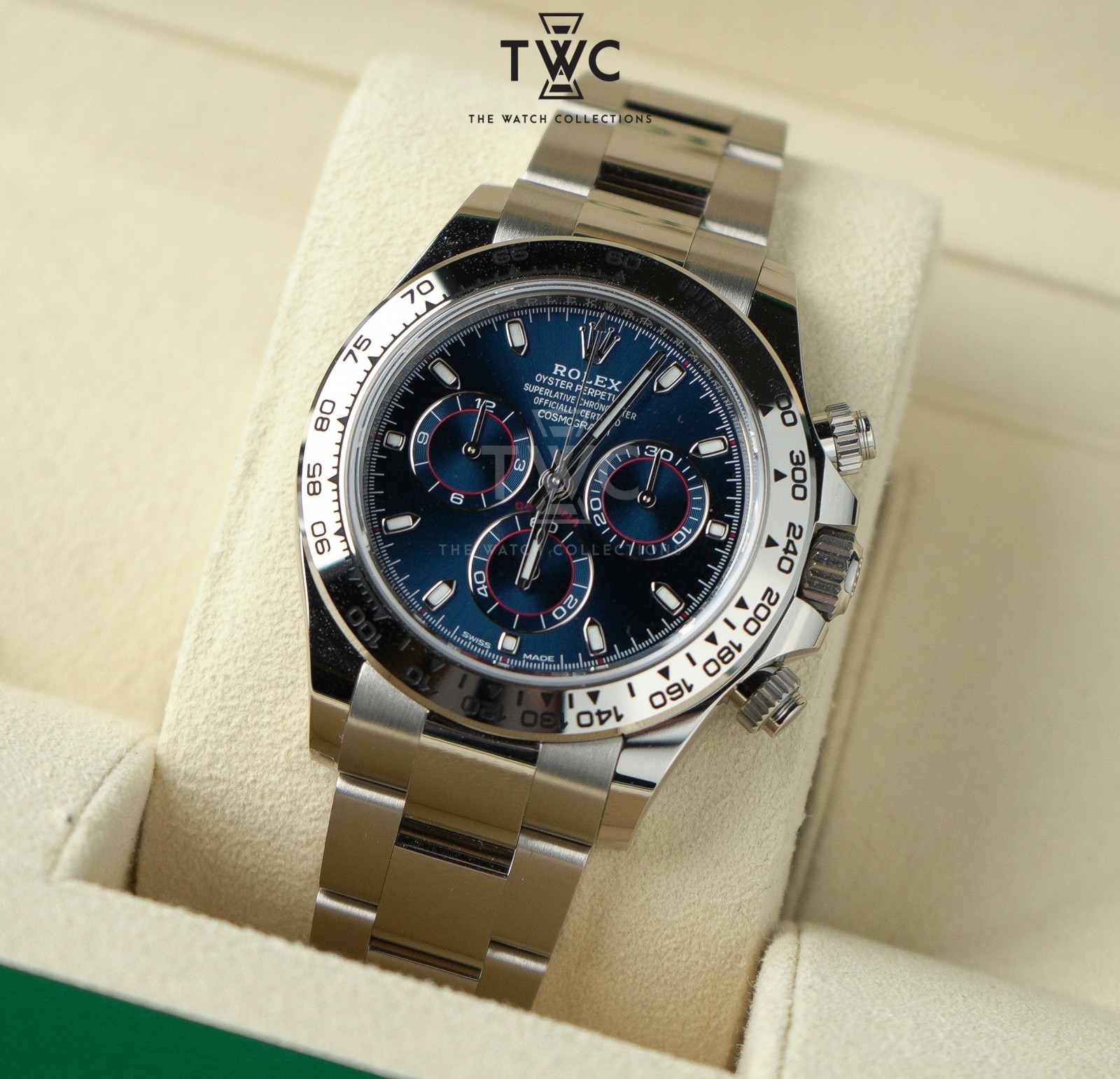 The Rolex Daytona White Gold Blue Dial ‘John Mayer’ features a white gold case with blue dial. Elegant, luxurious, and highly sought-after by collectors.
