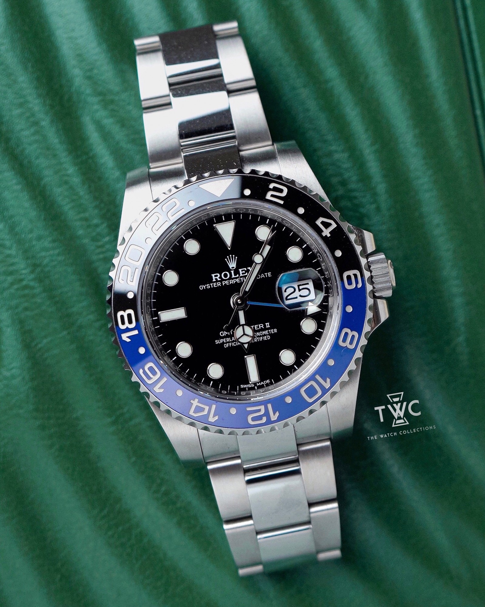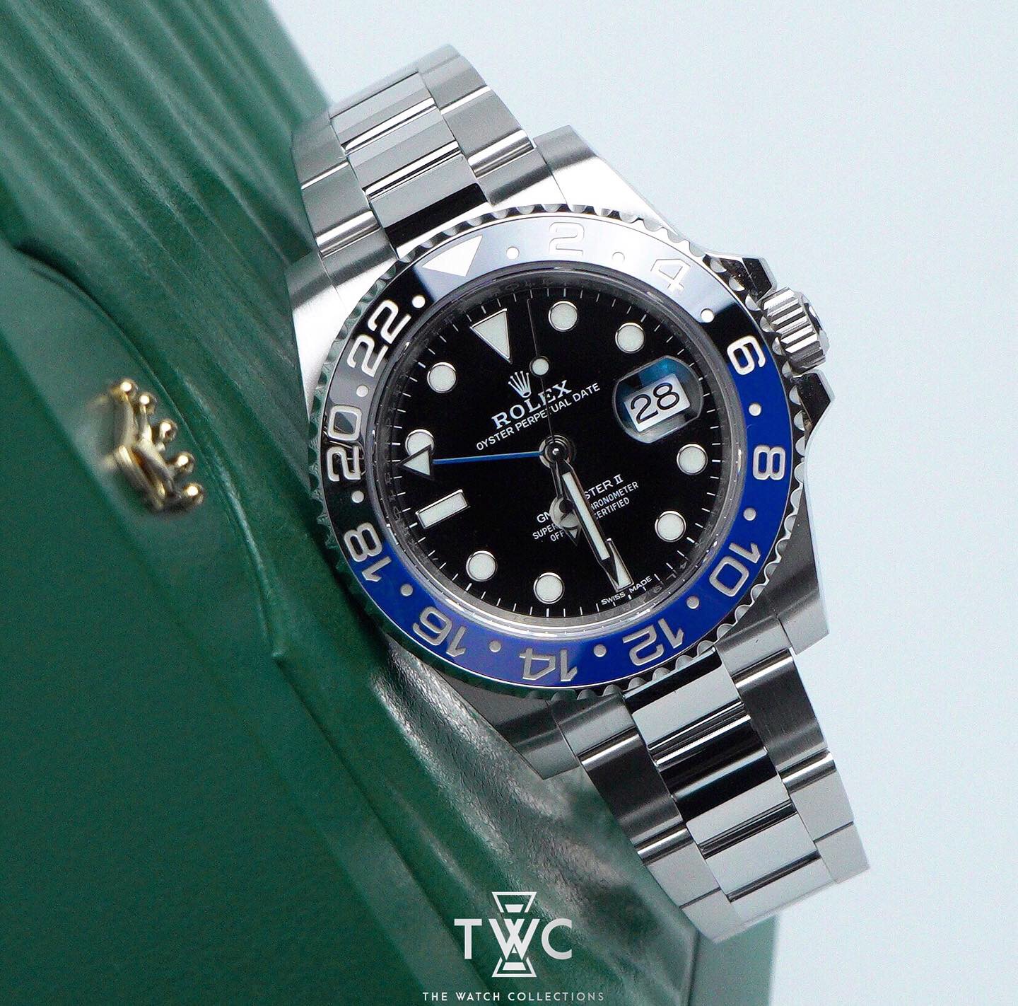 The Rolex GMT-Master II “Batman” ref. 116710BLNR is instantly recognizable by its iconic blue and black ceramic bezel, symbolizing day and night. Crafted in robust Oystersteel with a 40mm case, it offers exceptional durability and everyday wearability. The 24-hour GMT hand allows tracking of a second time zone simultaneously, making it a highly sought-after model among travelers and modern Rolex sports watch collectors.