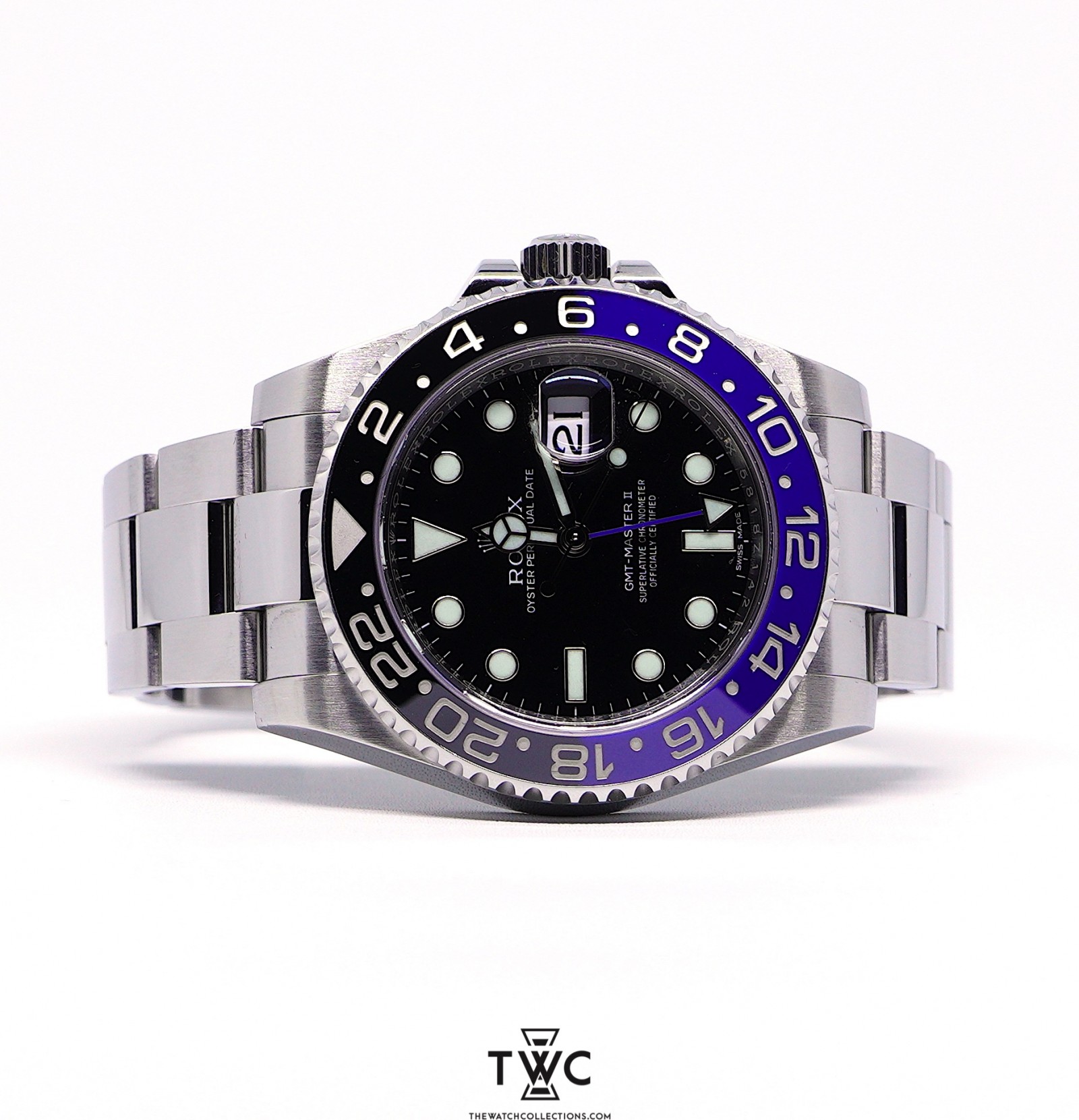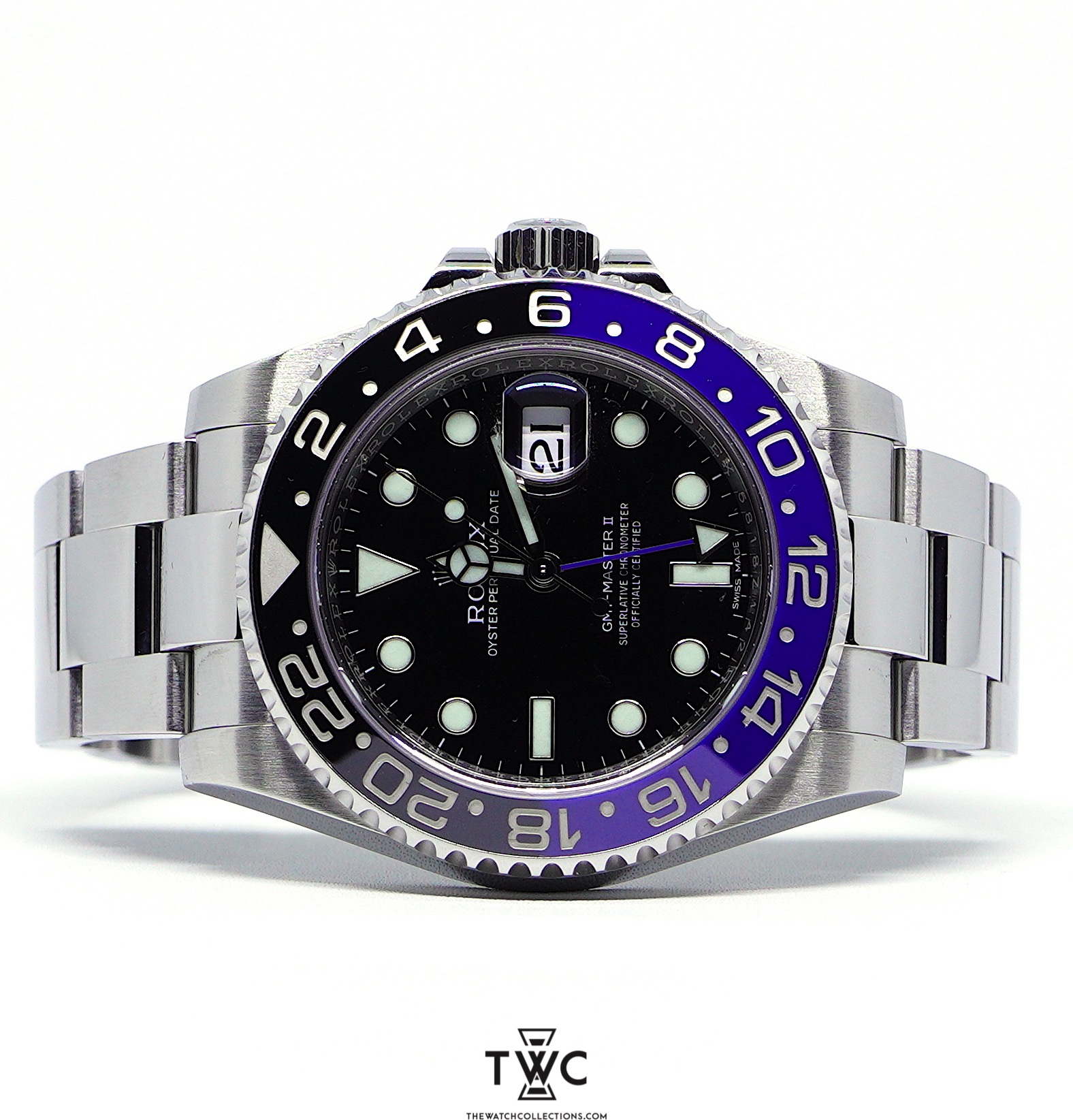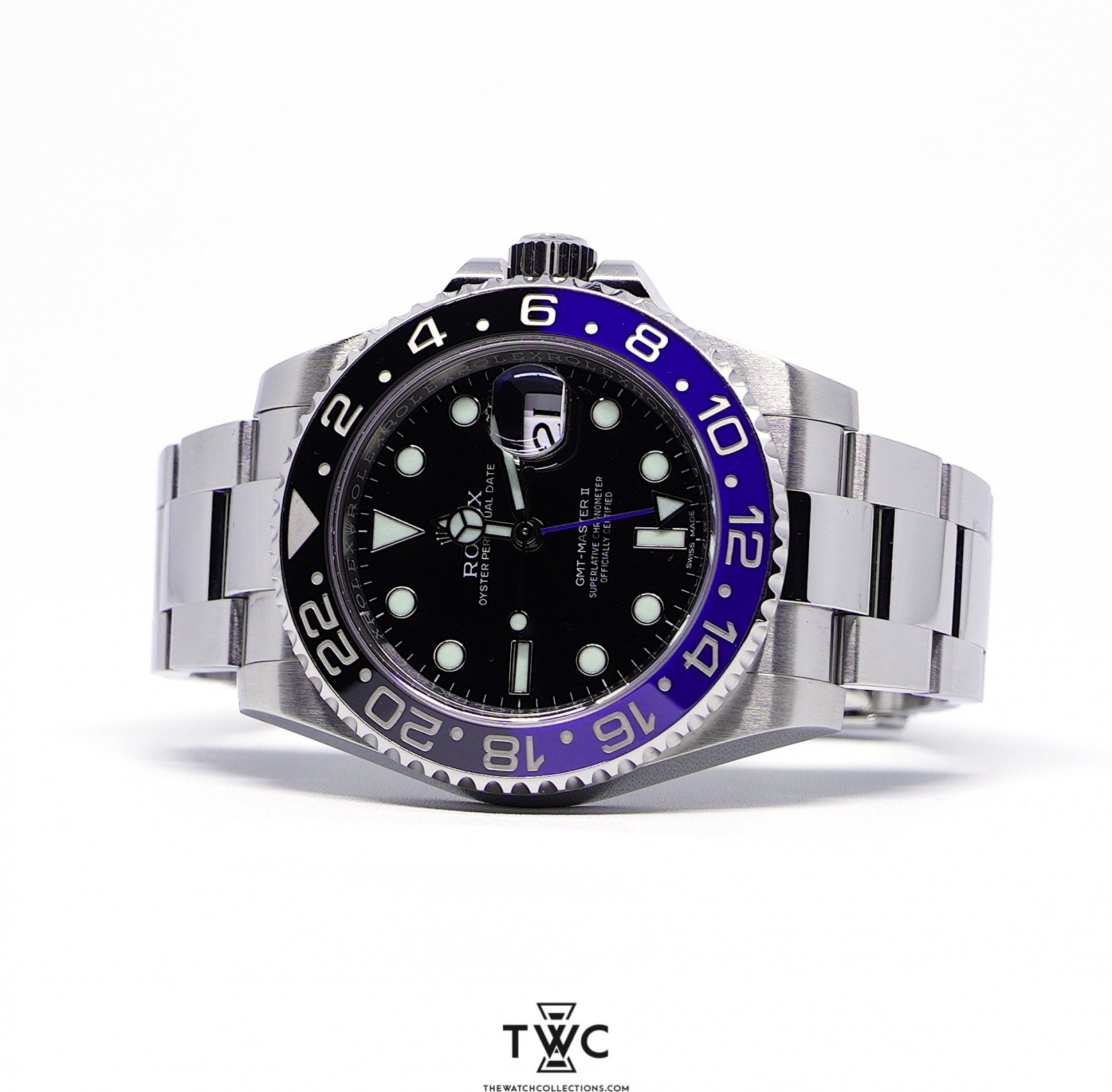 The GMT-Master II Batman (2016) features the iconic blue and black bezel on a stainless steel case. It has a black dial with clear hands and indices for easy time reading. The Oyster bracelet offers comfort and a refined look. This model is ideal for collectors seeking a sporty watch with high value and distinctive recognition in horology.