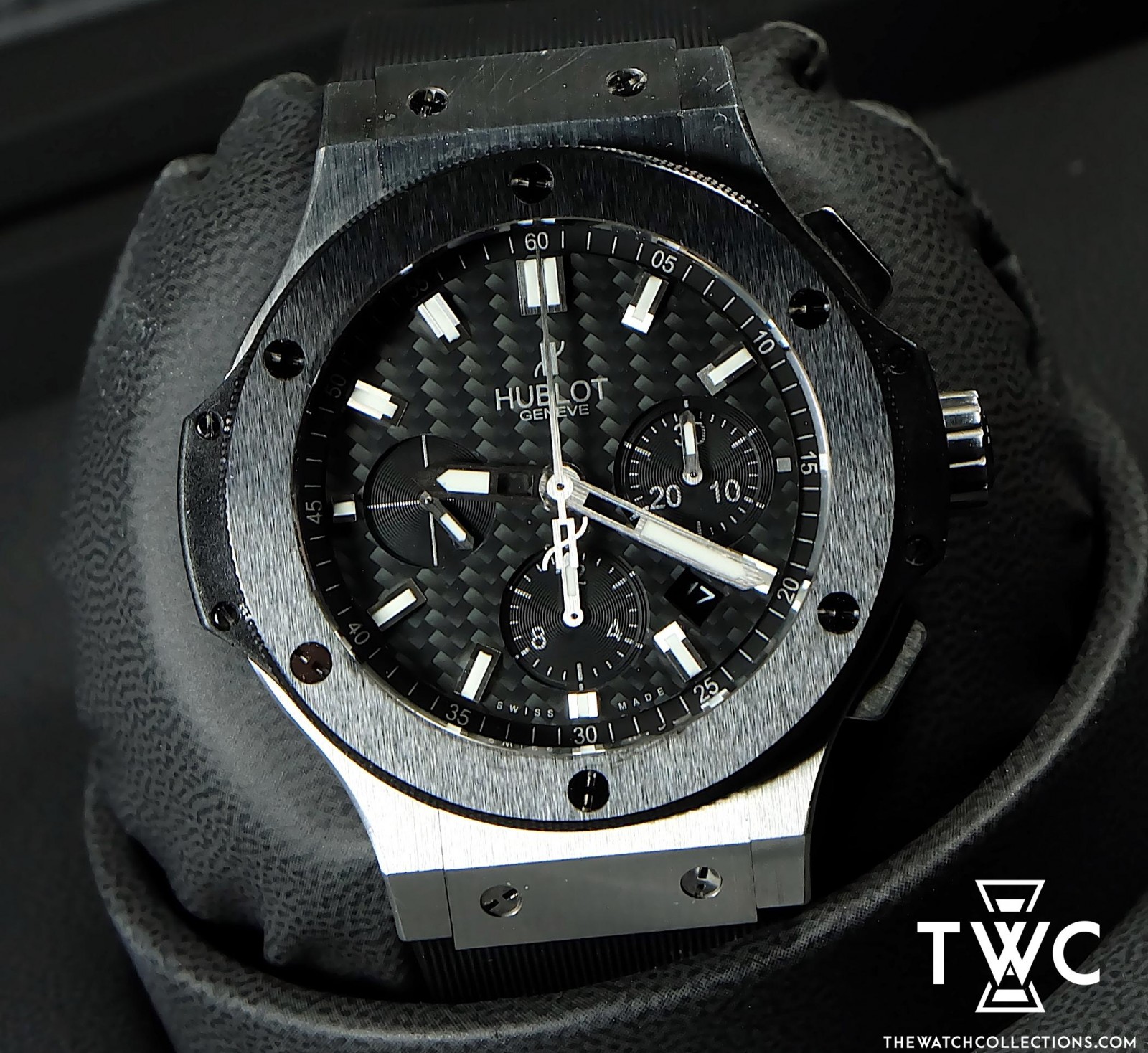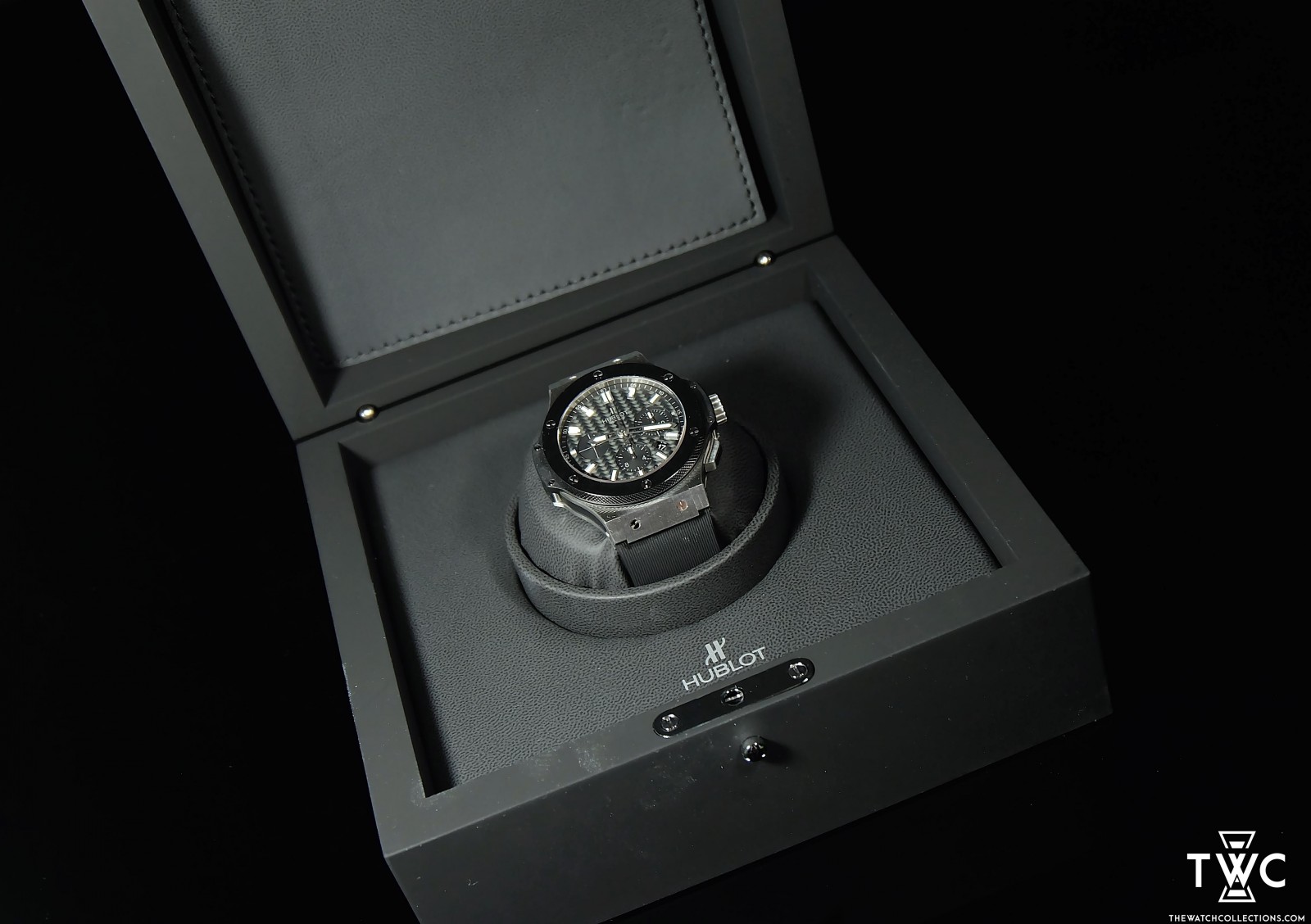 The Hublot Bigbang Evolution features a black case with skeleton dial and rubber strap. Sporty and modern, ideal for contemporary high-end collections.