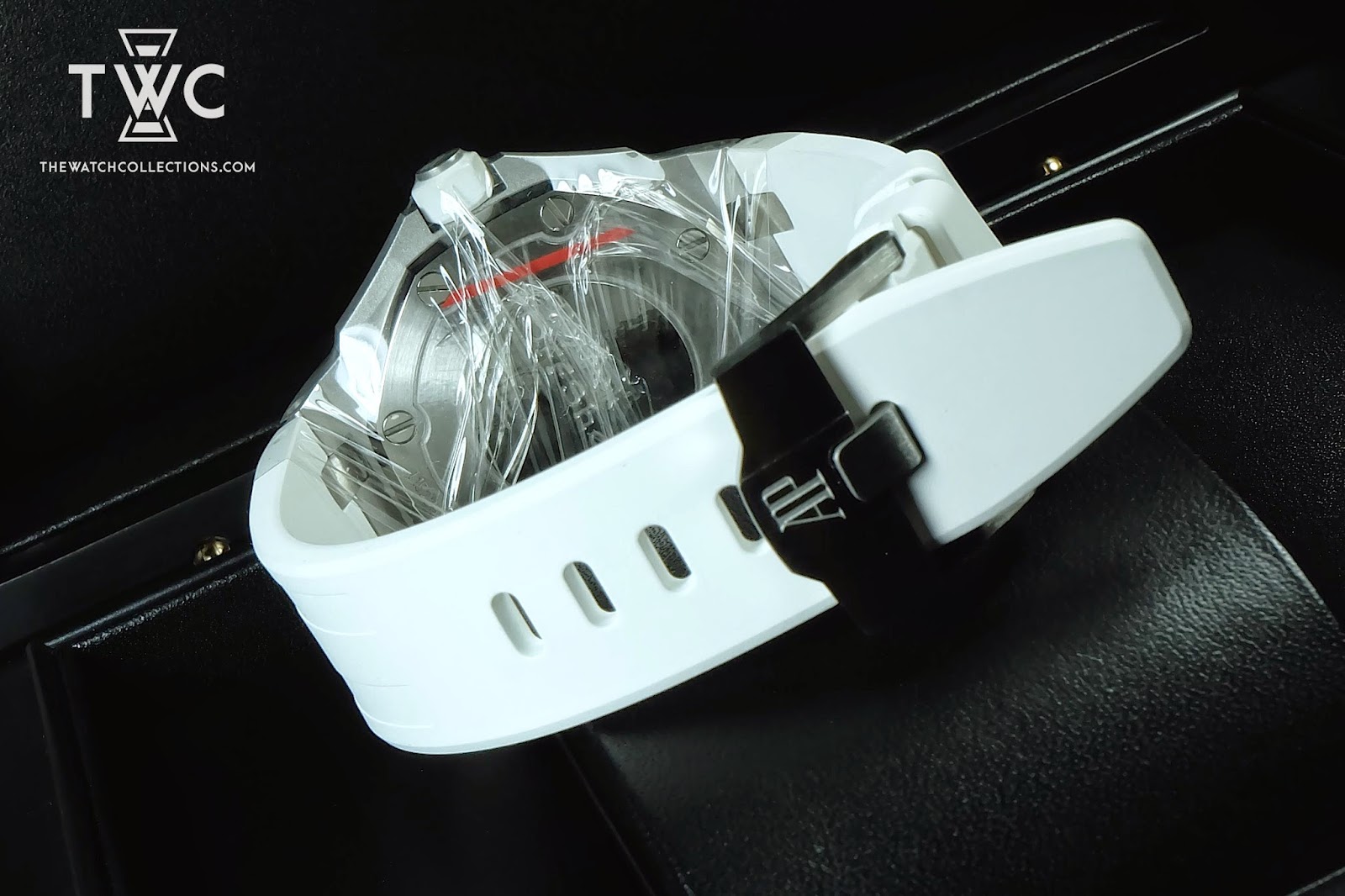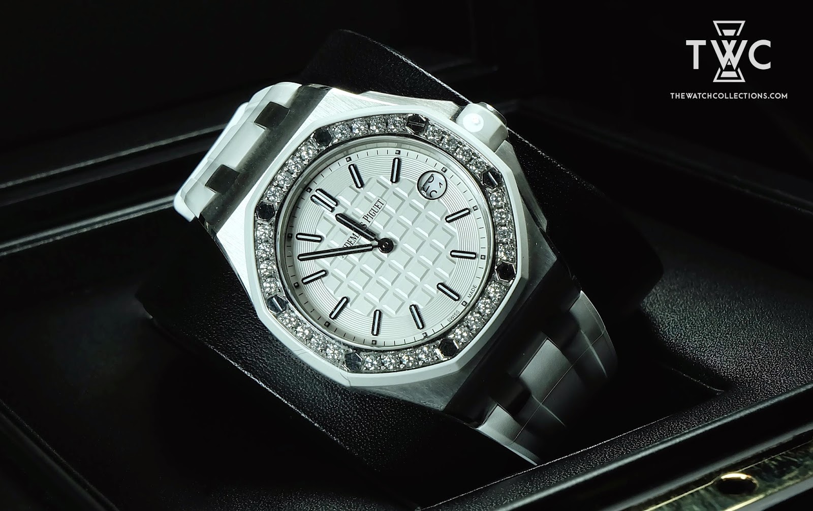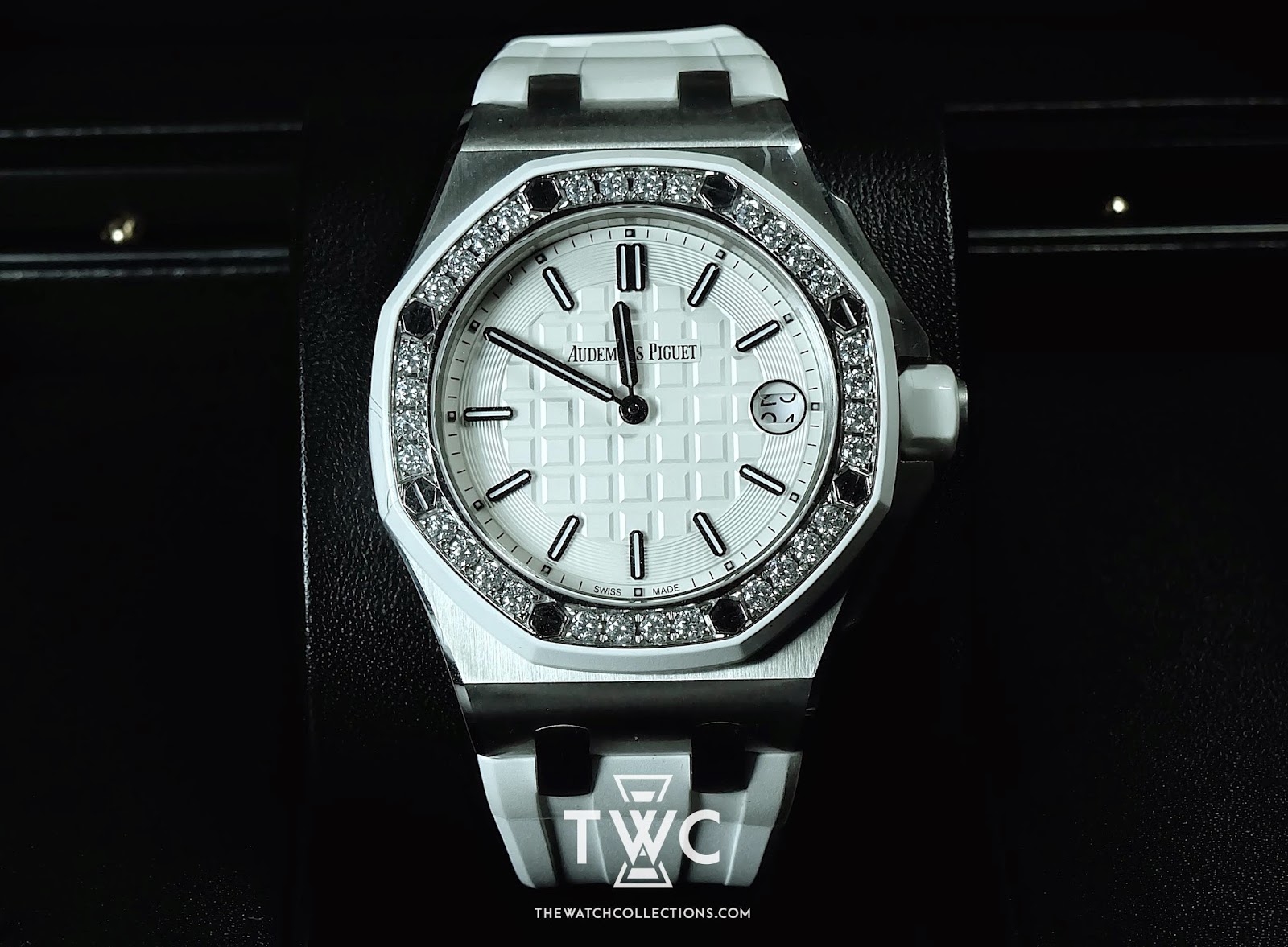 The Audemars Piguet Ladies Royal Oak Offshore Quartz Diamond features the iconic Offshore design in an elegant 37mm stainless steel case with a diamond-set bezel. Its white dial with bold Arabic numerals offers excellent legibility while maintaining a sporty yet feminine character. Blending the robust Offshore identity with refined diamond detailing, this model delivers a distinctive luxury sports watch aesthetic.