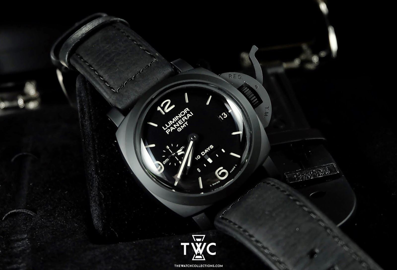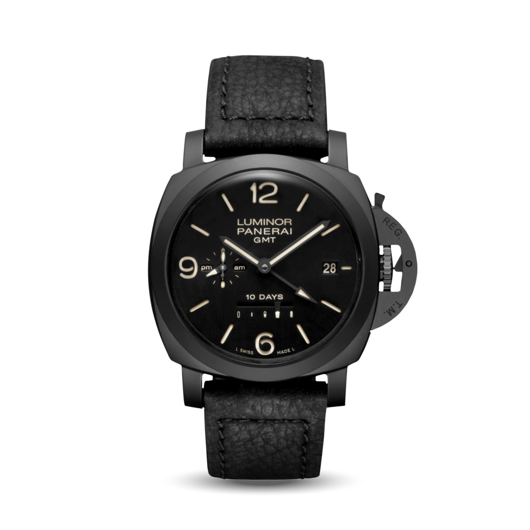 The Panerai Luminor 1950 10 Days GMT Ceramica showcases an iconic tool watch design with a modern ceramic 44mm case. Its black dial with signature Arabic numerals ensures excellent legibility and a bold presence. Featuring a GMT function and an impressive 10-day power reserve, this timepiece is built for performance and collectability. A standout Panerai model that blends technical strength with unmistakable design.