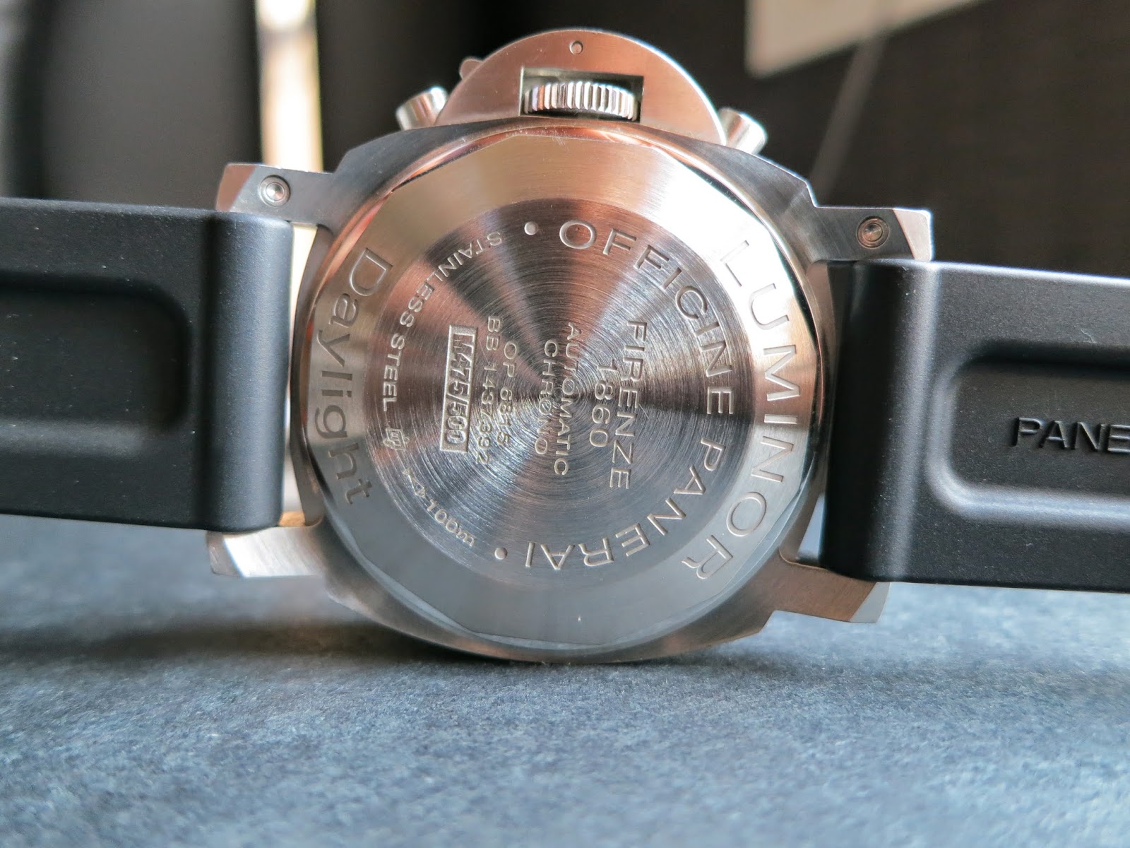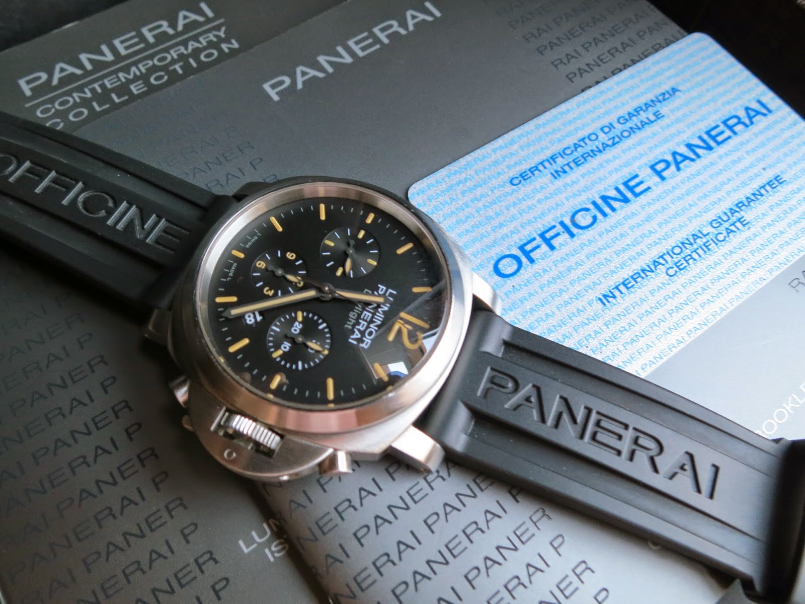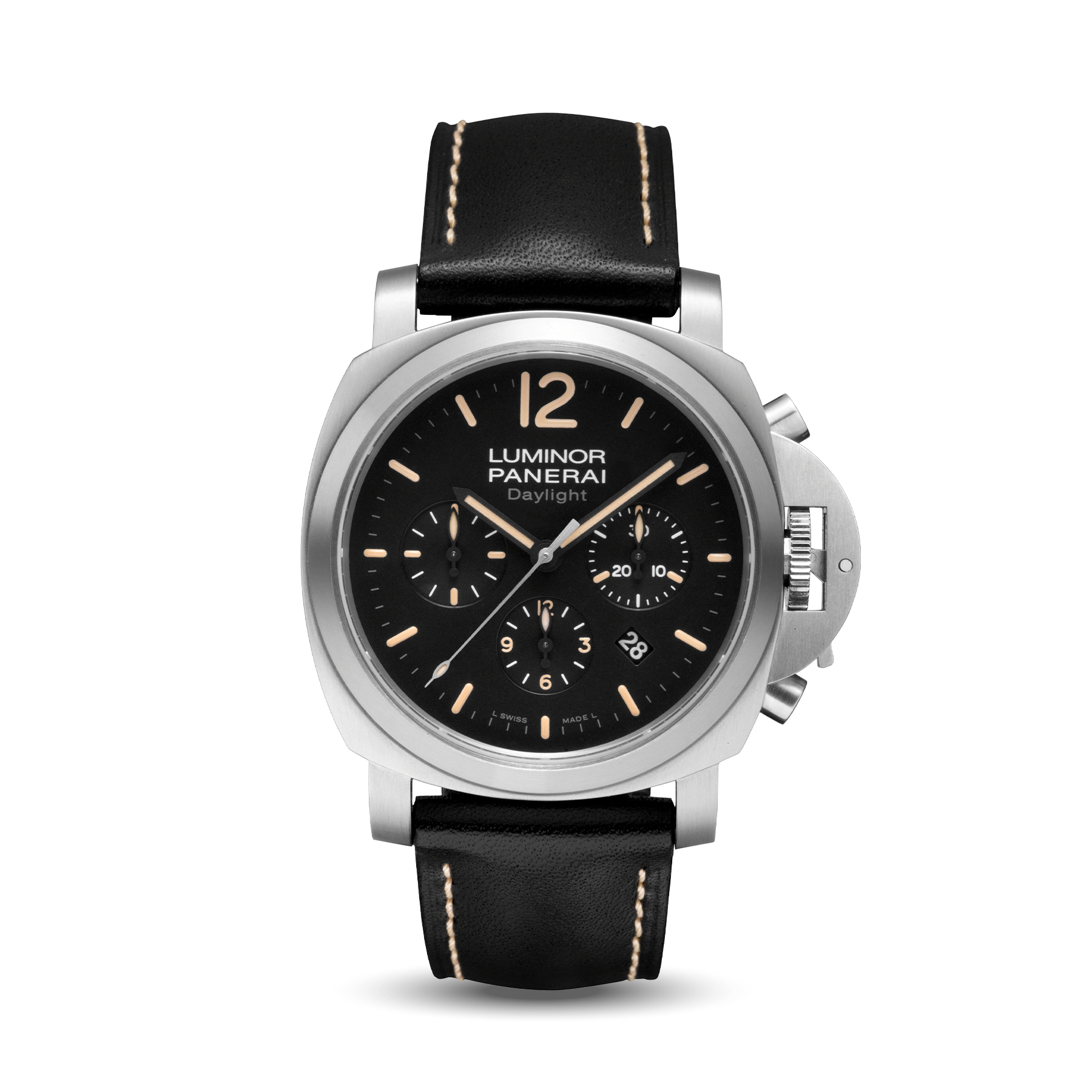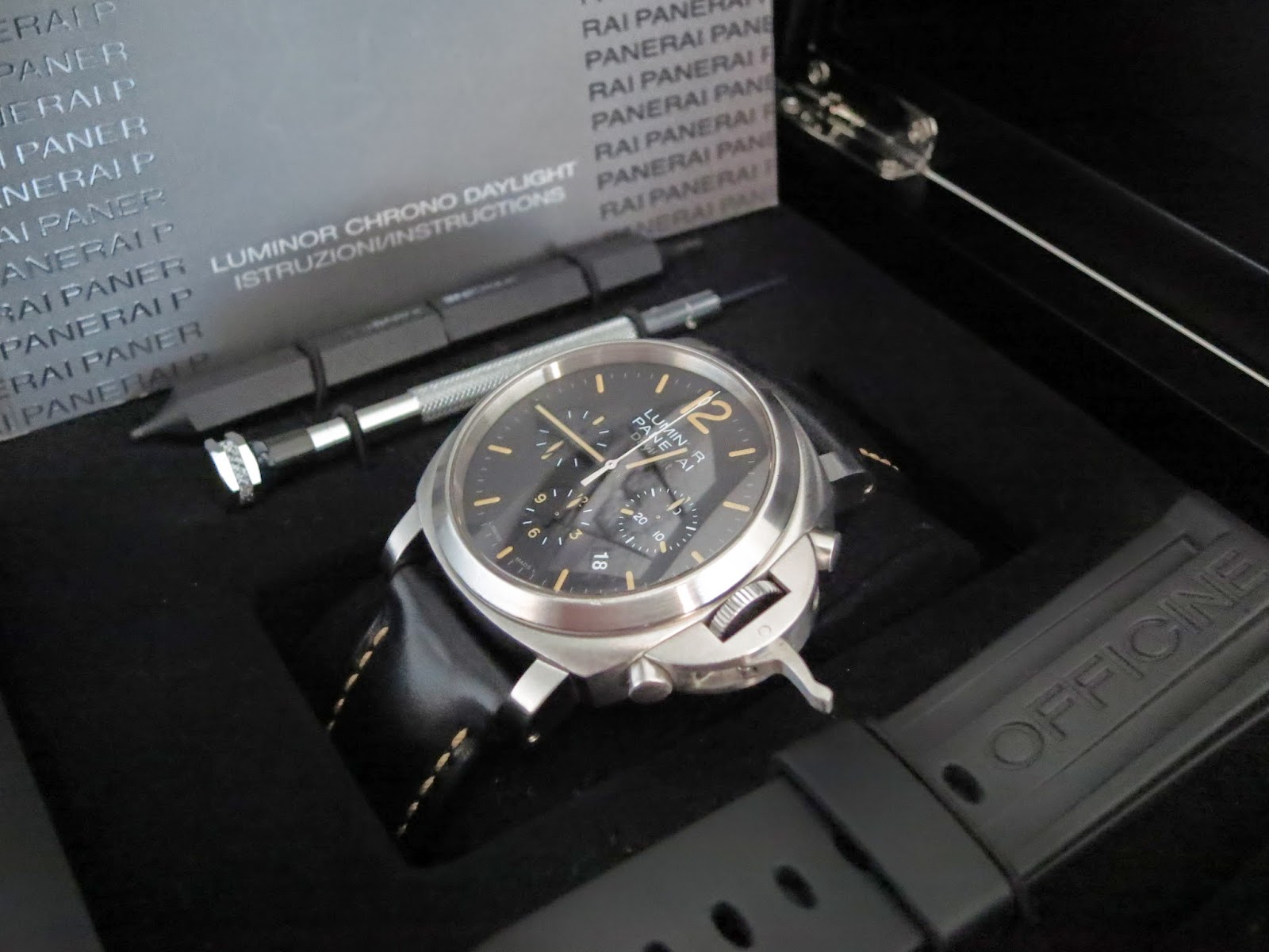 The Panerai Luminor Chrono Daylight PAM356 features a stainless steel case and black dial with chronograph. It combines Panerai’s ruggedness with sporty design.
