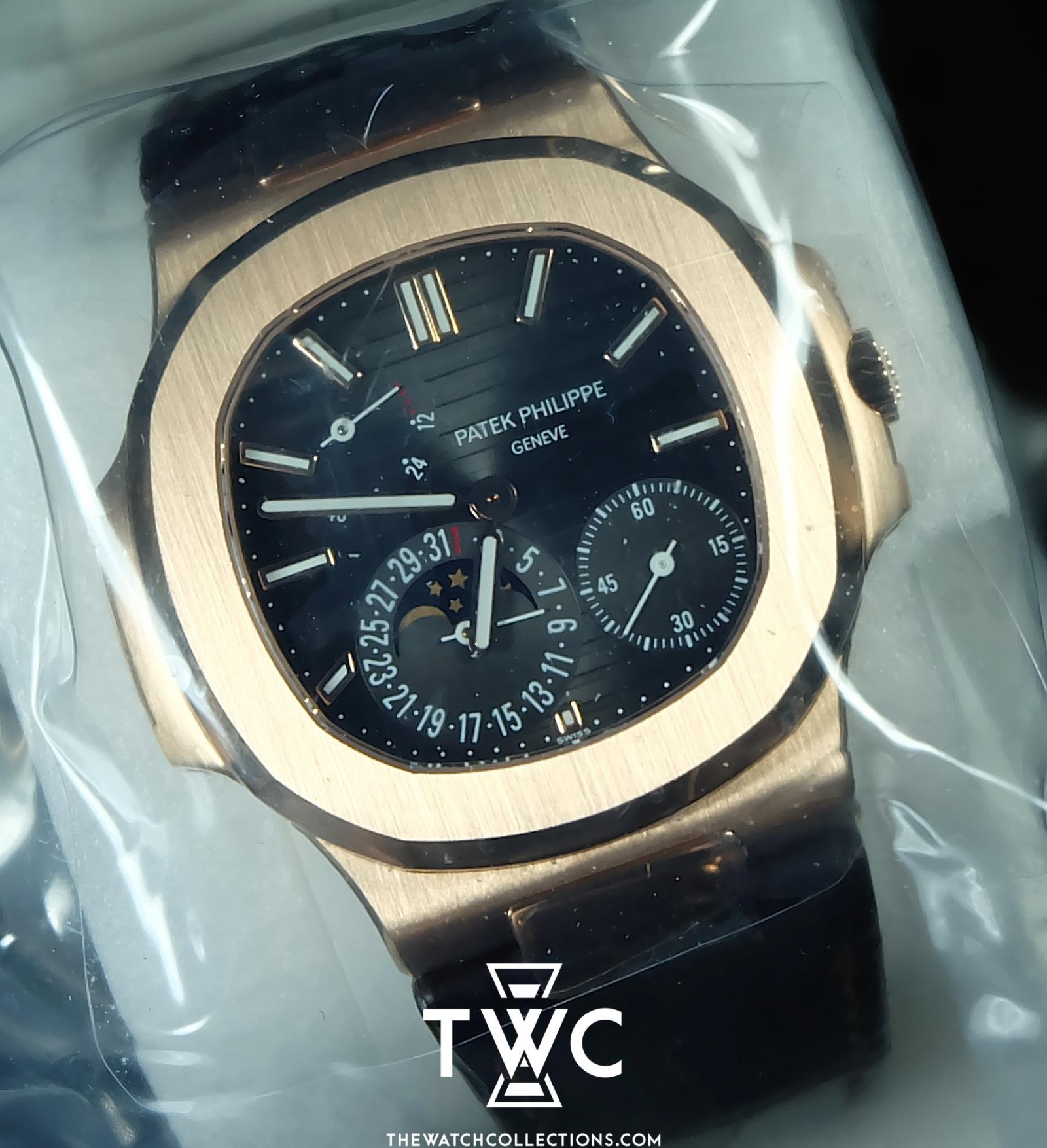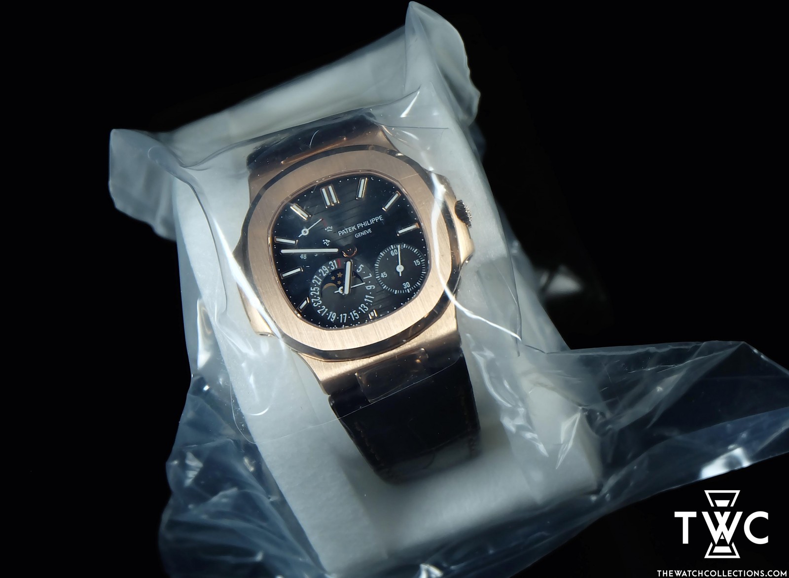 The Patek Philippe Nautilus 5712R represents a haute horlogerie interpretation of the iconic Nautilus design, crafted in luxurious rose gold. The brown dial features an asymmetrical layout with power reserve, moonphase, and date complications, offering a distinctive technical character while maintaining refined elegance. Paired with a leather strap and powered by the legendary ultra-thin automatic movement, this timepiece perfectly balances sporty luxury with Patek Philippe’s exceptional craftsmanship.