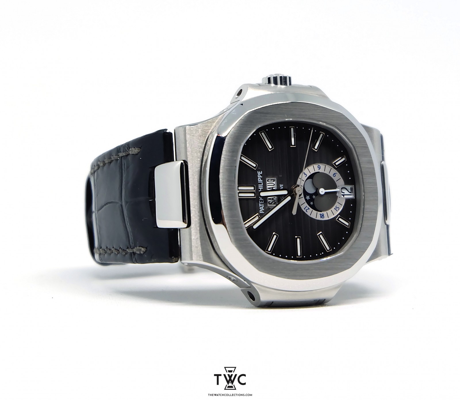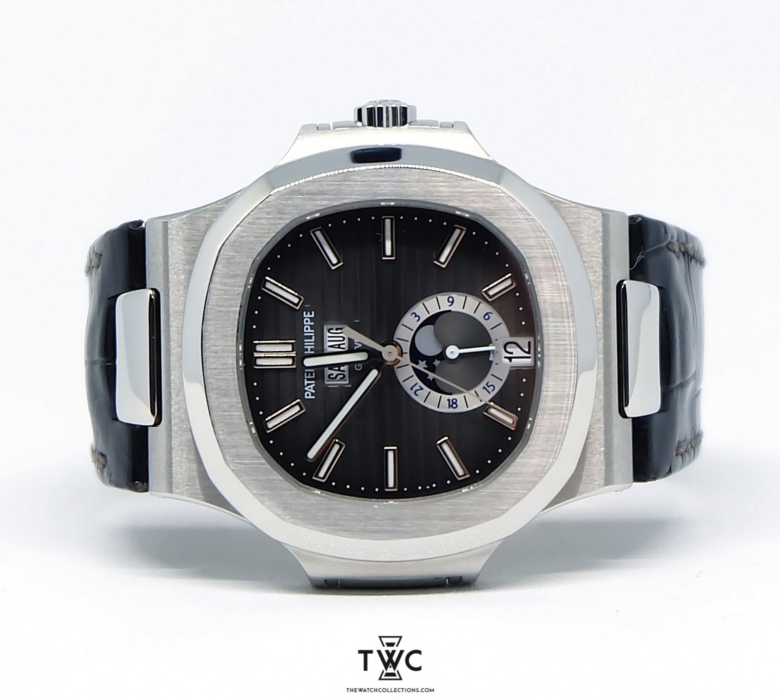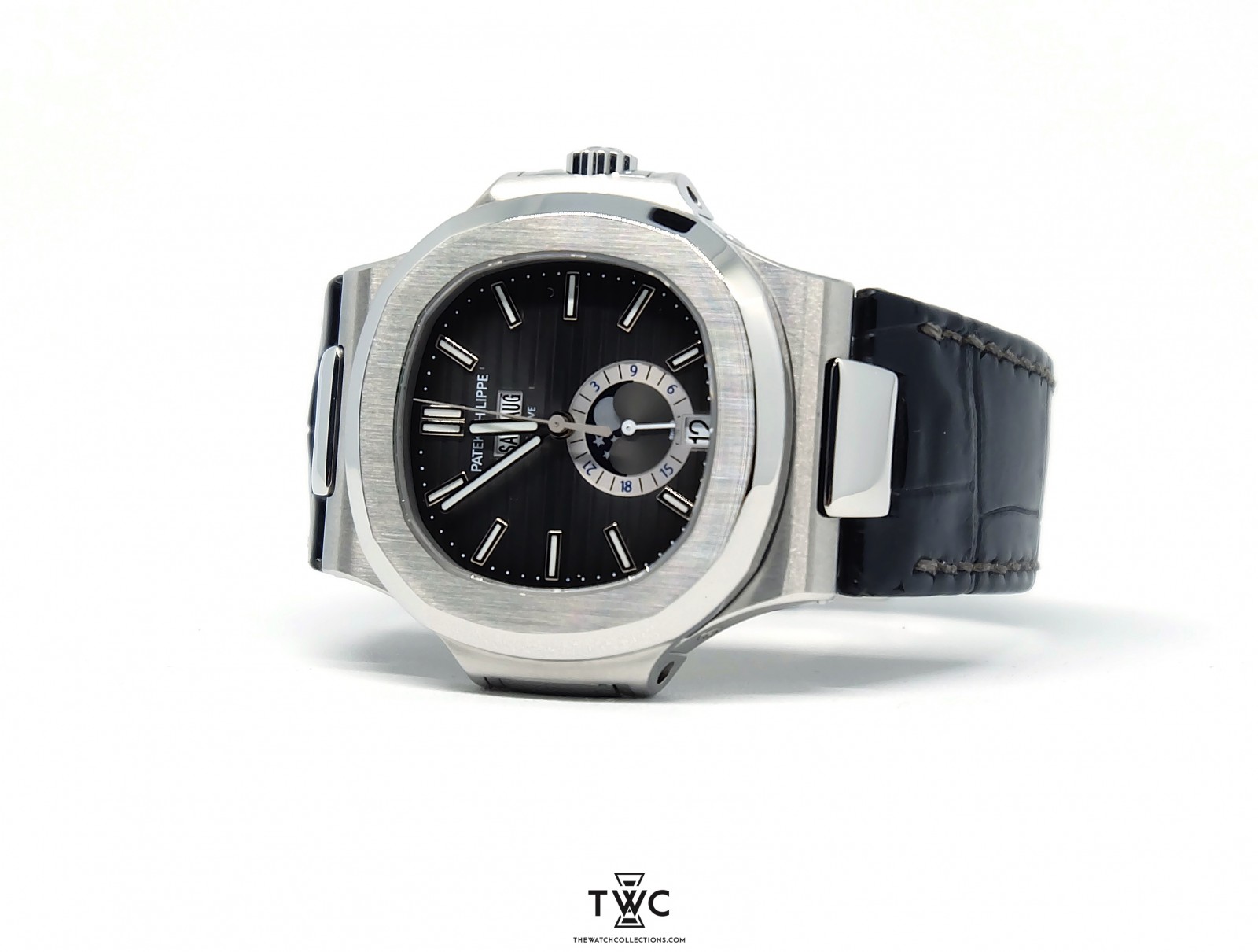 The Patek Philippe Nautilus Annual Calendar ref. 5726A perfectly blends the iconic sporty Nautilus design with a highly practical calendar complication. Housed in a stainless steel case with the signature horizontally embossed dial, this model features an annual calendar displaying day, date, and month, complemented by a moonphase and 24-hour indicator. Designed for everyday elegance with true haute horlogerie craftsmanship, the Nautilus 5726A delivers an ideal balance between refined aesthetics and advanced mechanical functionality. With a comfortable 40.5mm case diameter, it remains one of the most sought-after Nautilus references among collectors seeking added complication without compromising the collection’s sporty DNA.