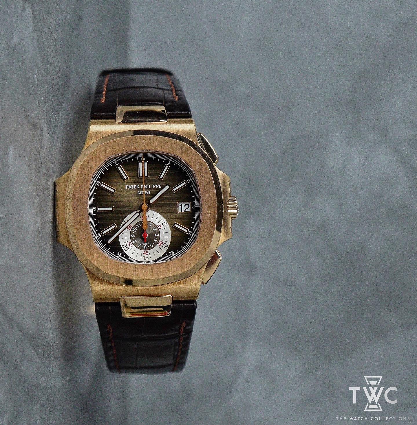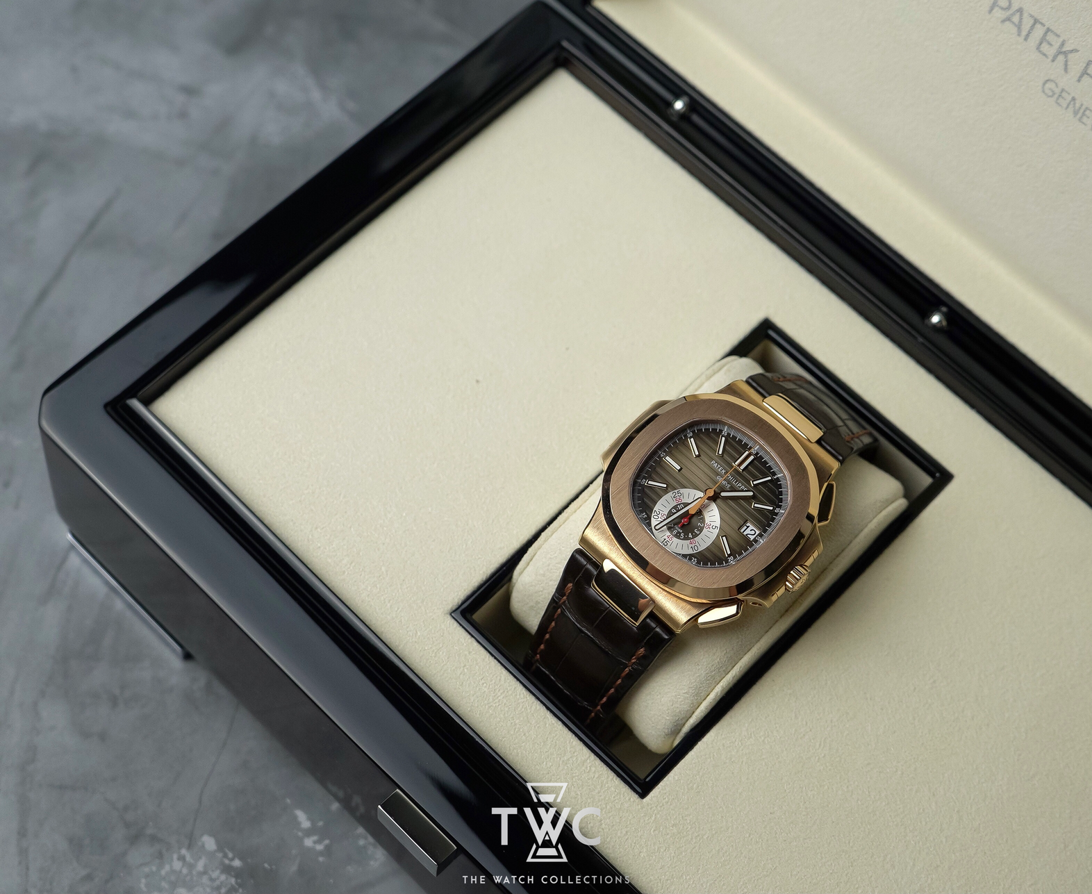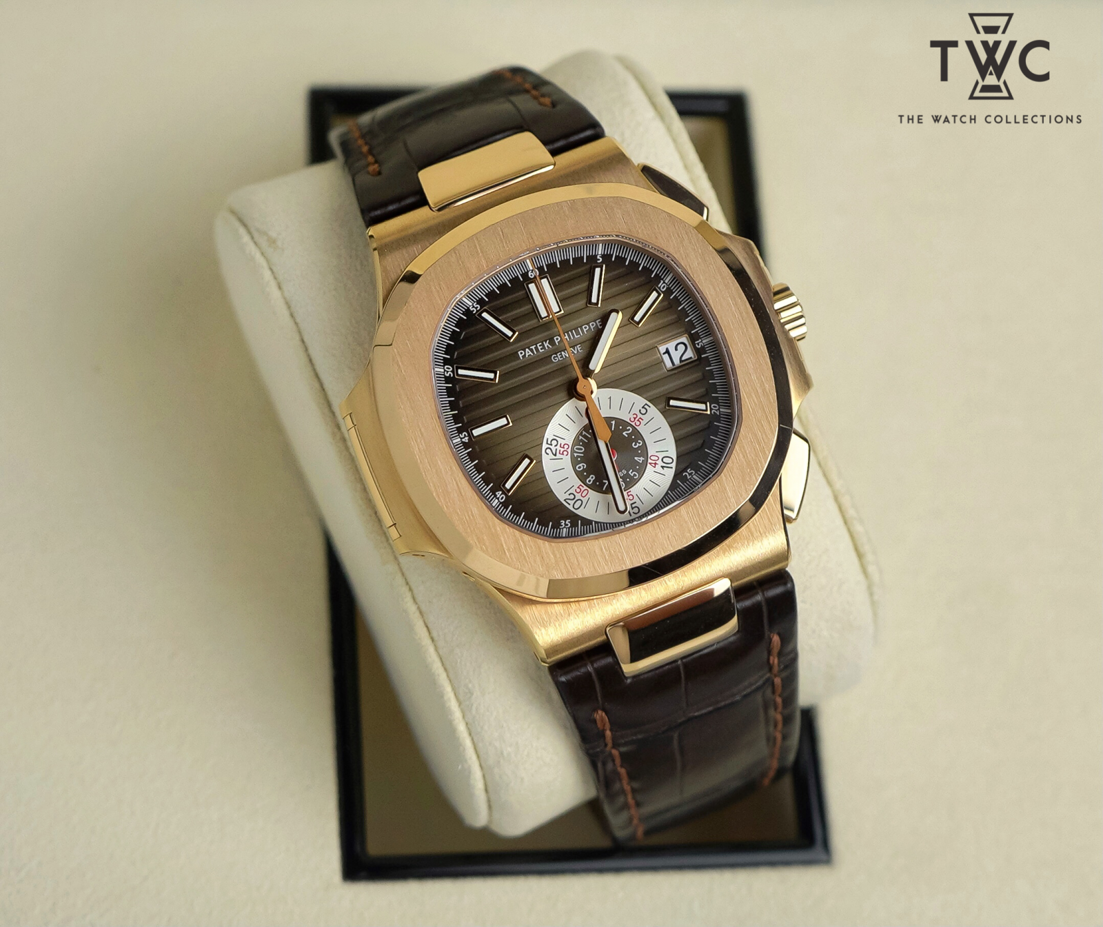 The Patek Philippe Nautilus 5980R features a rose gold case with blue chronograph dial and leather strap. Elegant and sporty combination, ideal for prestigious collections.