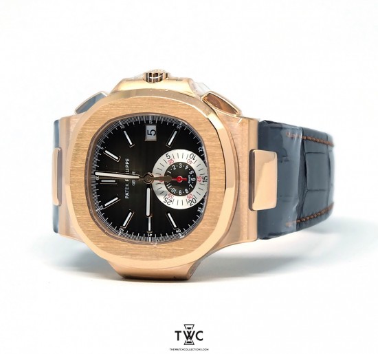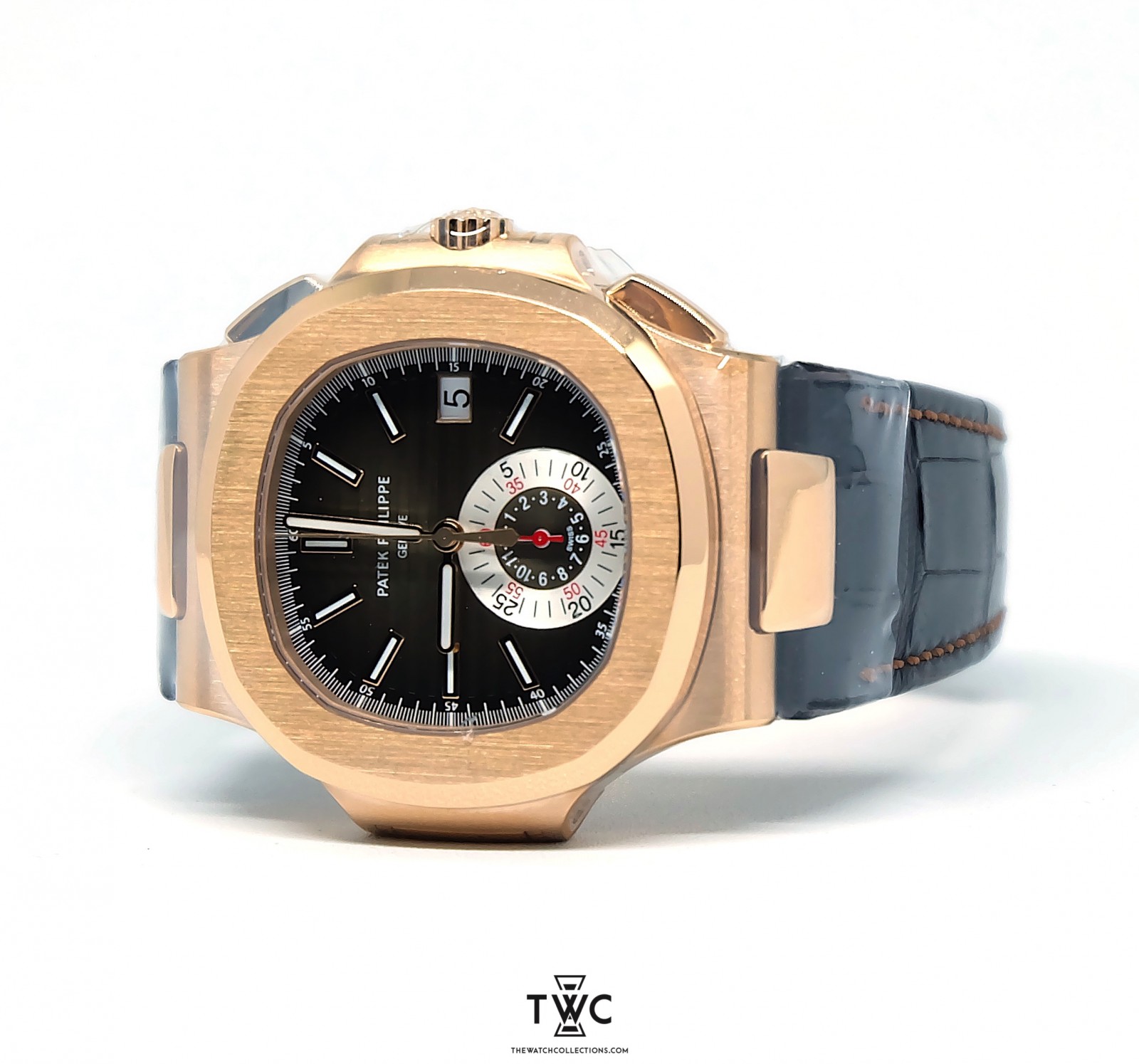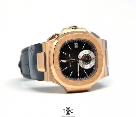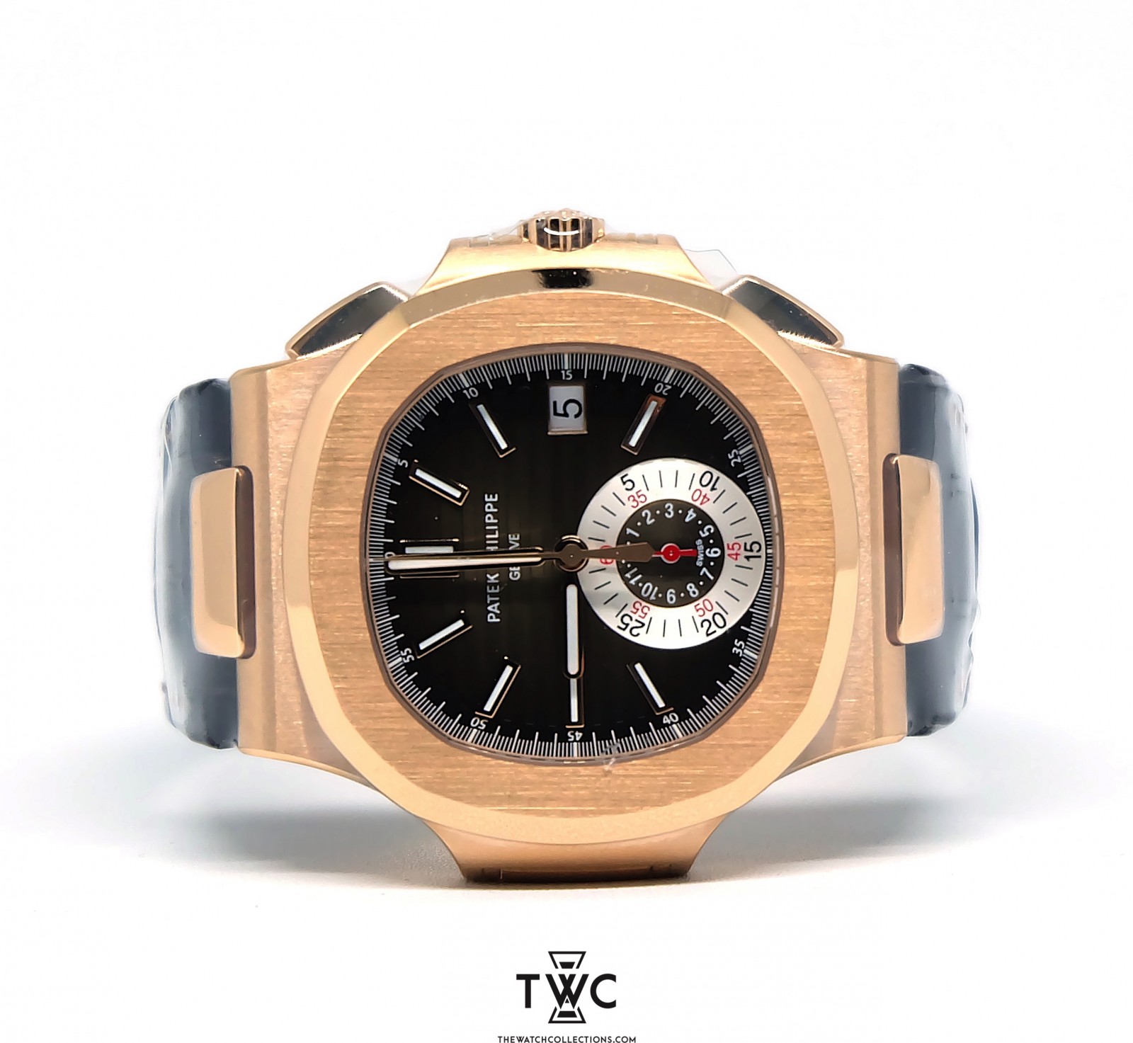 The Patek Philippe Nautilus Chronograph 5980R features a rose gold case with brown dial and chronograph function. Elegant and prestigious.
