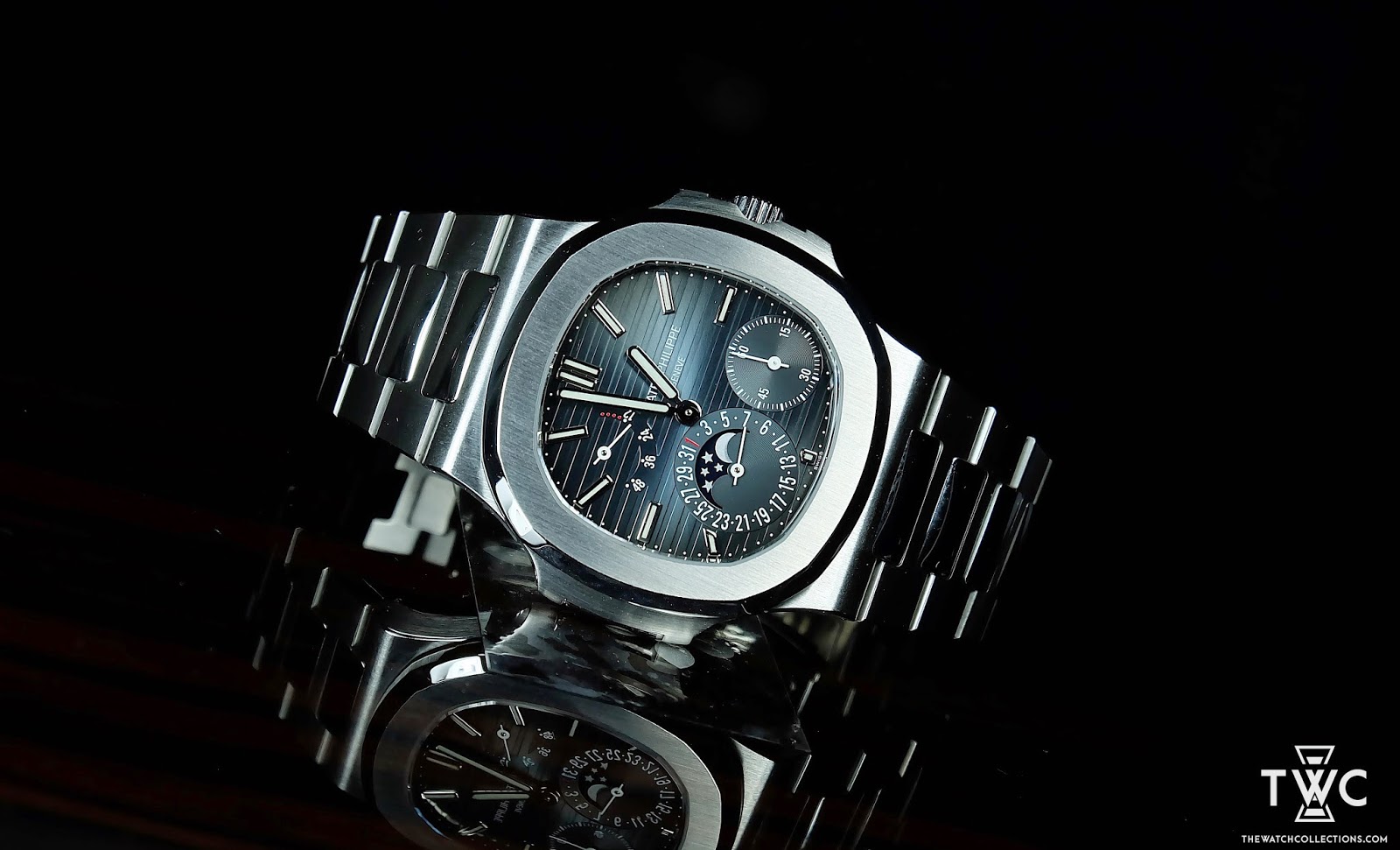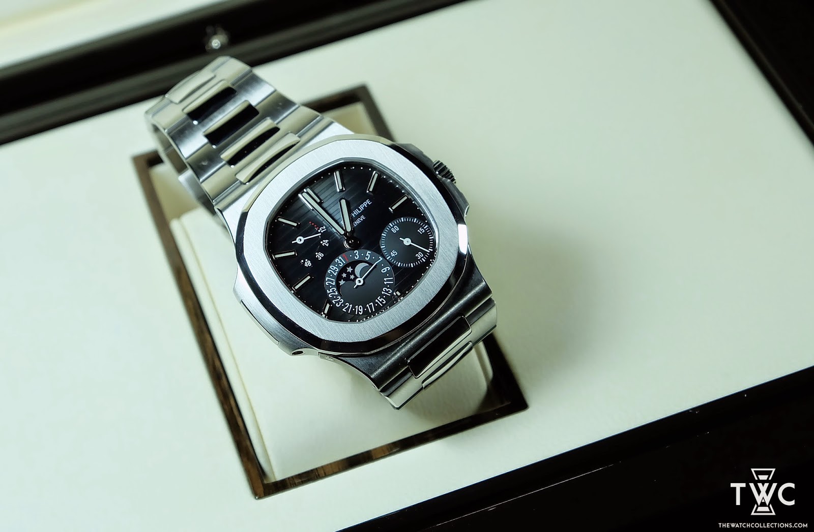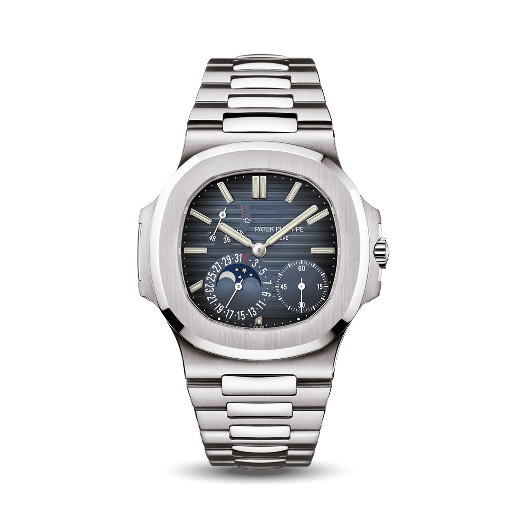 The Patek Philippe Nautilus Moonphase 5712/1A features a stainless steel case with moonphase and date complications. Elegant and highly favored among Nautilus collectors.