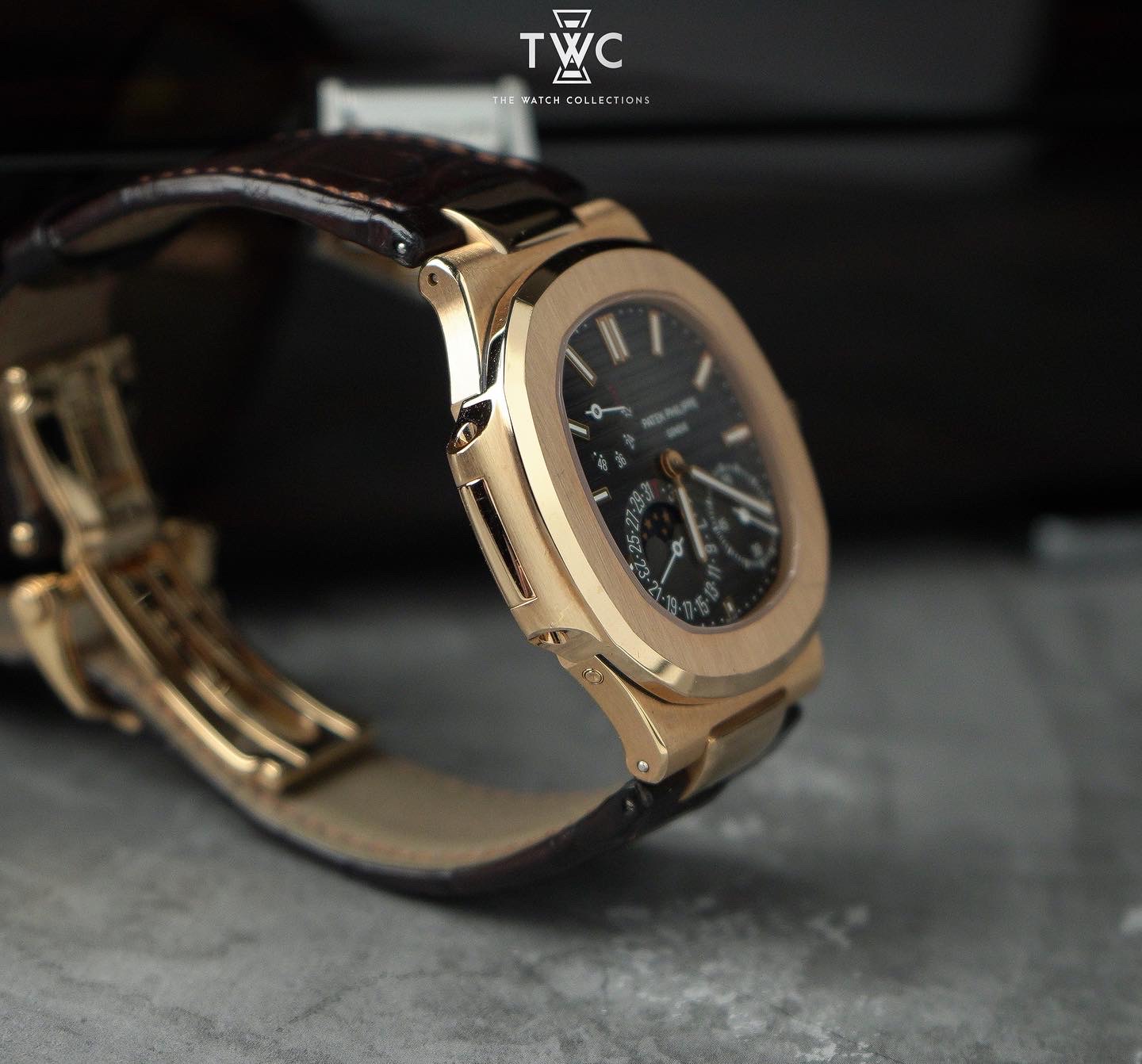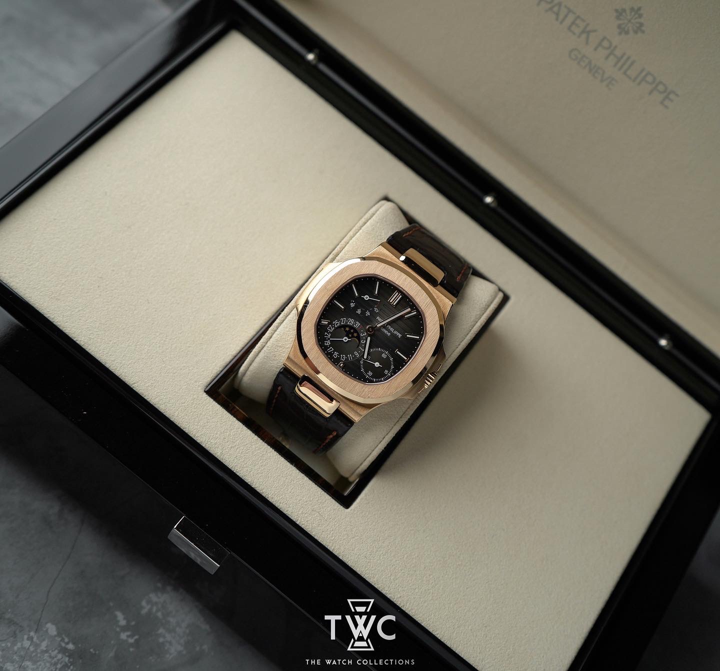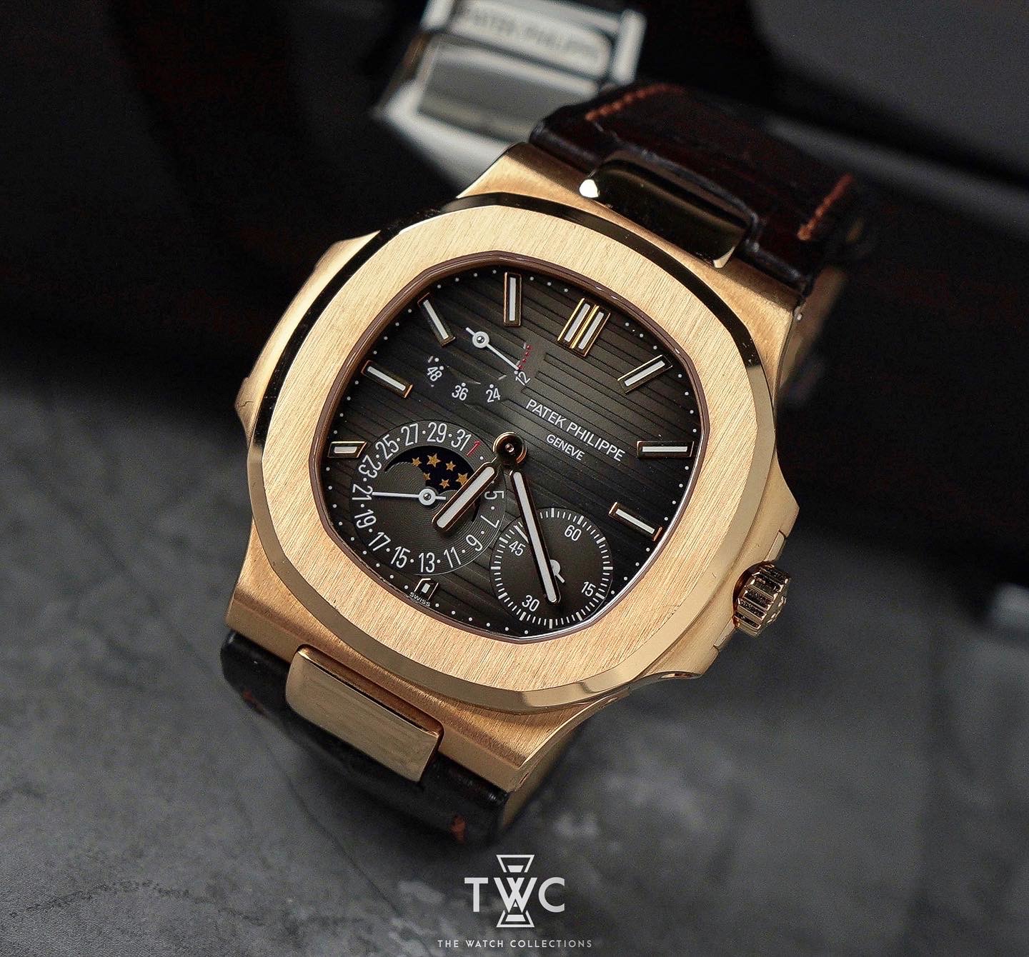 The Patek Philippe Nautilus 5712R features a rose gold case with moonphase and brown dial. Elegant and classic, perfect for luxury collections.