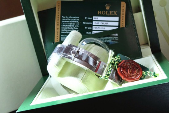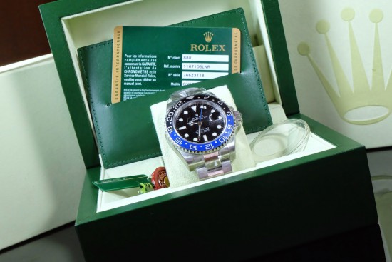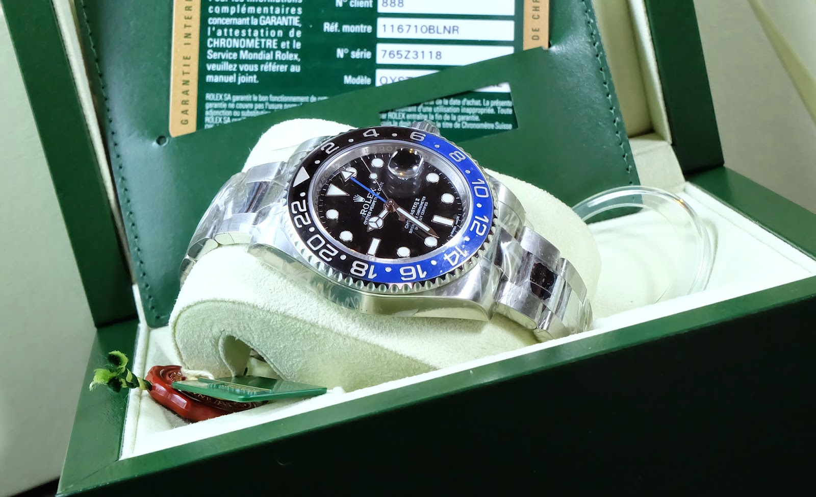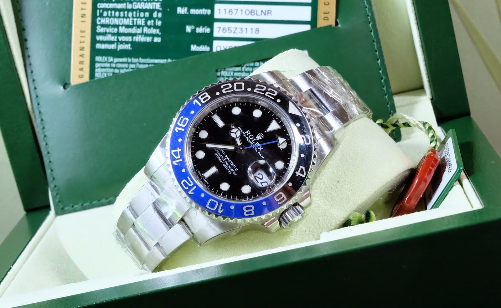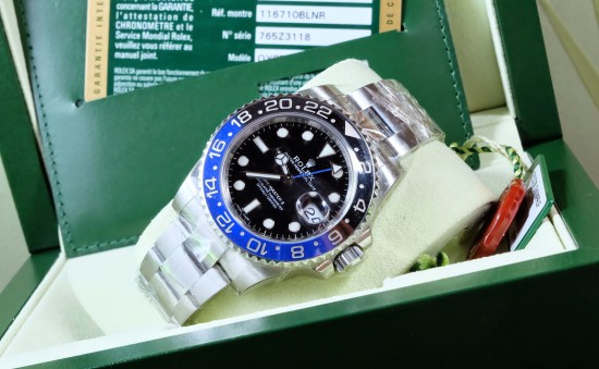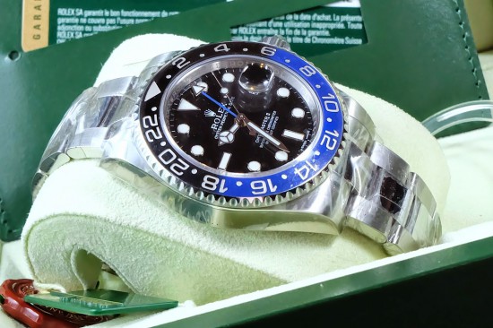 The Rolex GMT-Master II features a stainless steel case with blue-black bezel and GMT function. Ideal for travelers needing dual time zones.