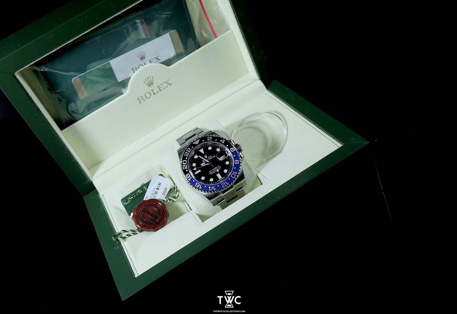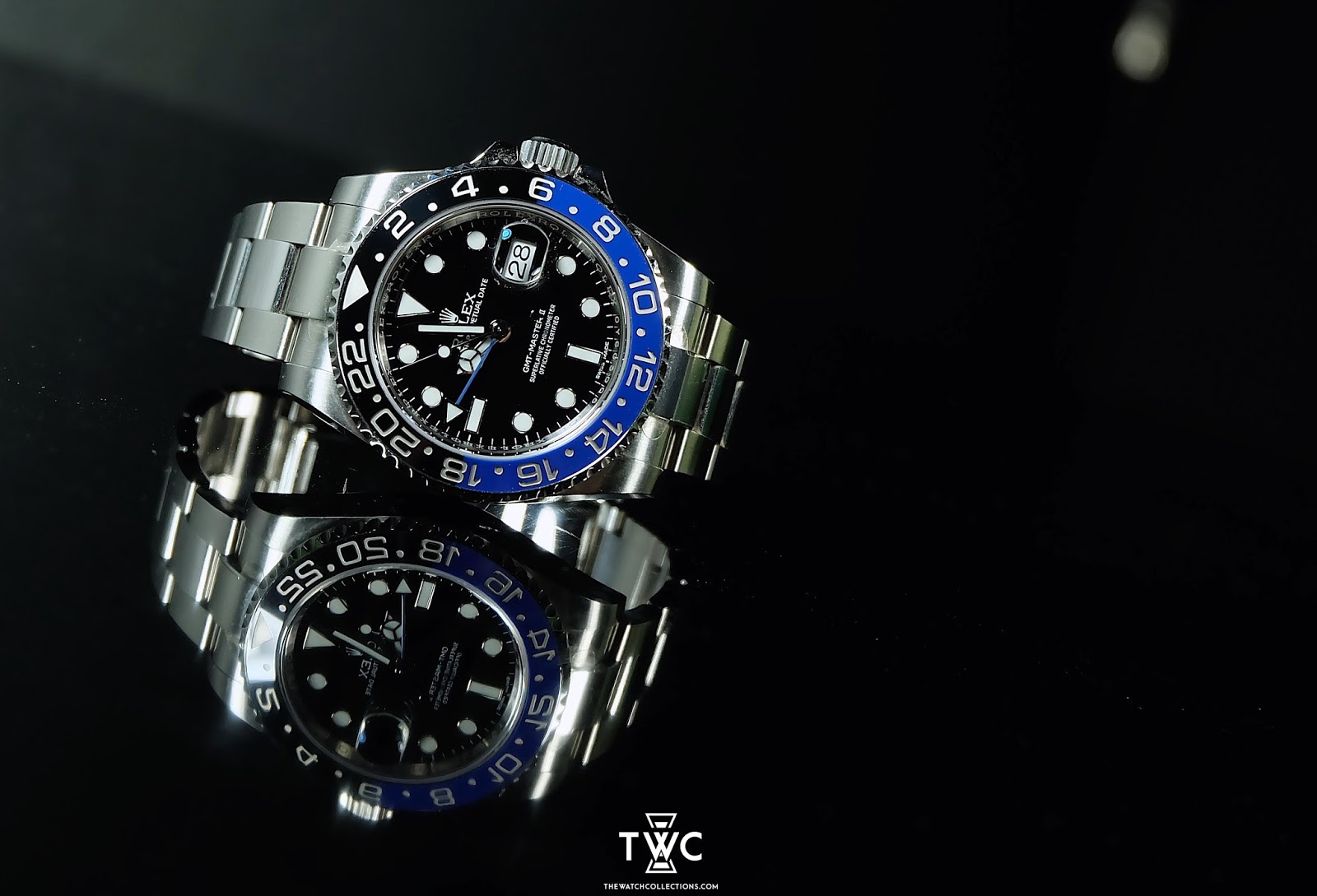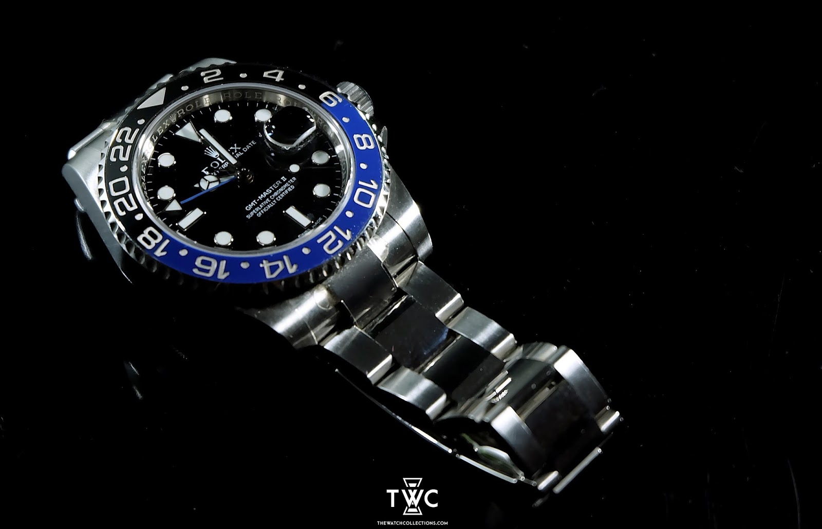 The Rolex GMT-Master II features a stainless steel case with blue-black bezel and black dial. Ideal for international travel.