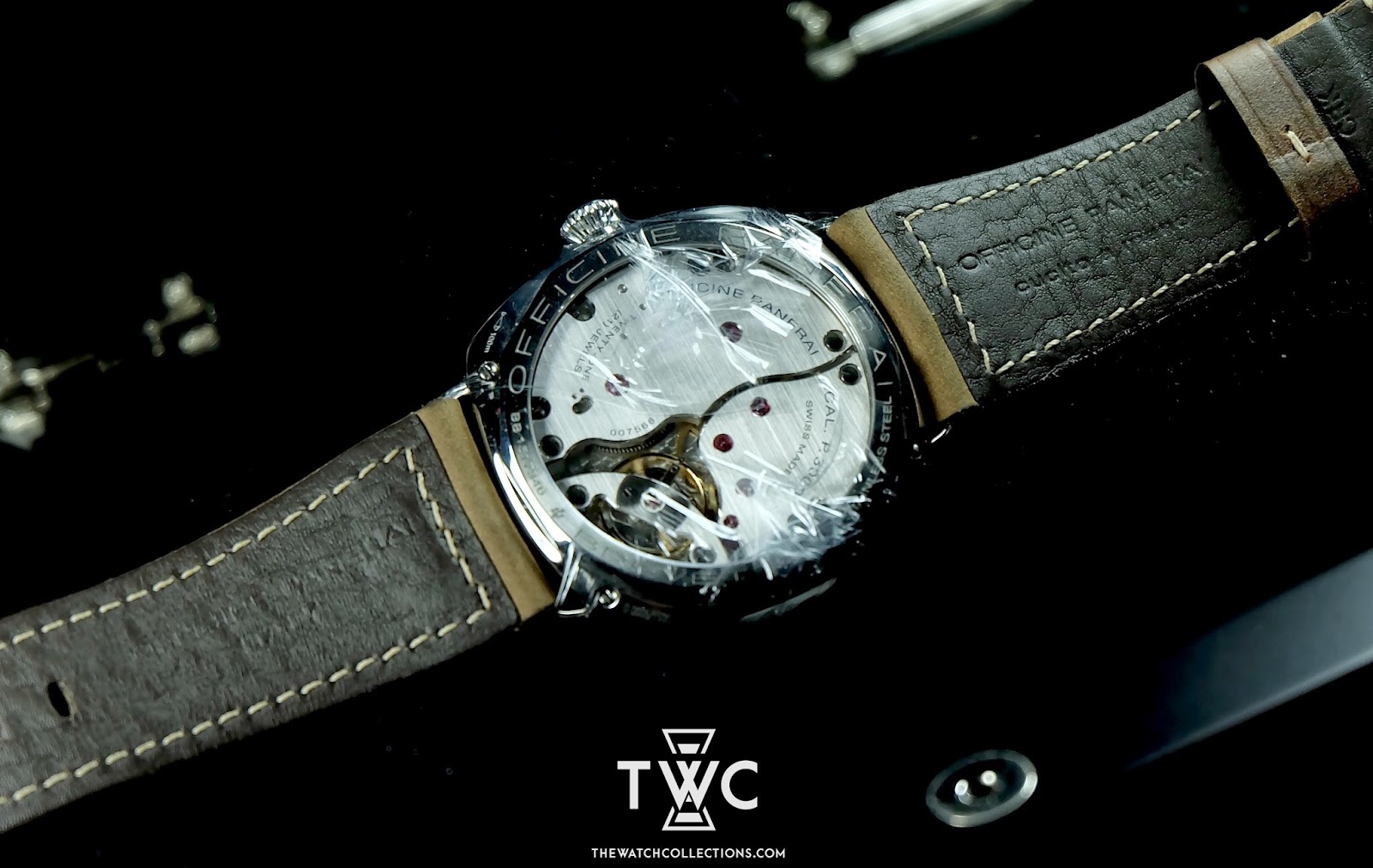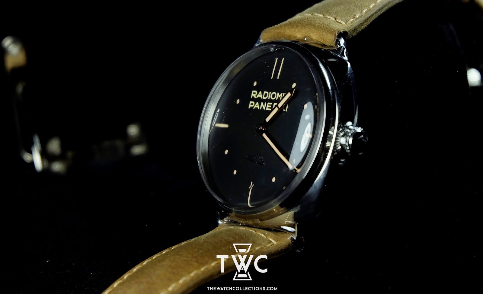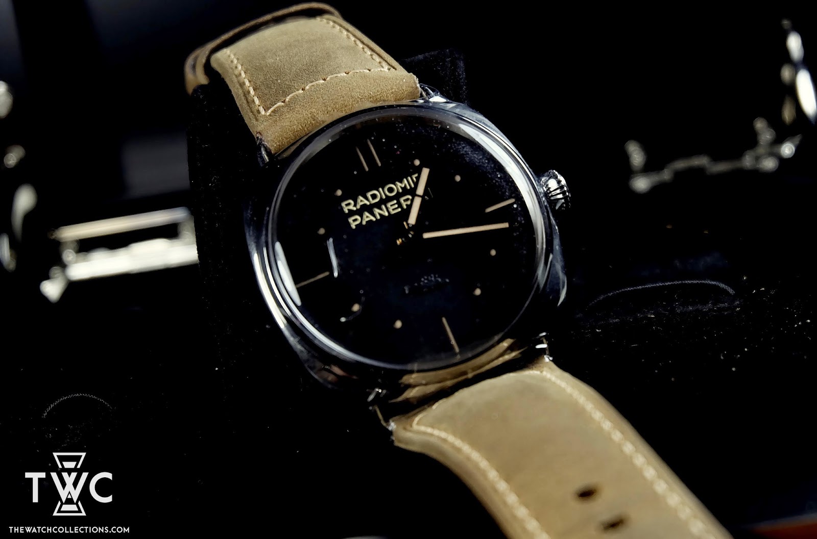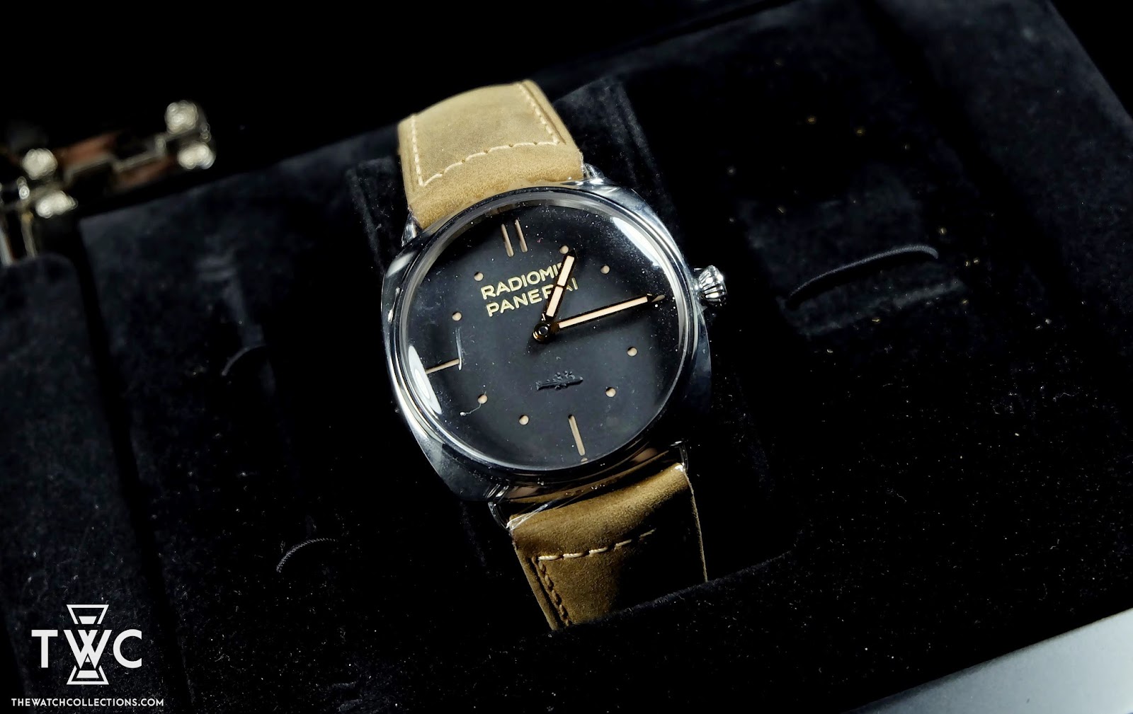 The Panerai Radiomir S.L.C PAM 425 features a 47mm stainless steel case with black dial and leather strap. Masculine and iconic.