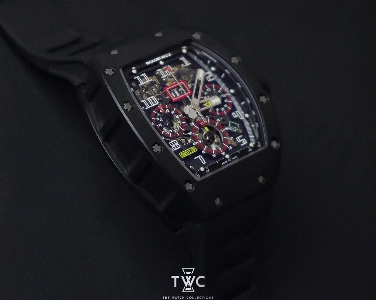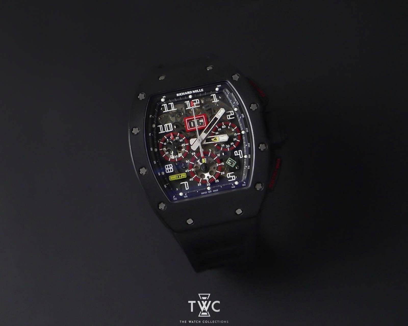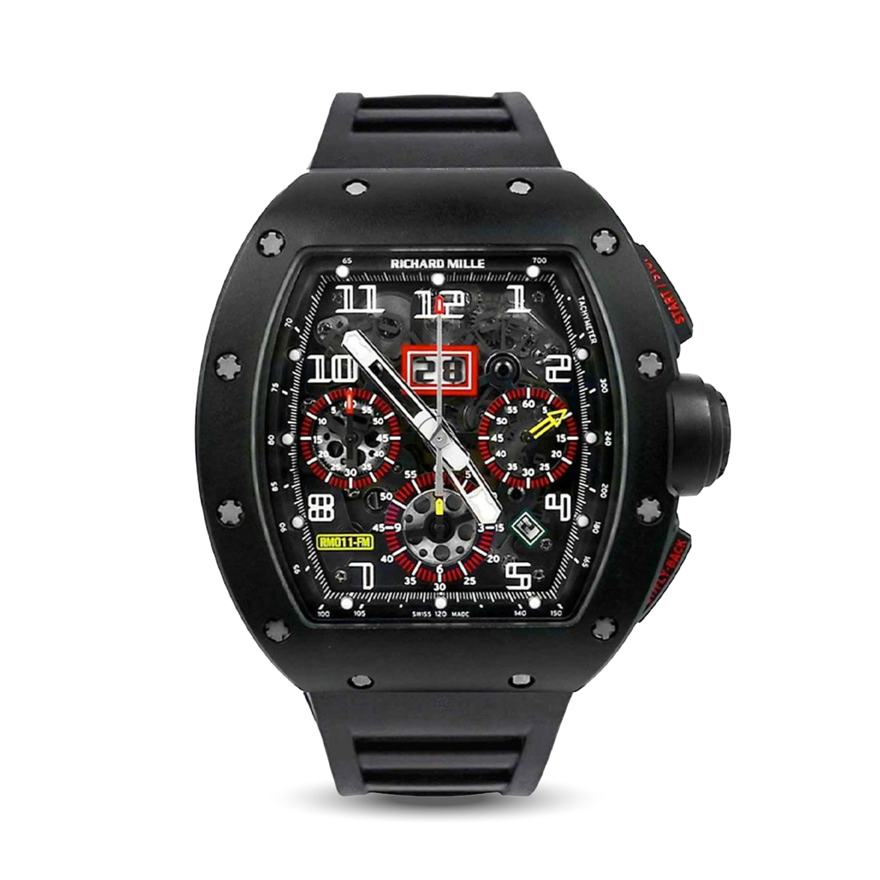 The Richard Mille RM011-FM features a carbon case with skeletonized dial. Lightweight, sporty, and showcases Richard Mille’s technical innovation.