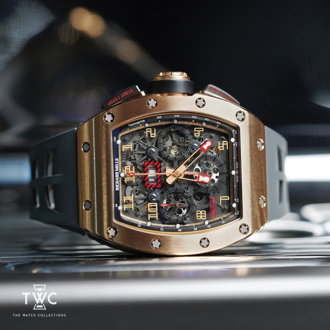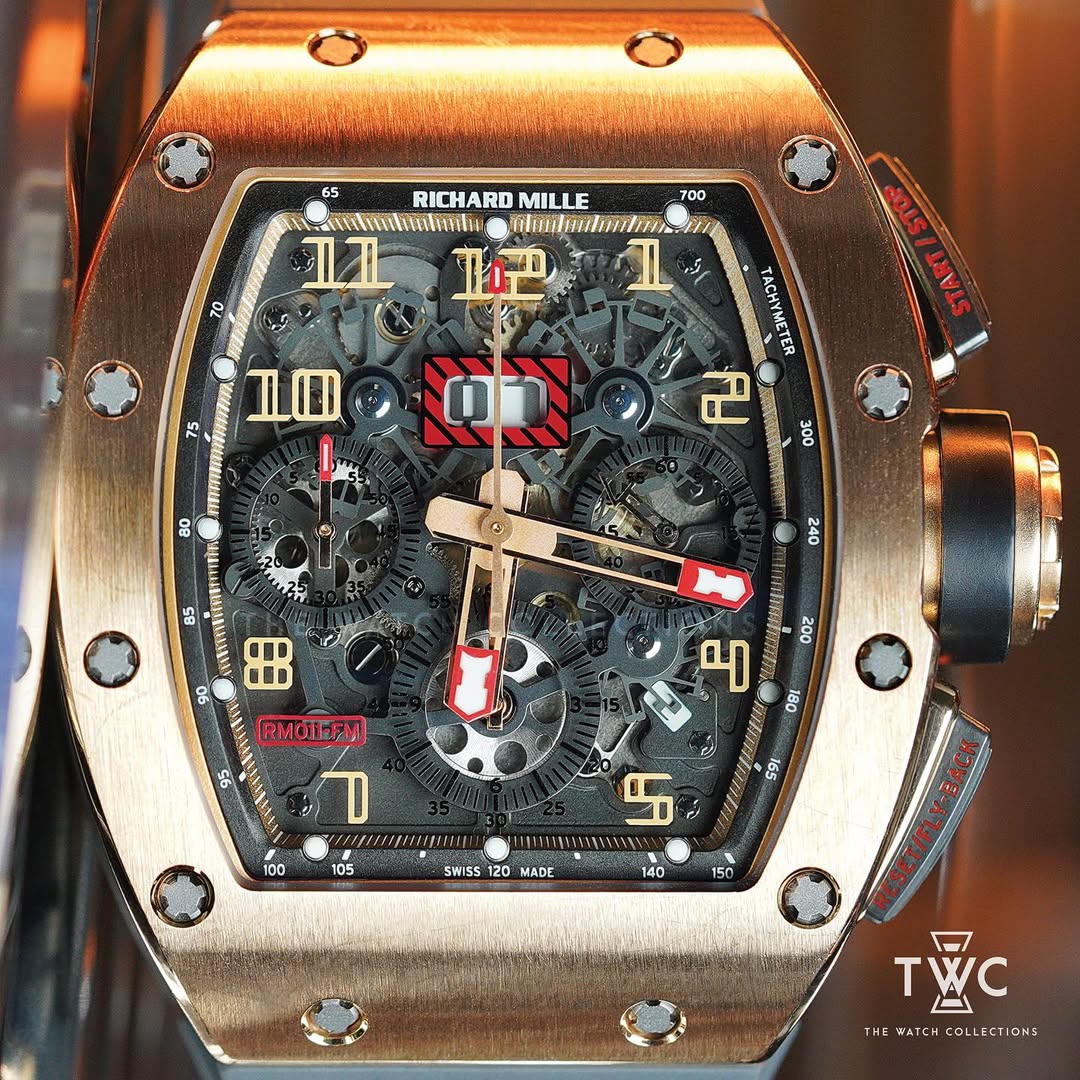 The Richard Mille RM011 Rose Gold ‘Red-Kite’ features a rose gold case with skeleton dial and flyback chronograph function. Limited edition of 30 pieces, highlighting innovation and exclusivity.