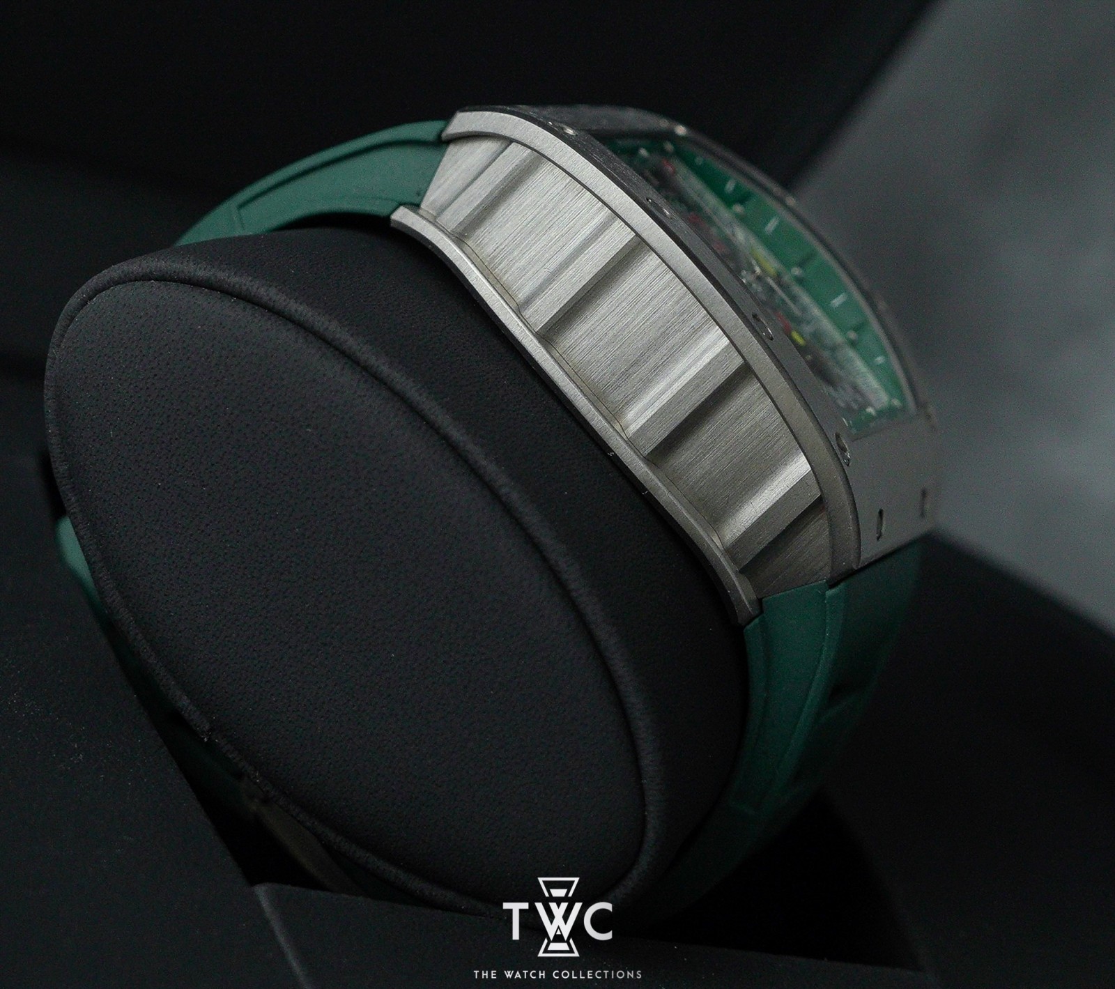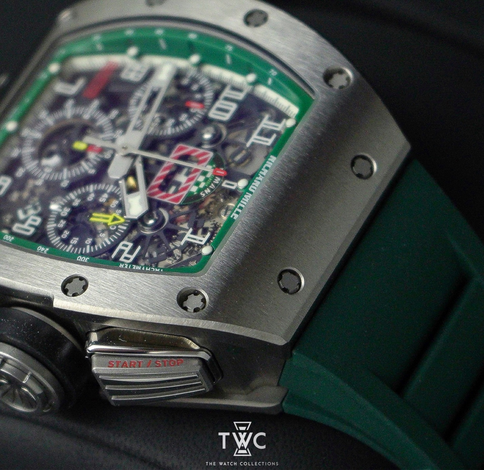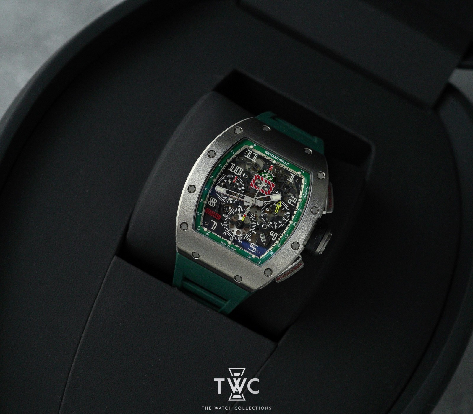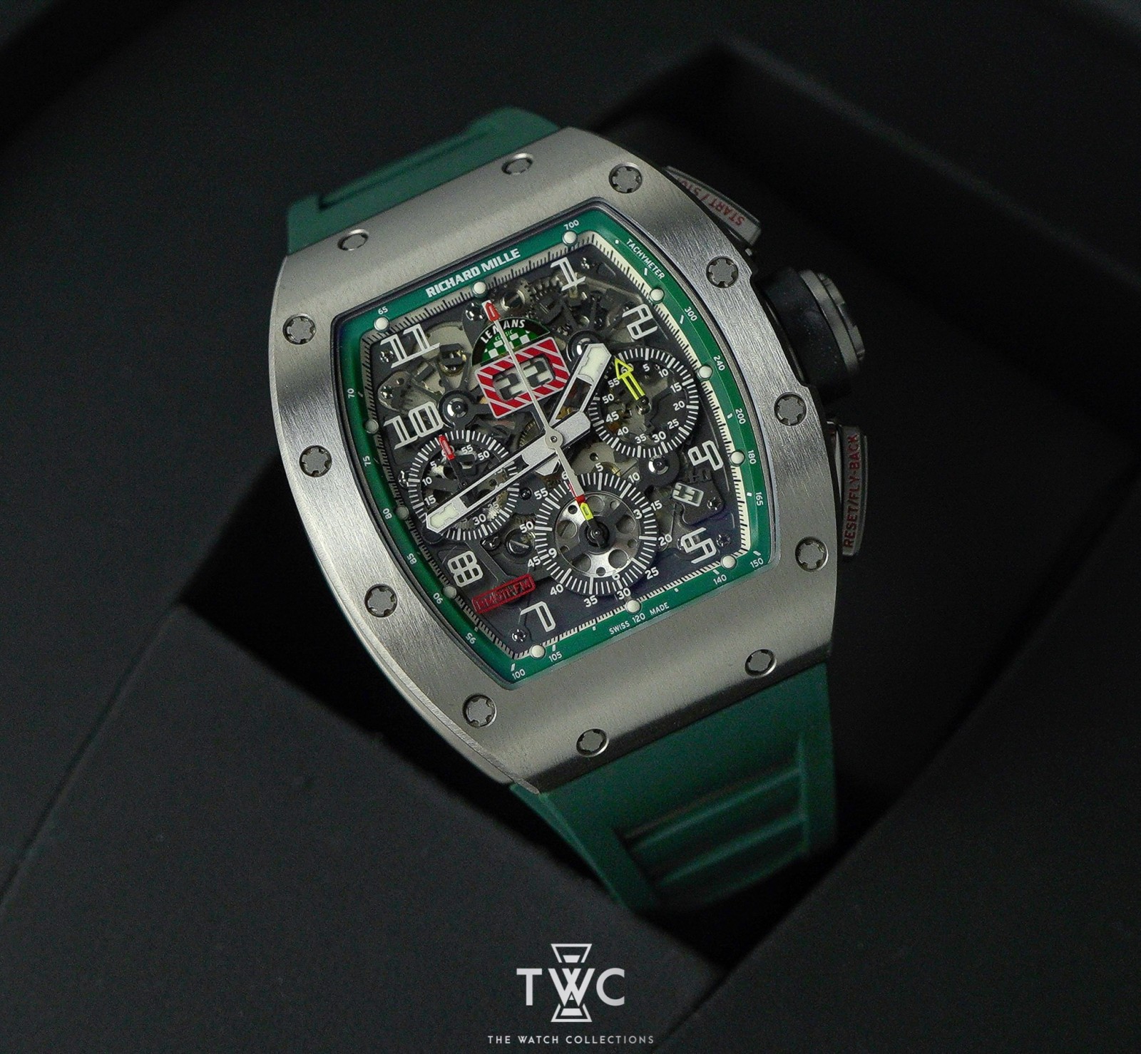 The Richard Mille RM011 Titanium Lemans Limited Edition features a titanium case with skeleton dial and rubber strap. Exclusive collection with sporty design.
