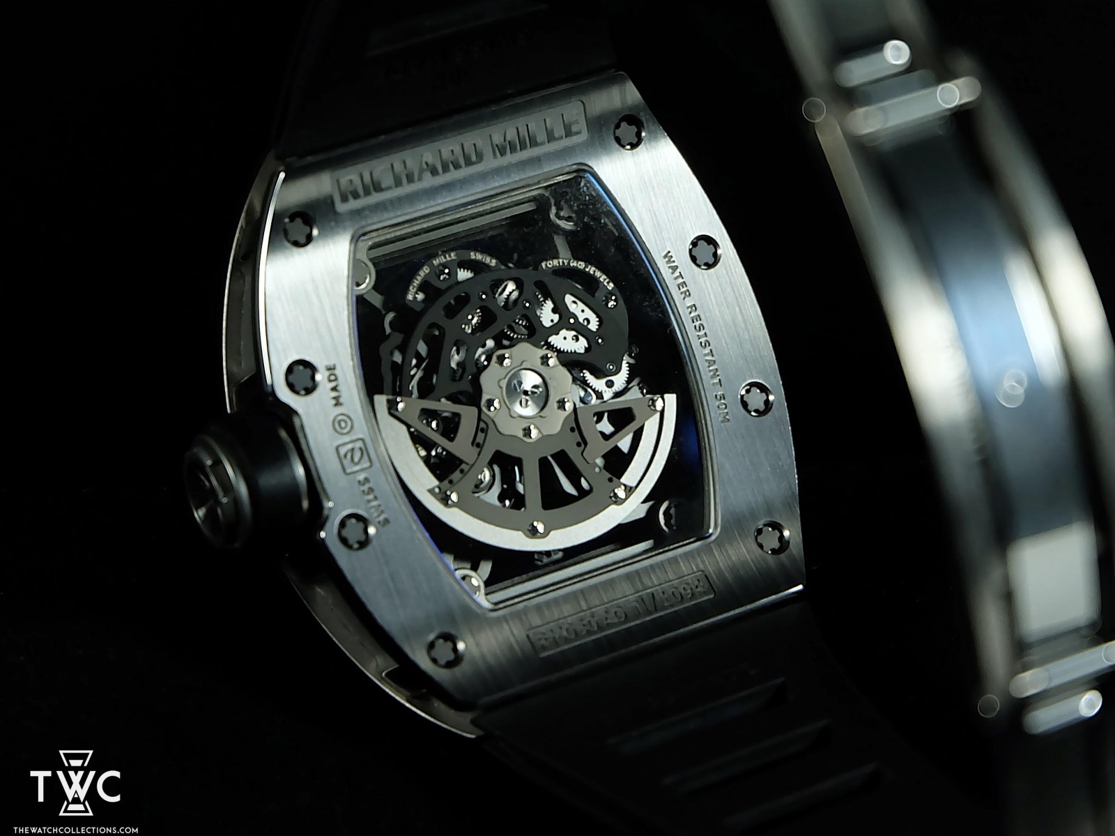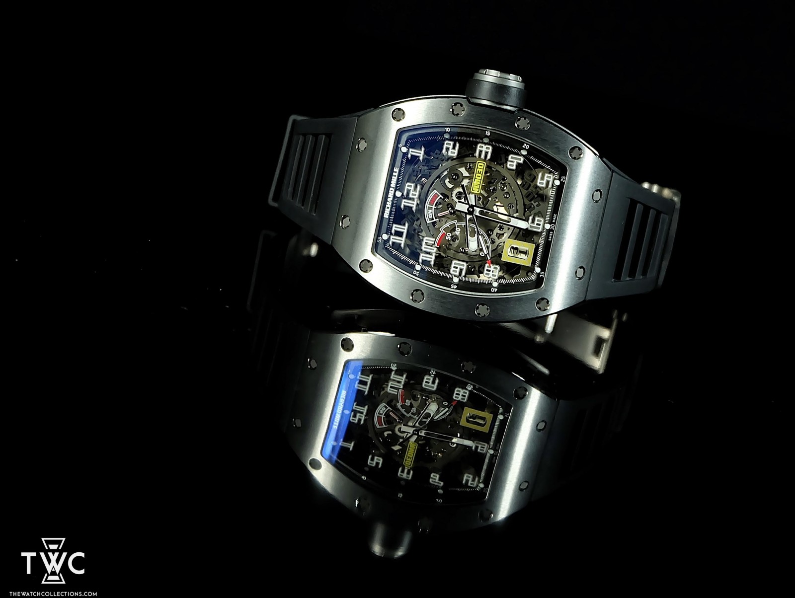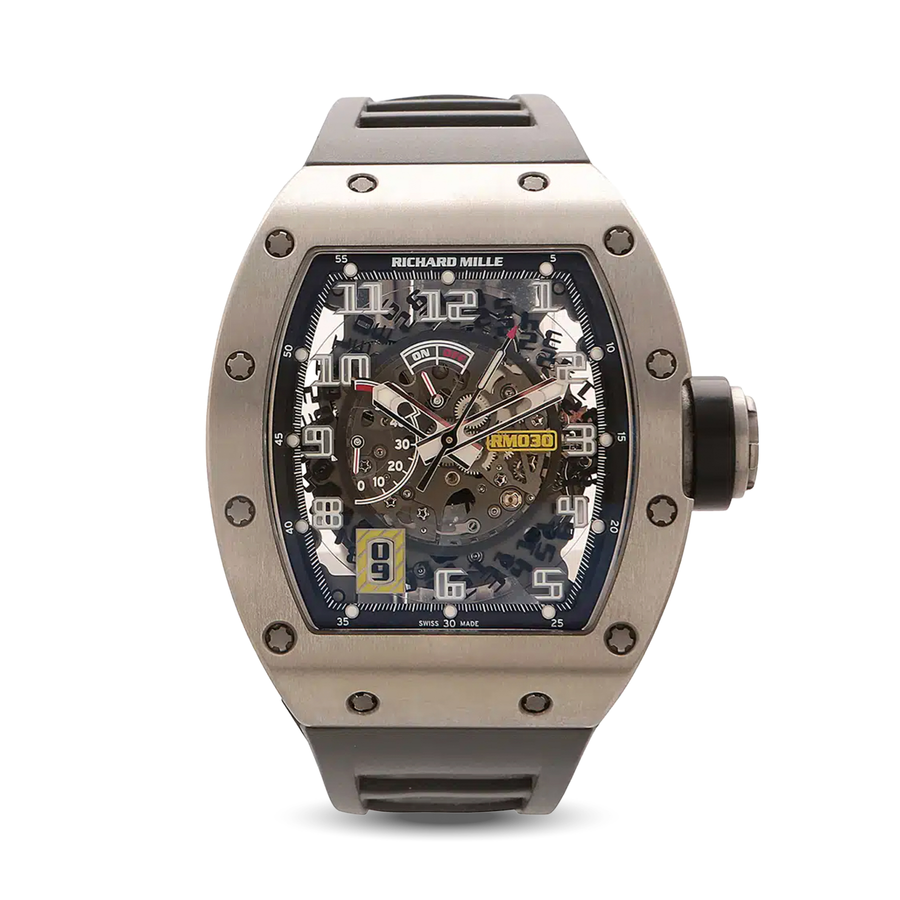 The Richard Mille RM030 Titanium features a titanium case with skeletonized dial. Lightweight, sporty, and showcases Richard Mille’s technical innovation.