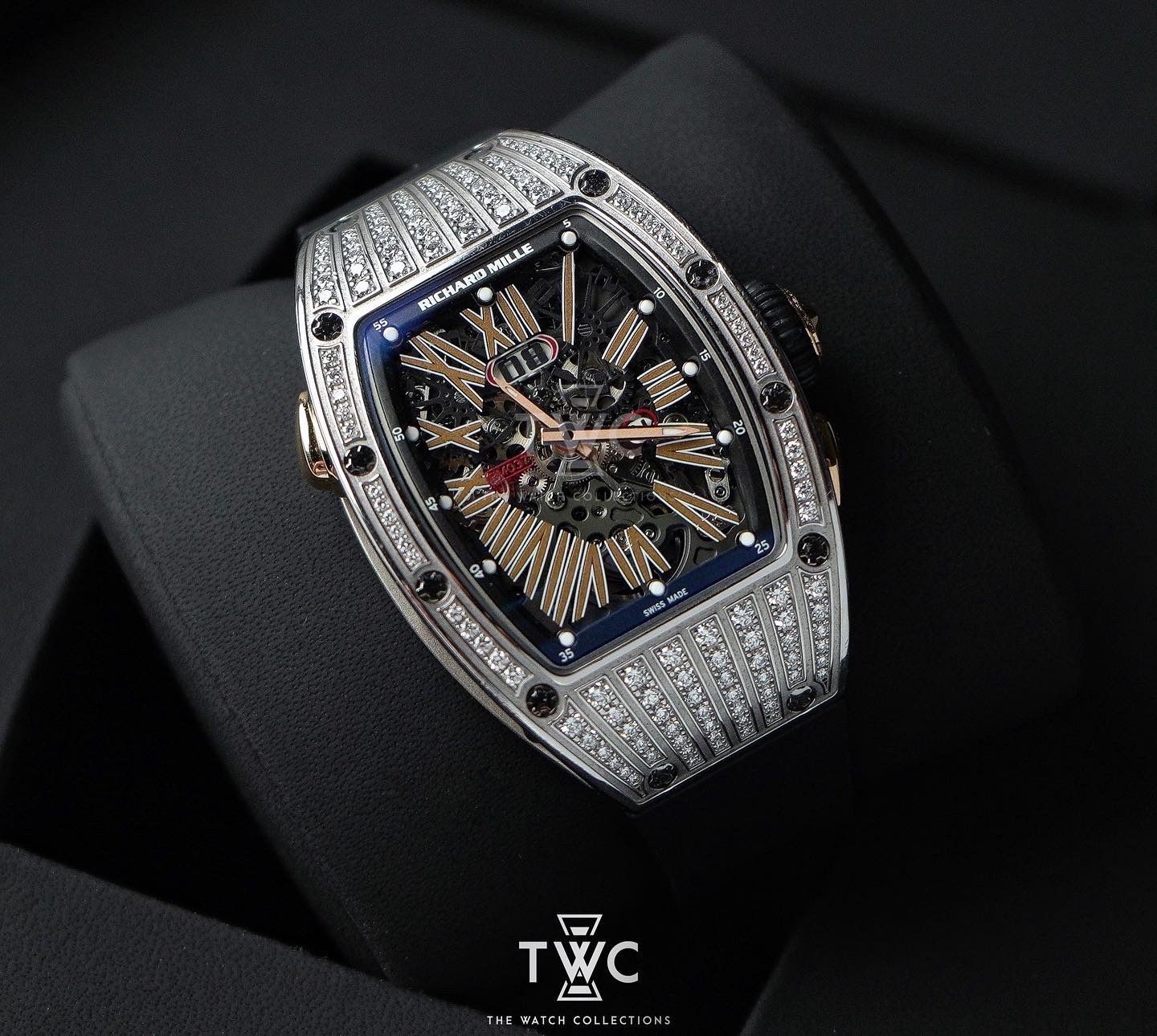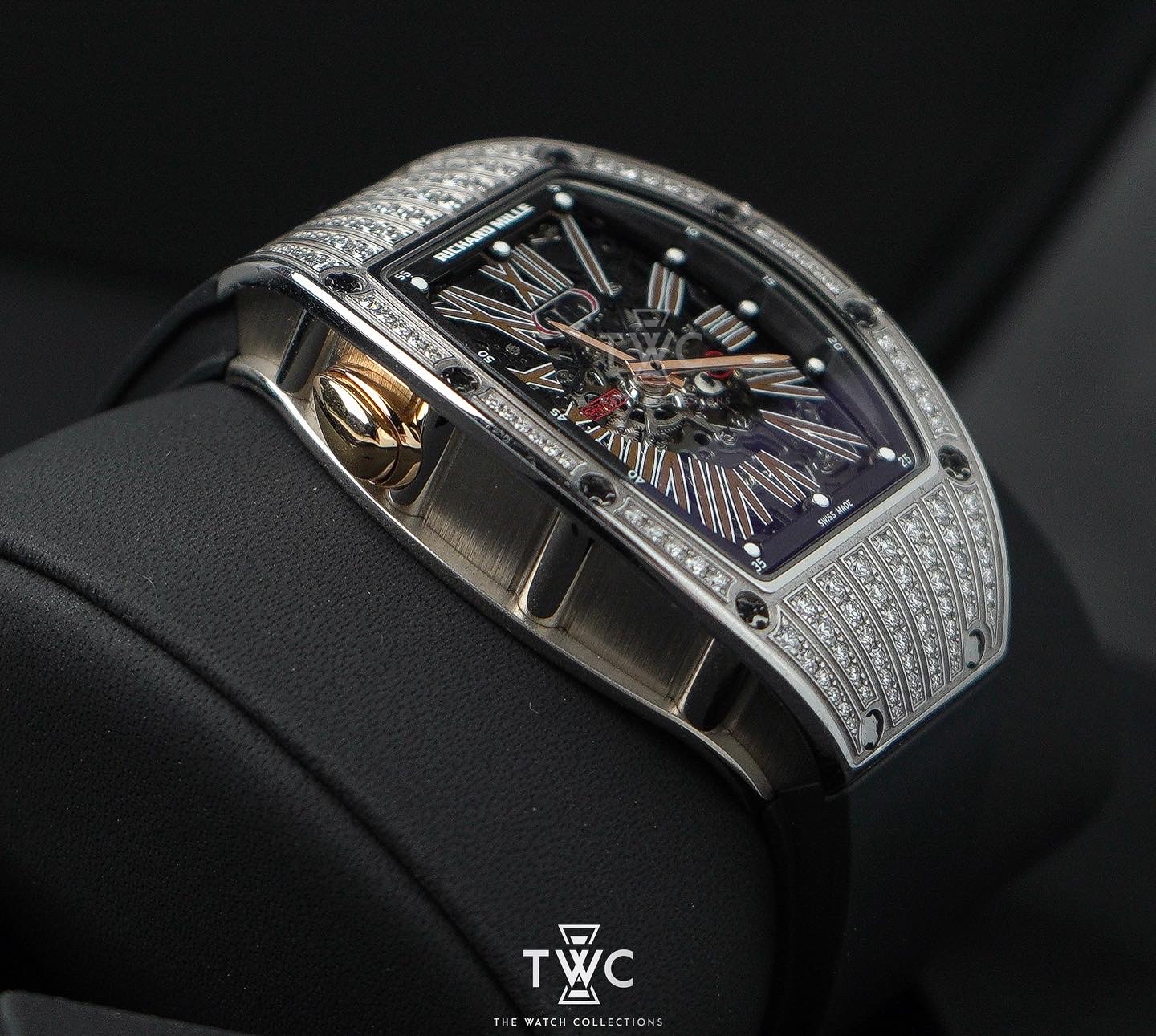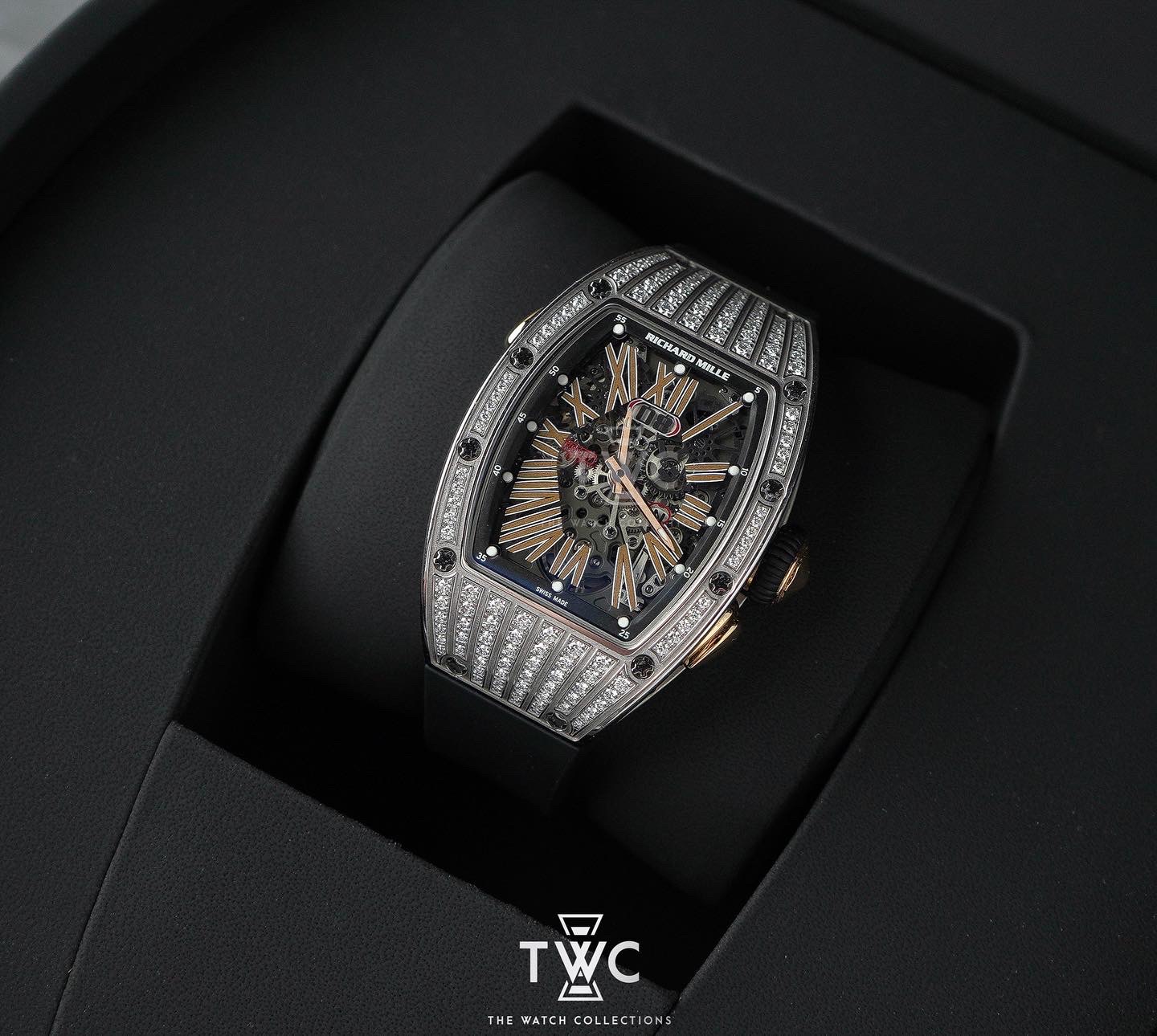 The RM037 White Gold Medset Factory Diamond features a luxurious design with factory-certified diamond bezel. Its 38.7mm white gold case pairs with a white dial with Arabic numerals under sapphire crystal. Powered by the RM037 automatic movement with 50-hour power reserve, it ensures precision and comfort, while the white rubber strap with white gold pin buckle offers a sporty yet elegant finish.