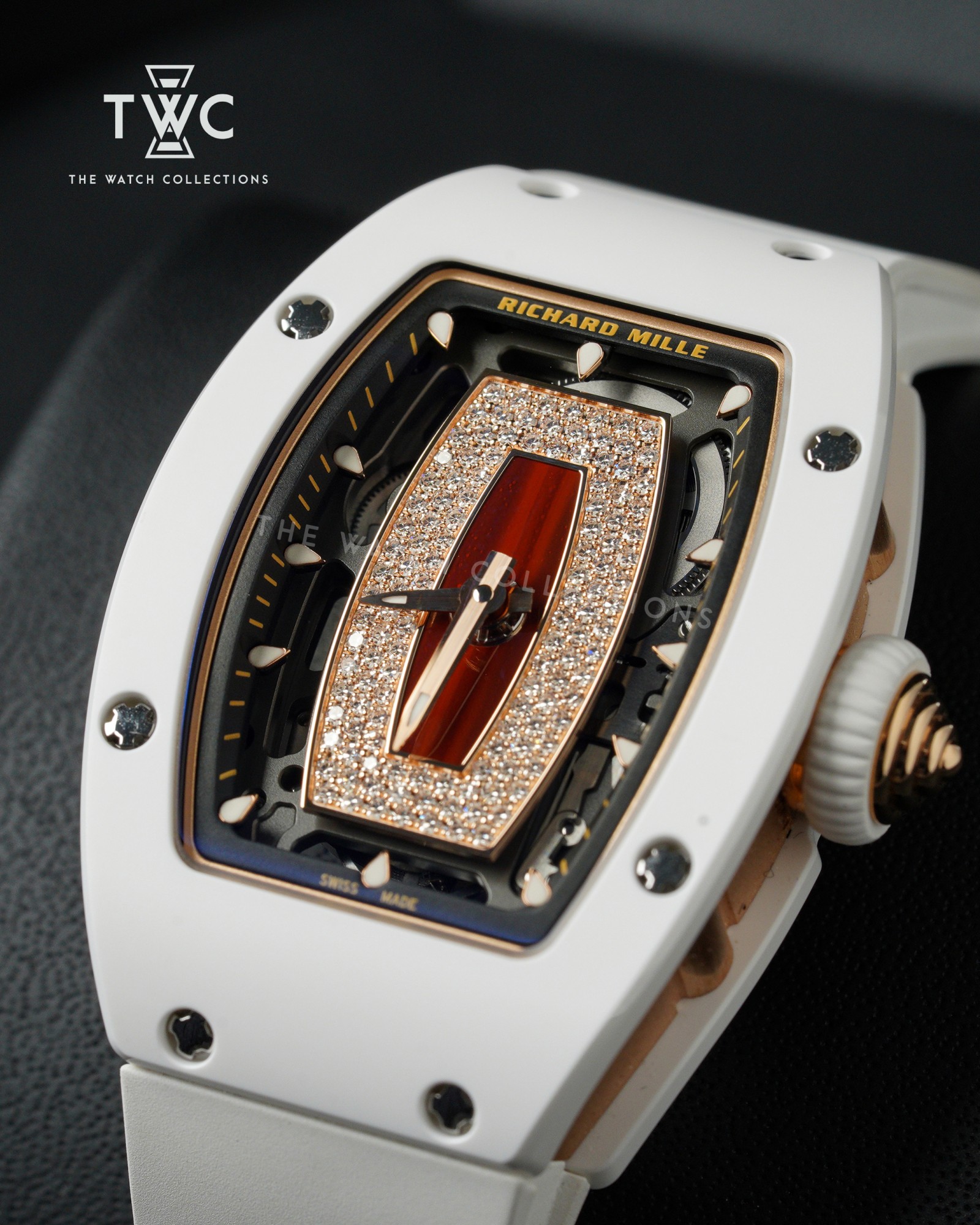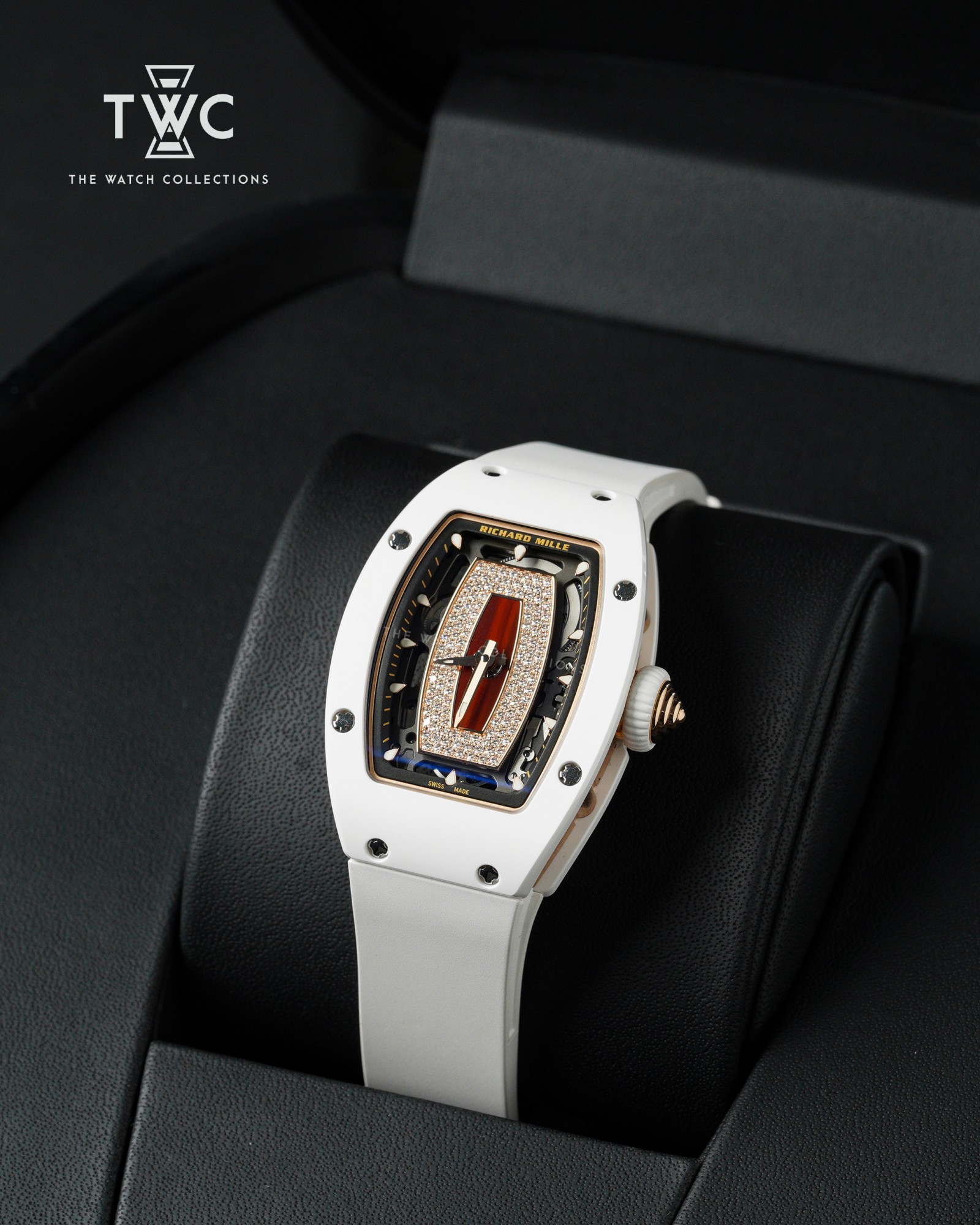 The Richard Mille RM07-01 Ceramic Jasper “Red Lips” showcases Richard Mille’s artistic approach in an elegant sporty ladies’ timepiece. Its ceramic case is paired with a unique jasper stone dial, making each watch visually one of a kind. The iconic tonneau-shaped case houses an in-house automatic movement known for its lightness and precision. This model is highly sought after for its bold aesthetics, advanced engineering, and strong collectability.