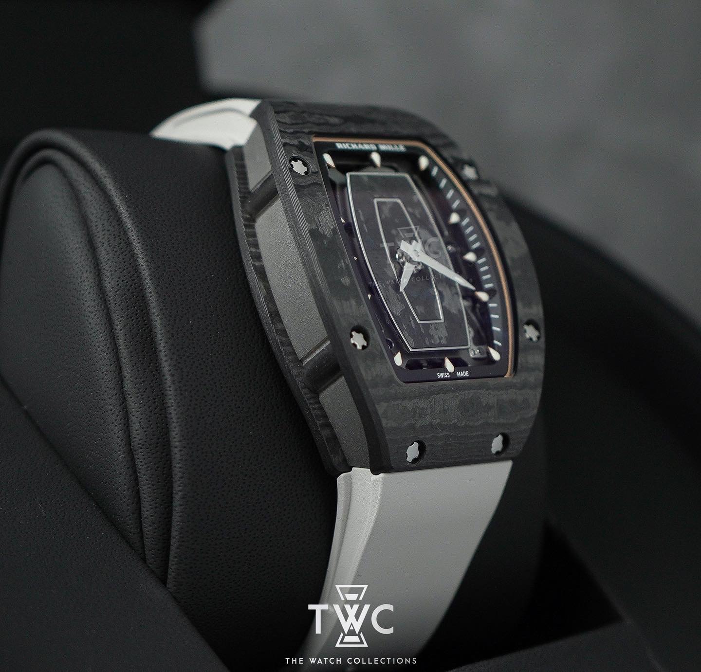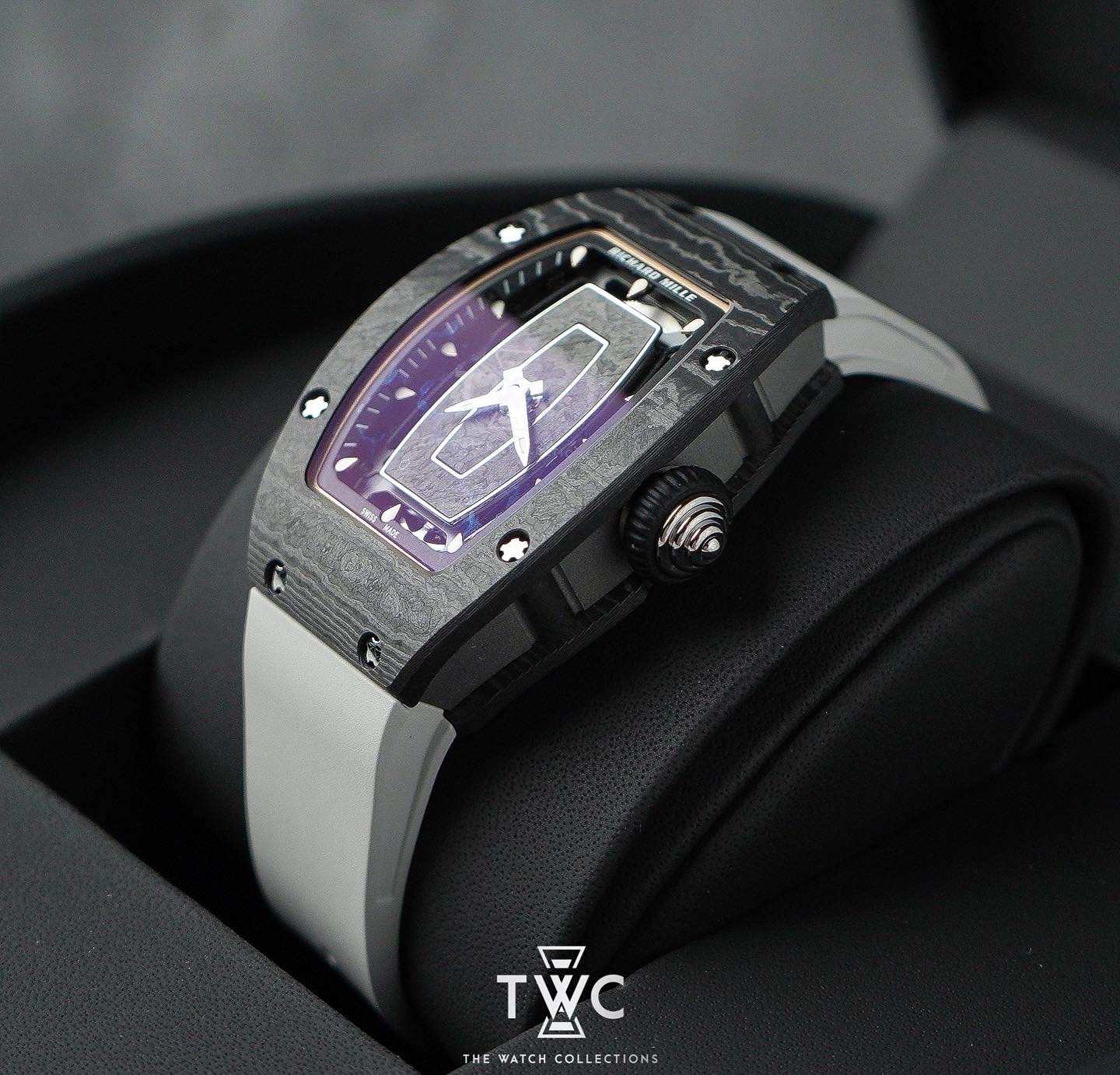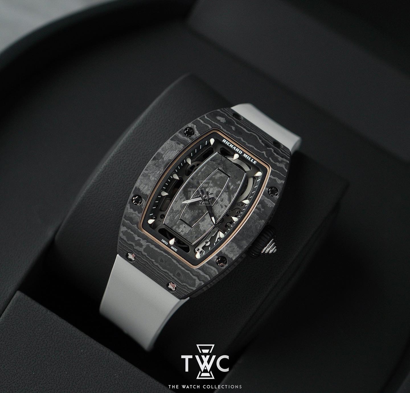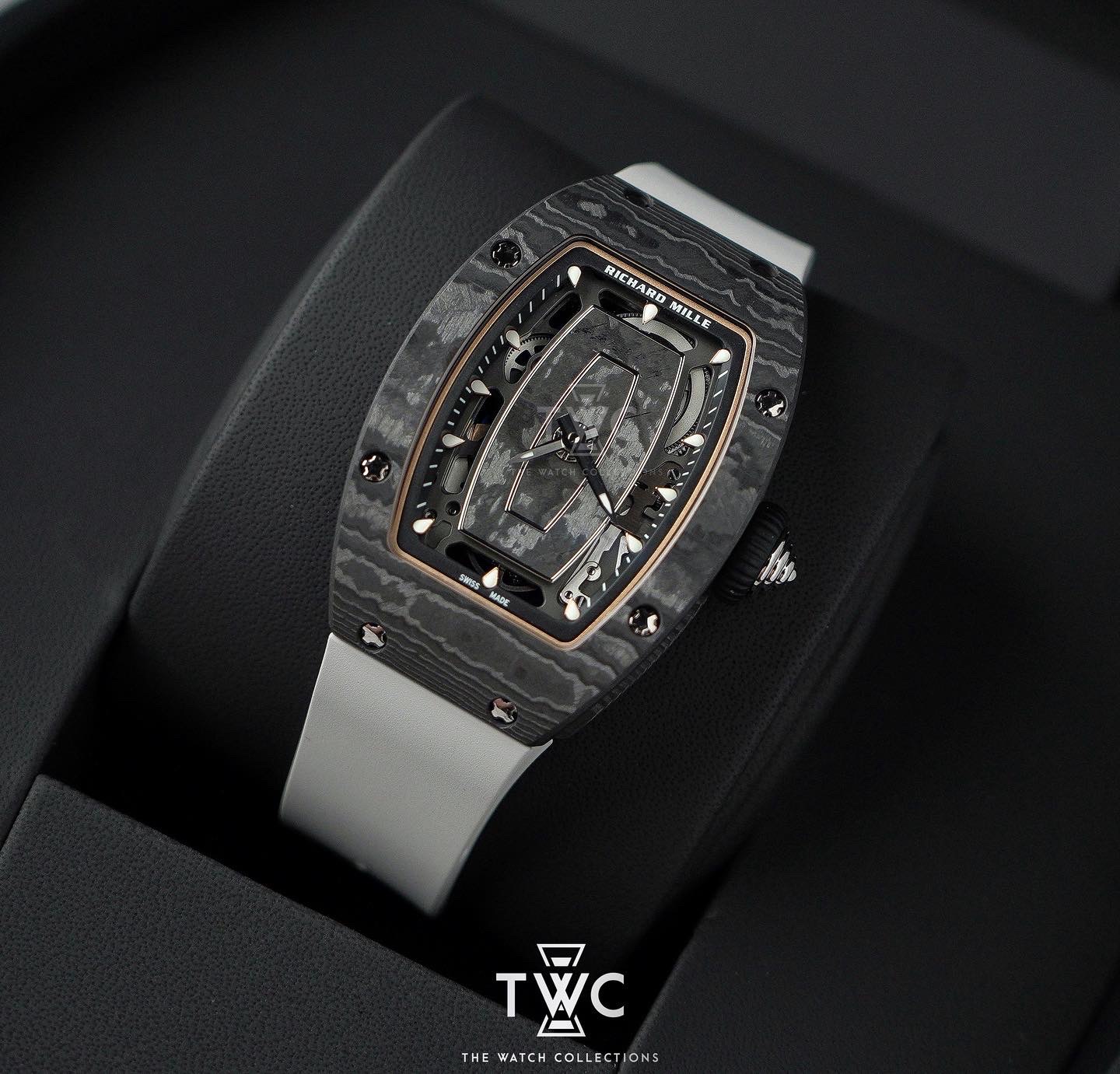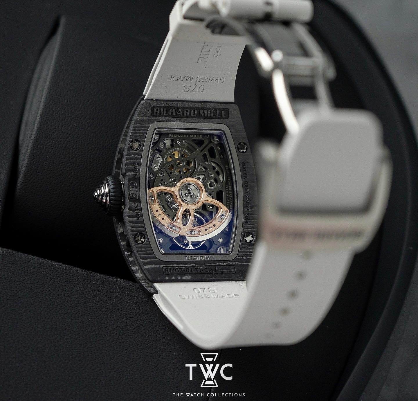The Richard Mille RM07-01 NTPT is a sporty-modern timepiece featuring the brand’s signature lightweight and technical skeleton design. Its NTPT carbon case offers exceptional strength while remaining extremely light on the wrist. The openworked dial highlights the mechanical architecture with a futuristic aesthetic. Designed with elegant proportions, this model is tailored for refined feminine wear.